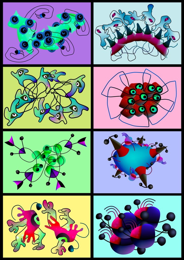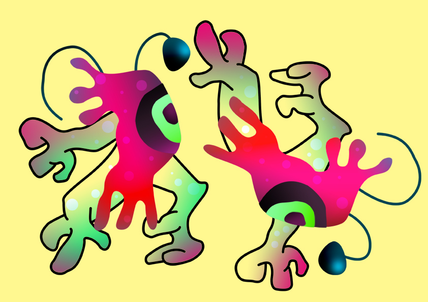 Tom: At the moment the characters are occupying these infinite nebulas with very little sense of depth and space. Even when producing the last two images it’s been somewhat tricky to figure where things should be placed in relation to each other, or how big they should be, or how many there should be. The good thing is these sorts of ponderings are starting to define the world I eventually need to build. I do have some ideas floating around, so once all the initial assets have been made, I’ll be able to play around with the finished stuff – like toys – and get a better sense of what it is all going to be.