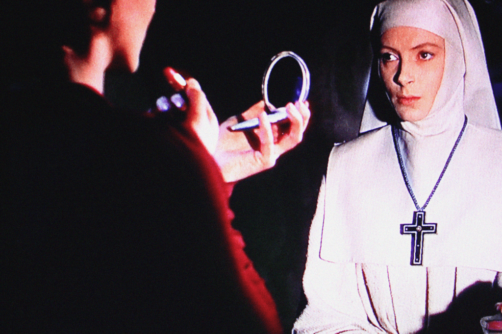 But I’m not imagining it. Sexualised imagery is everywhere in this film. It’s on the walls of the old palace in the form of frescos depicting the voluptuous forms of the prostitutes who once inhabited its chambers. Every now and then, the camera will cut to one of these paintings to remind us of the inadequacy and folly of repression, these curvaceous painted ladies looking on at the nuns’ histrionics with what we take to be great amusement. There are naked statues too, which the nuns cover with dust-sheets, but as Sister Ruth runs gleefully from the palace to be with the object of her desire, we see one of these statues drop its veil completely. By this point in the story, everything else is slipping too, everything else is being laid bare.