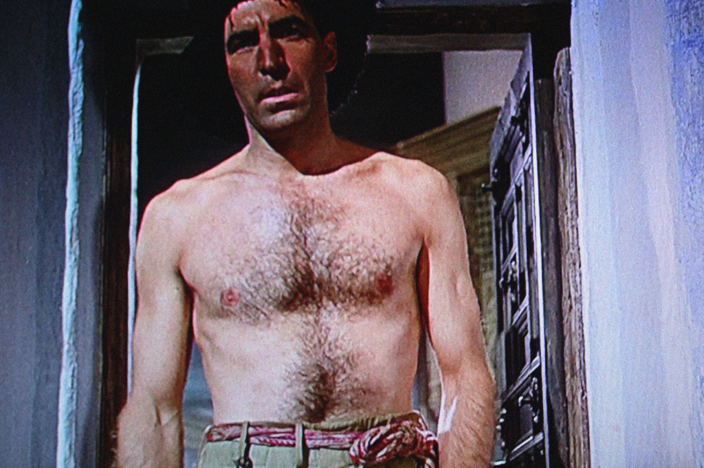 It would be revisionism on my part to suggest with any authority that this film ‘spoke to me’ as a gay man before I knew I was a gay man. To be honest, the film never makes me identify with the suffering of the characters, but with their longing, which isn’t quite the same thing. I can always feel the huge effort it must be taking those nuns to ‘not’ look at Mr Dean, who will insist on walking about the former-brothel in the very shortest shorts and with his shirt wide open. The film presents his flesh as spectacle, objectifying him delightfully at every opportunity. Whenever Mr Dean sits himself down, we are required by dint of camera and of framing to look upon his shapely hairy thighs and the furriness of his forearms. His chest hair is thick and showy.