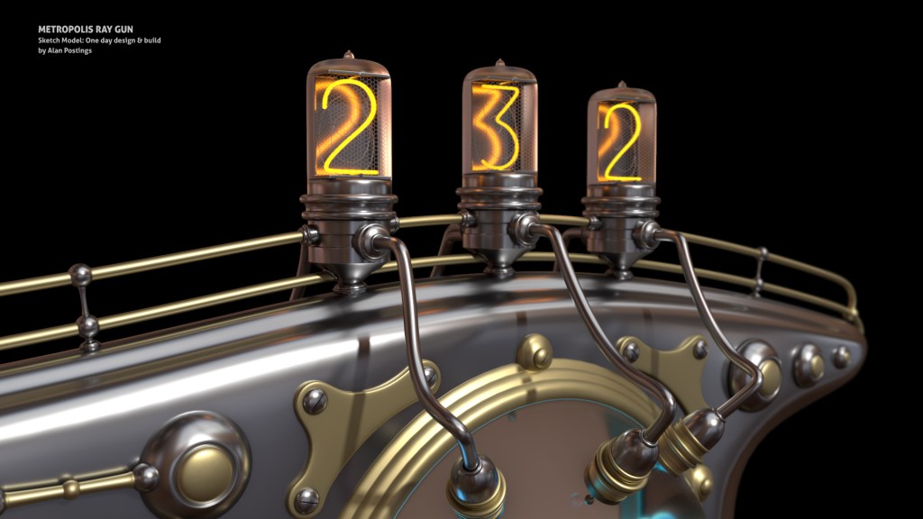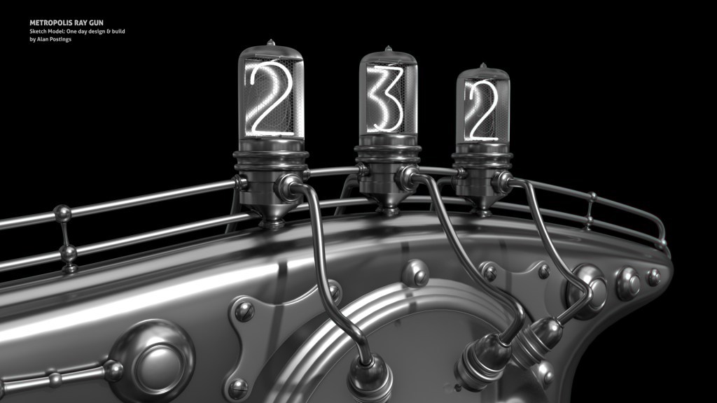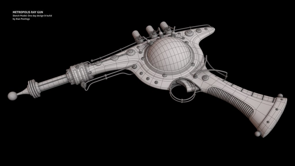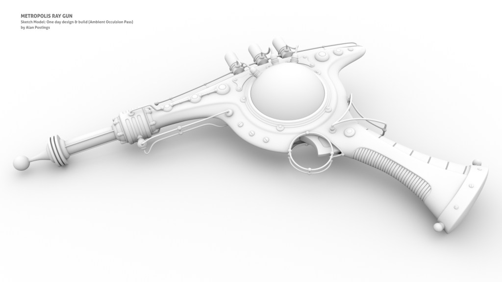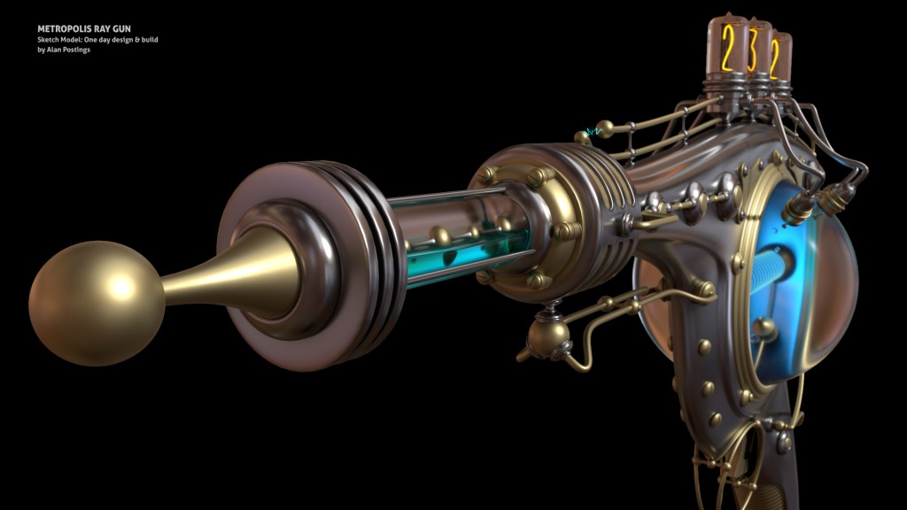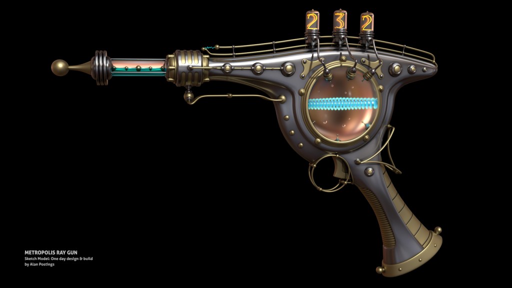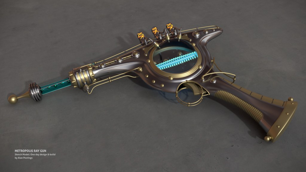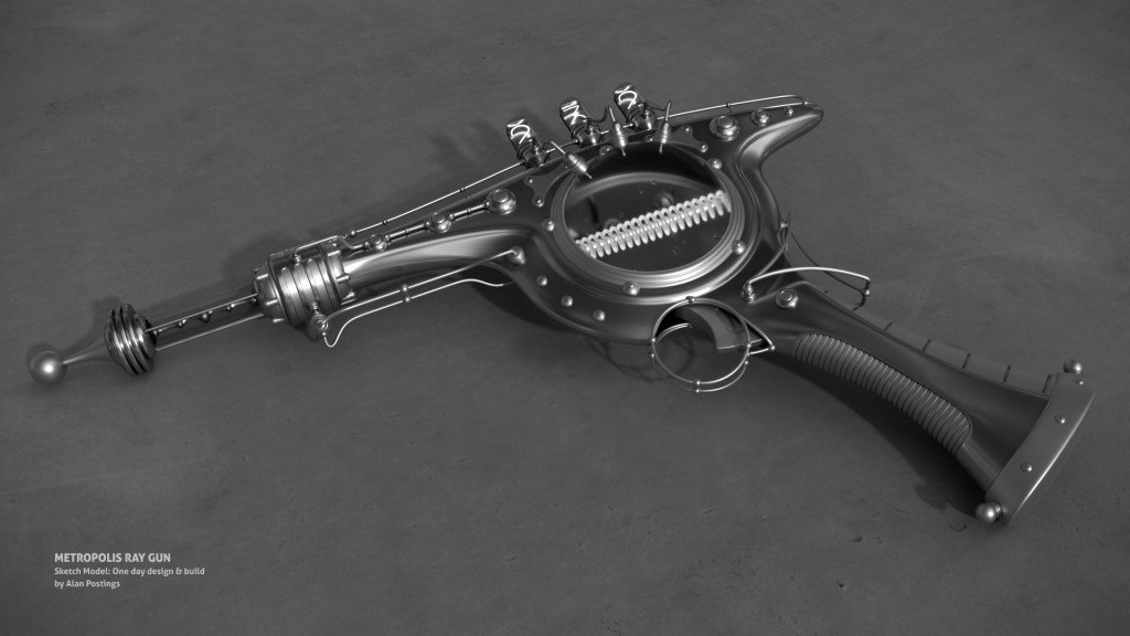 “A ray gun prop inspired by Fritz Lang’s Metropolis created in Autodesk Maya. I set a challenge of a day’s build/design (plus a few hours of edits) and made it up as I went along!”