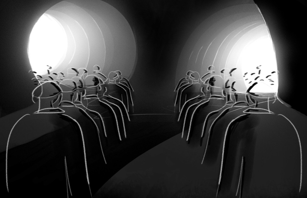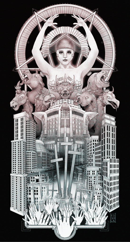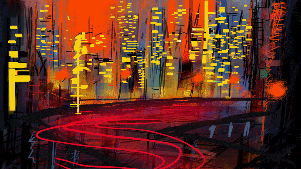 “I wanted to capture the energy and constant movement that encompasses a metropolis, like a long exposure shot caught in an instant with lots of energy in the line-work and brightness in the blinding city lights, I had a go of animating it too, as I want to incorporate such elements into my new animated short so it felt good to get some practice. I also couldn’t help but pay homage to Metropolis by Fritz Lang – it’s one of my favourites! Those harrowing tunnels with the workers heads hung low as they approach the underbelly of the city always stuck with me.”