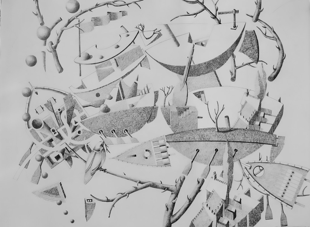 “My prompt was Mother-city; the hub providing settlers to beyond, with the sparrow characterising community and Springtime nest building. The unanchored nature reflects a very common feeling. HB pencil, on Artistico Fabriano 640gsm hot pressed. 77cm x 56cm. These drawings demand 24 hours commitment, as nothing is forward planned, usually reaching completion in 3-5 days.”