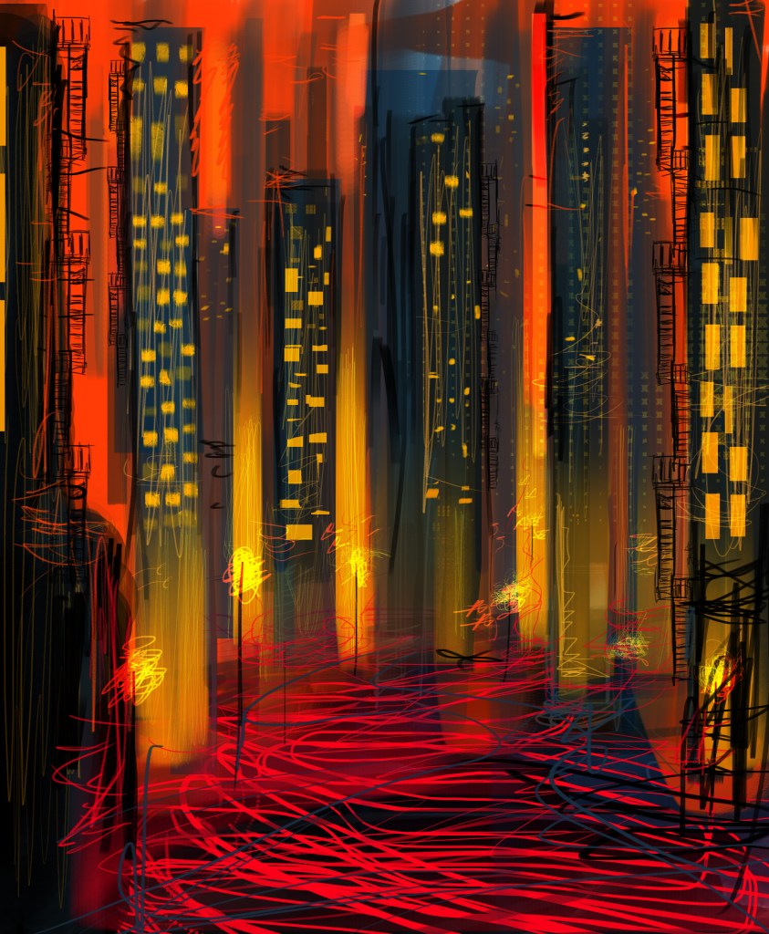 “All I could think of was modernity and buildings, a lot of them. It started as a De Stijl influenced doodle, which then turned into a more constructivist piece and finally a bit more tweaking and ambience. A lot of fun during the process.”