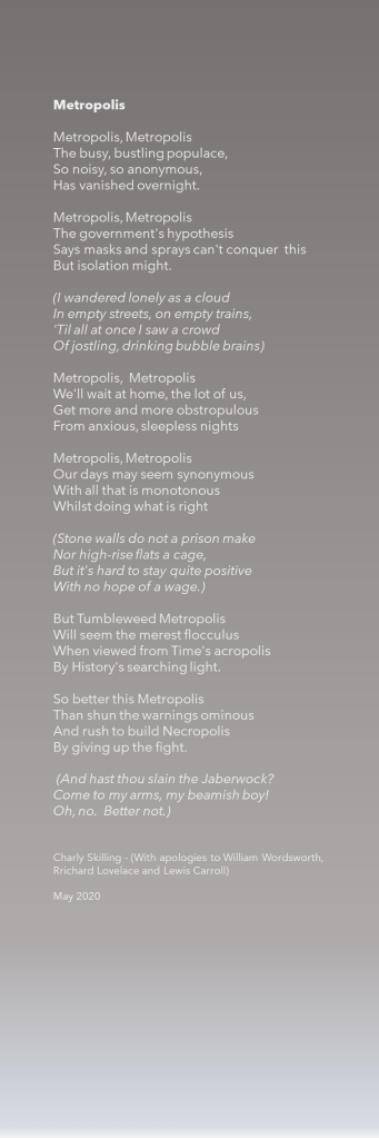 “Metropolis, a prompt that couldn’t help but be met with an onslaught of quarantine consumed media, meaning that those initial visions of bronzed skyscrapers somehow found themselves in a rather uncomfortable blend of Mad Max and the Peaky Blinders! A mingling that resulted in a somewhat smoky poem…”