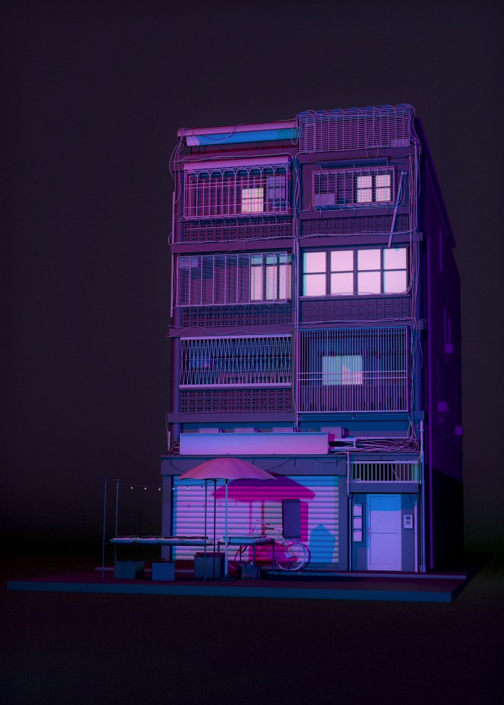 “I lived in this building for two years, in Taipei. It’s in a back road of the red-light district. The lane is full of gentlemen’s clubs in the basements and bars on street level. The strip is teaming with marauding businessmen and pop-up food vendors in the evenings, dying down at around midnight when everyone packs up or goes downstairs. The building itself has five floors and no lift, with a long staircase heading right to the top in a single column.I lived in an illegal extension on the top floor, a fairly common arrangement in Taiwan. The walls shifted from side to side during earthquakes and in typhoons water dripped through the light fixtures. The apartment was clean though, and despite the grime outside, the area was intense and colourful and full of life. The rent was also very cheap.