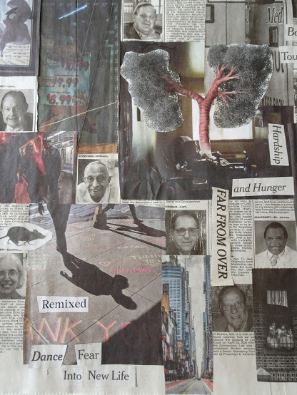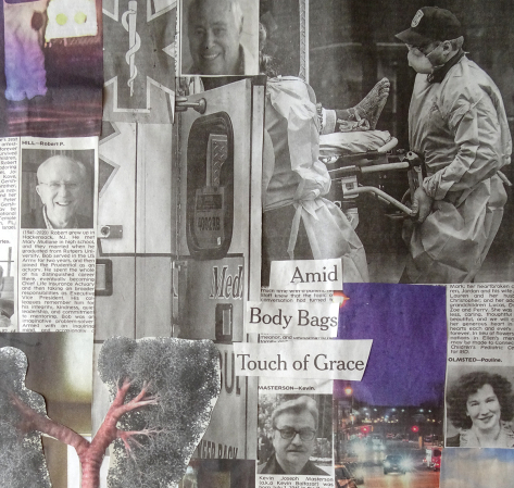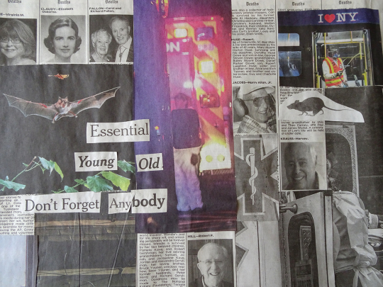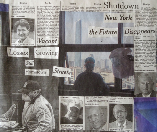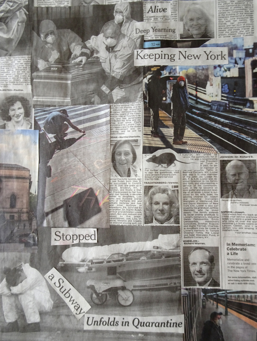 “Most everything I own is in storage, and I do not have many collage materials in my temporary apartment. But I do get the NY Times delivered, and I cut them up for what I’m working on as needed … I took two of the obituary pages from last Sunday’s paper and collaged it with images and headline haiku collected from the last month’s papers.”