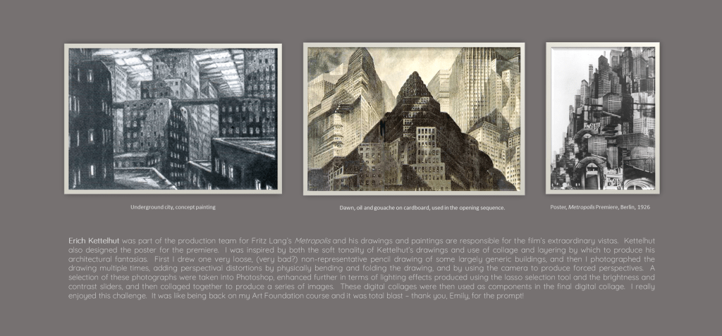 “This is really an amalgamation of my favourite parts of the 1927 film. Perhaps it’s a little too literal an interpretation of the prompt, but it’s been fun to reminisce over my memories of watching Metropolis for the first time. Perhaps I need to watch it again soon…”