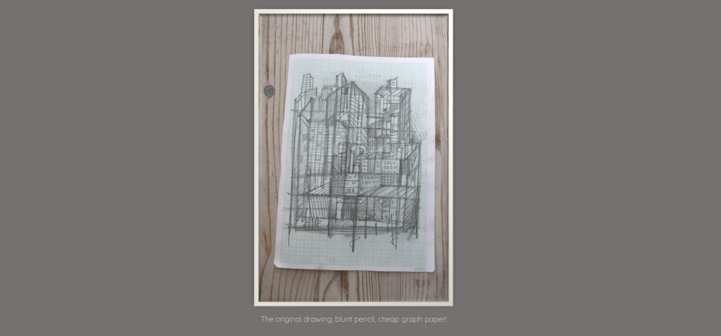 So, in response, I made a couple of neon-British industrial cityscapes. If Blade Runner took place in Manchester maybe? Due to the nature of #MaySketchaDay I have to be pretty quick, so to speed up the process I take my old paintings and collage them together as my starting point. In the way of Gestalt psychology, this noise eventually begins to express pattern and shape, and from there, the painting starts to take hold.”