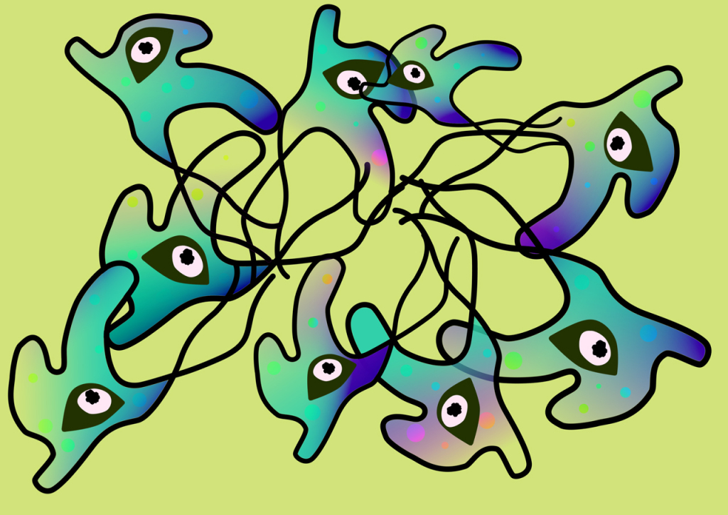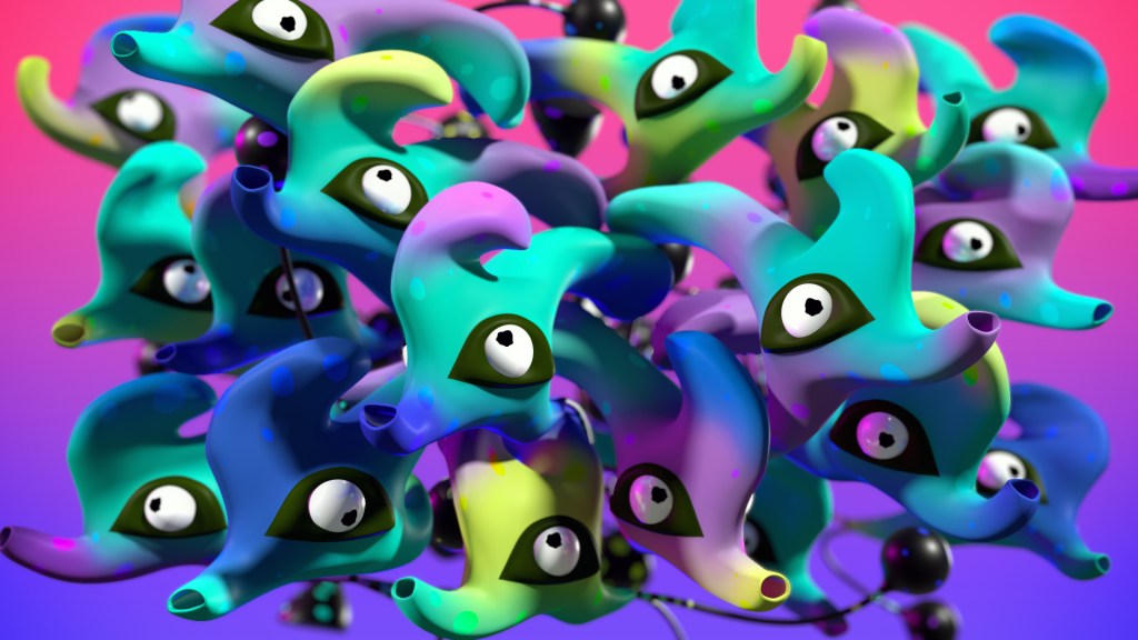 Phil: Hey Tom. Nice to catch up with you this week. I always look forward to seeing what you’ve been up. This image is joyous – like a shoal of outlandish helium balloons. It looks to me like you enjoyed translating your Miro-verse ‘anchovies’ into 3D existence…