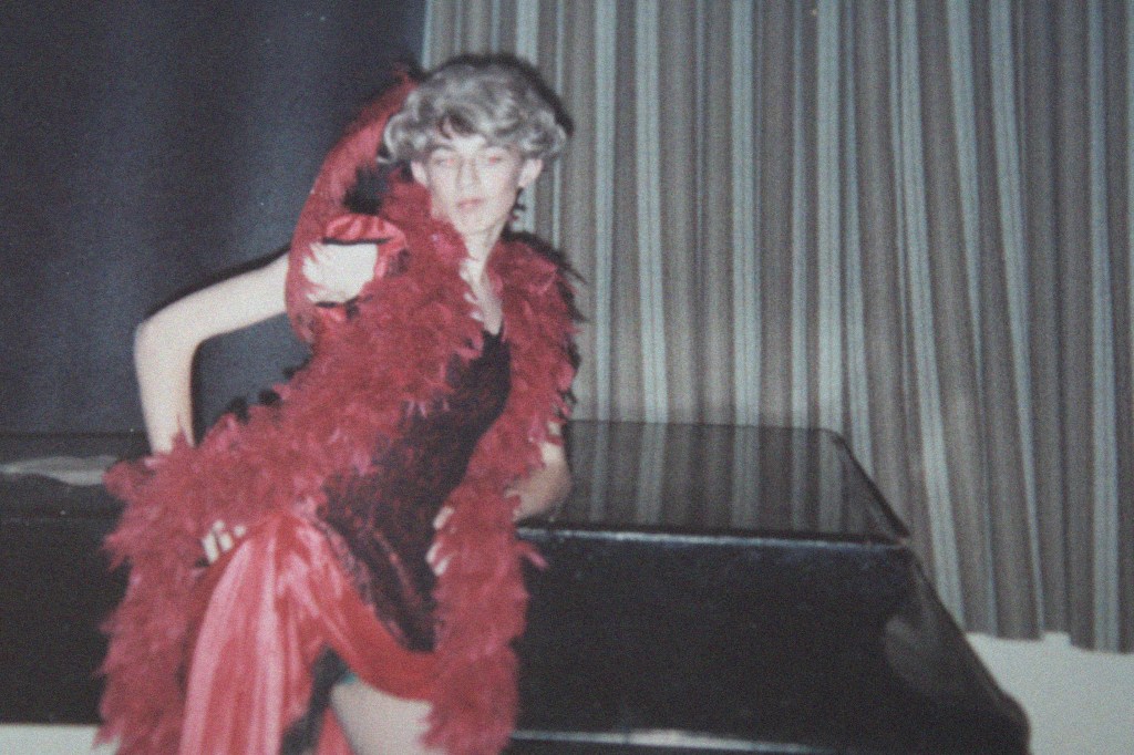 When I look at these photographs, I do so with discomfort, and not simply because the adolescent in the photograph is so scrawny and such a late-starter. I feel hugely protective of him too, for he knows not what he looks like. He does not know what drag is or what it ‘means’ to the world around him. At the point these photographs were taken, this boy doesn’t know what is coming; he doesn’t know he’s just walked into the cross-hairs. He doesn’t know while he’s making lots of people laugh on stage, he’s making other people hate him or provoking embarrassment and disappointment. When I look at these photographs, I see something soft that is very soon going to learn the art of cocooning for protection. I see a very long period of incubation, and not an ending with a beautiful butterfly in it, but a life-form in lots of ways less graceful, but, also yes, with wings.“