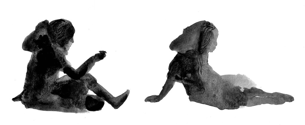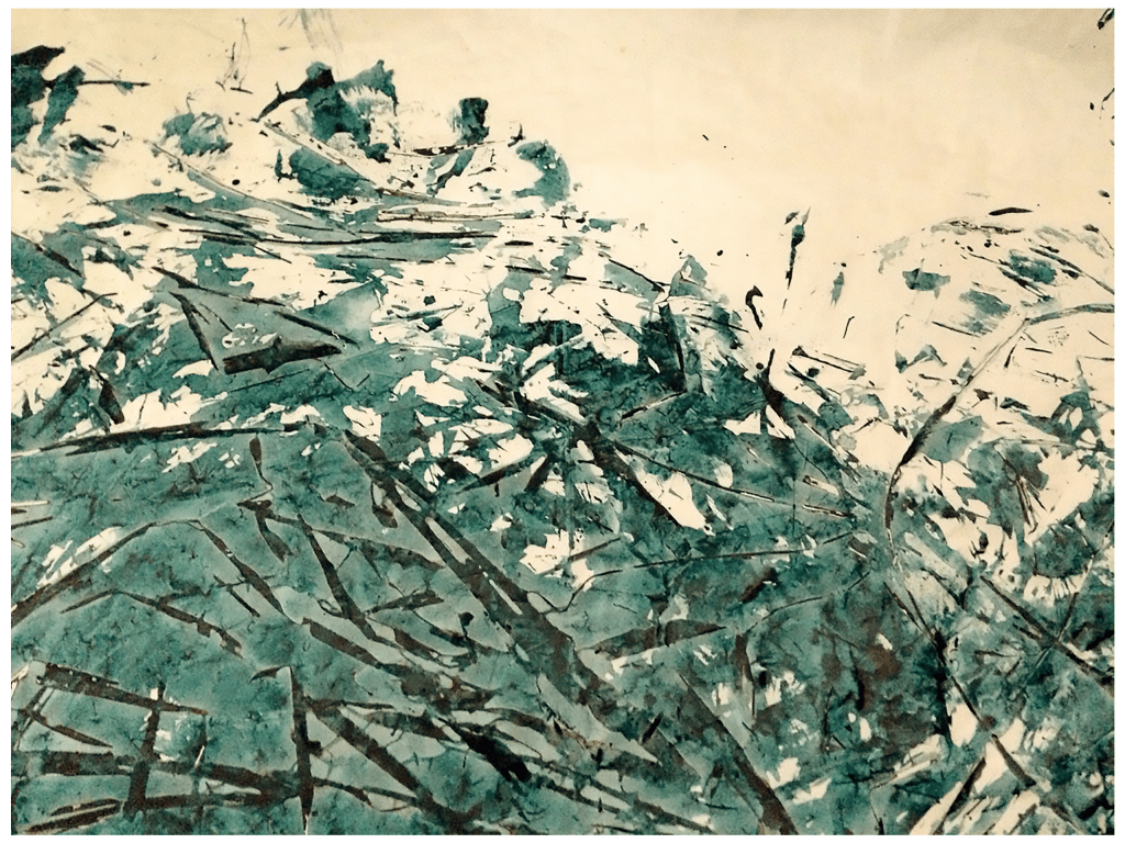“I have two images relating to the new kick-about “Cicada”. I love the sound of summer filling the day, the hot air on the skin, the smell of herbs and grass, they are my childhood summers on the Ligurian coast. One of the paintings is the summer grass, an image I have been trying to paint for many years and will likely keep trying to paint. The other one is a monotype on plastic made with raffia dipped in ink, I was trying to capture the movement of bamboo leaves and insects.”