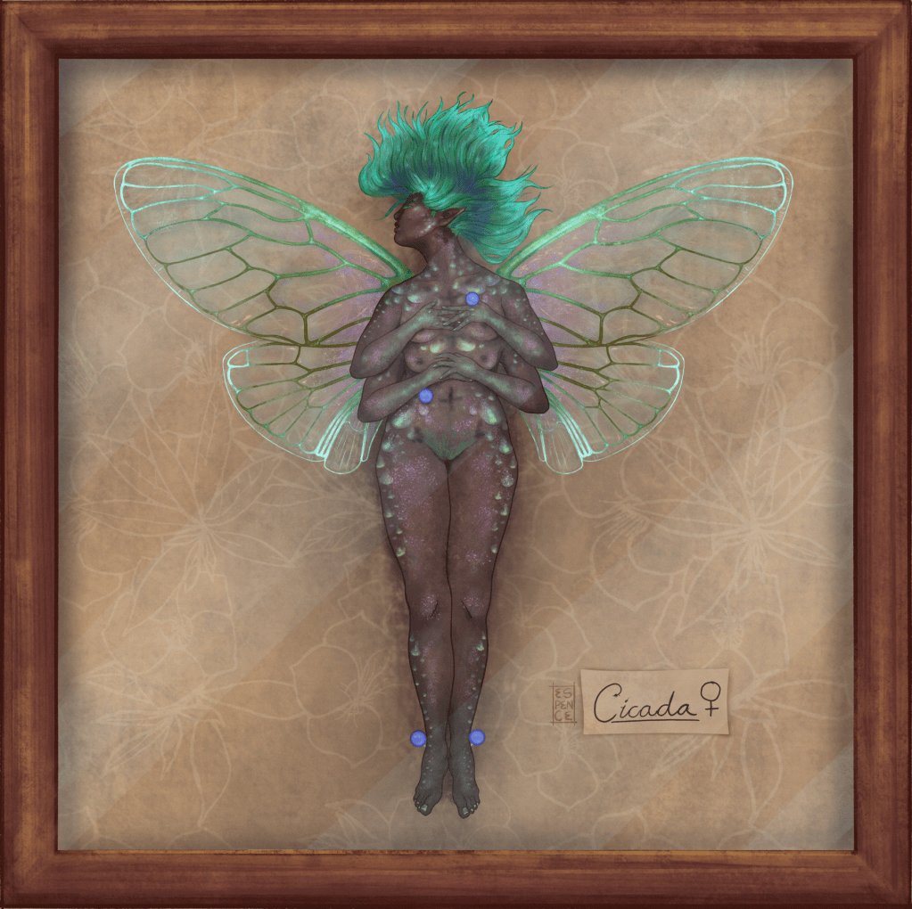 “I’ve been wanting to play around with a fairy/insect taxidermy concept for a while, and this seemed like a good opportunity. I took wings, colours and patterns from pictures of cicadas to make this unfortunate fairy, preserved and pinned, ready to go on the wall.”