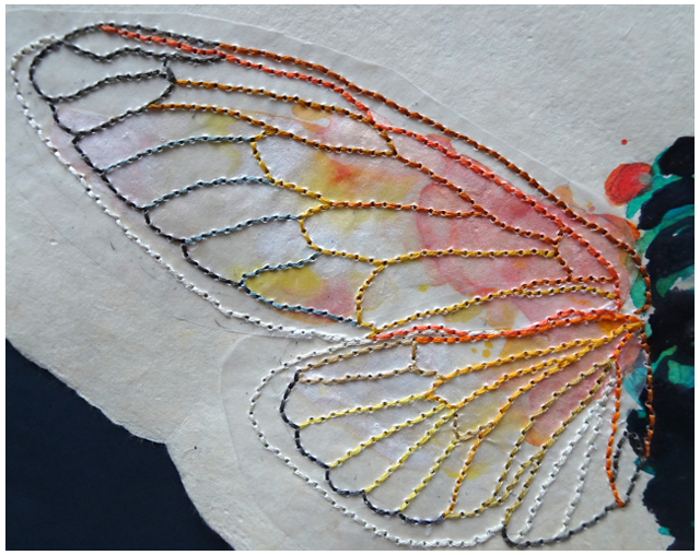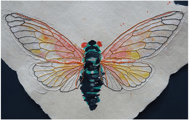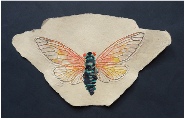 “Cicadas are one of many species that make multiple visible transformations during their lifespans. The longest living insects, they are symbols of both rebirth and immortality. What beautiful wings they have. I first painted the cicada, then glued wax paper down for the wings and embroidered on top.”