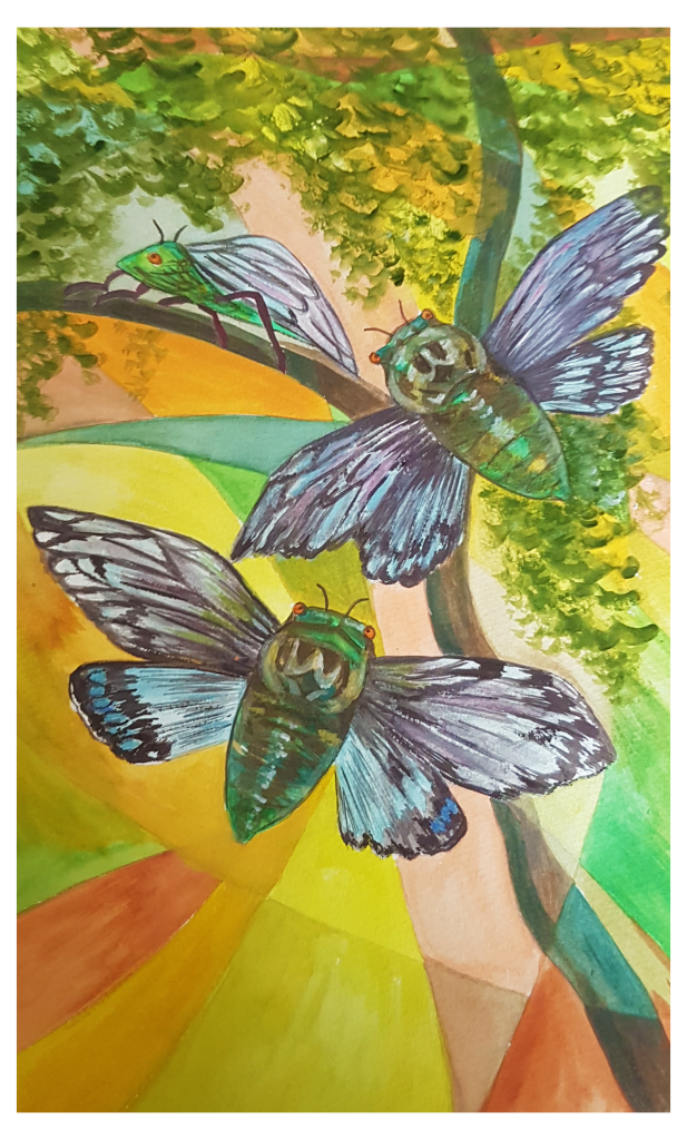 “I must say that I feel like I have turned into a Cicada in the heatwave this week! I had so many false starts trying to capture the essence of these amazing creatures. Eventually I settled for “Happy little Cicadas” after they have just emerged after 17years underground. Well you would be!”