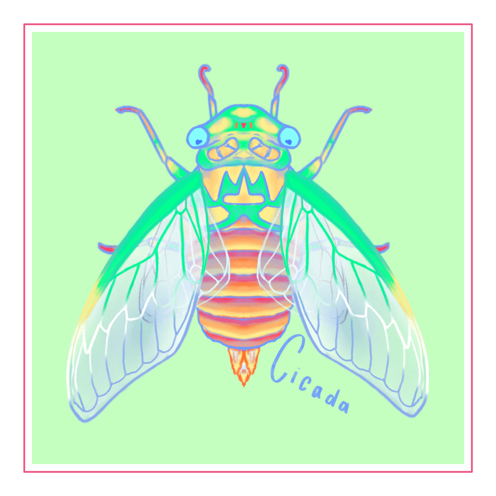 “Only knowing cicadas from Animal Crossing, I thought I’d have a look into them. Did you know that they can live up to 17 years? AND make a sound louder than 100 decibels! Impressive for a chubby little sap-drinker! They come in a few different colours, but a pastel one really resounded with me so here he is! A digital painting of a vibrant cicada with his little dancing feet.”