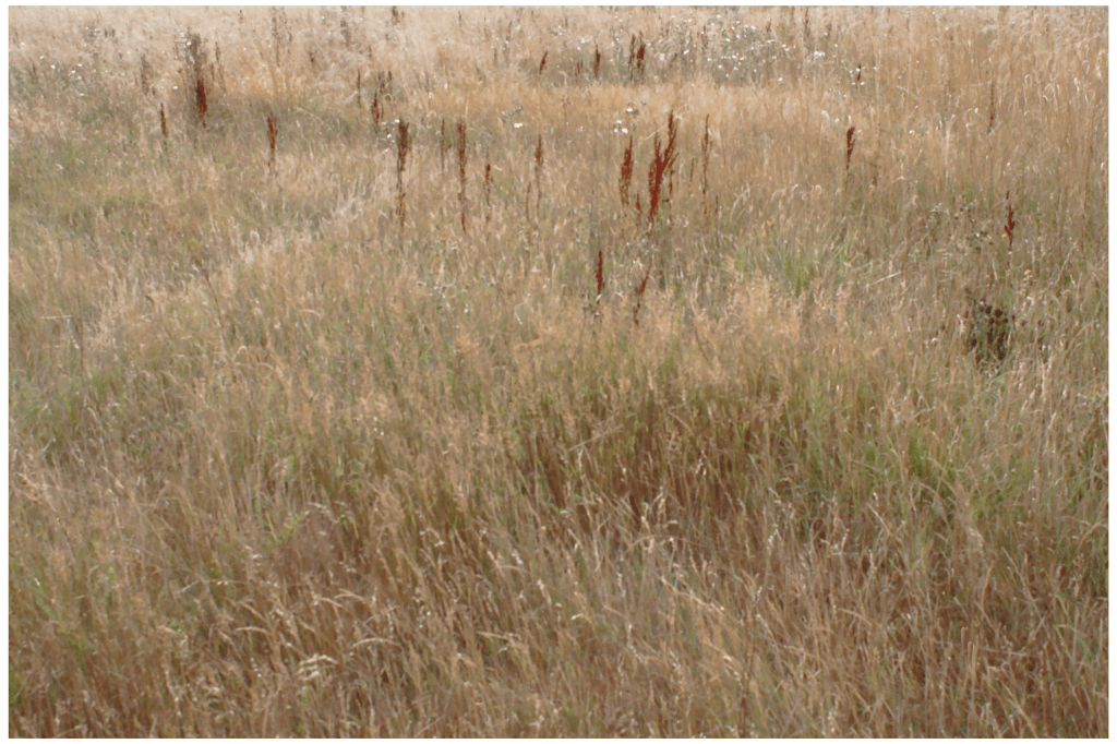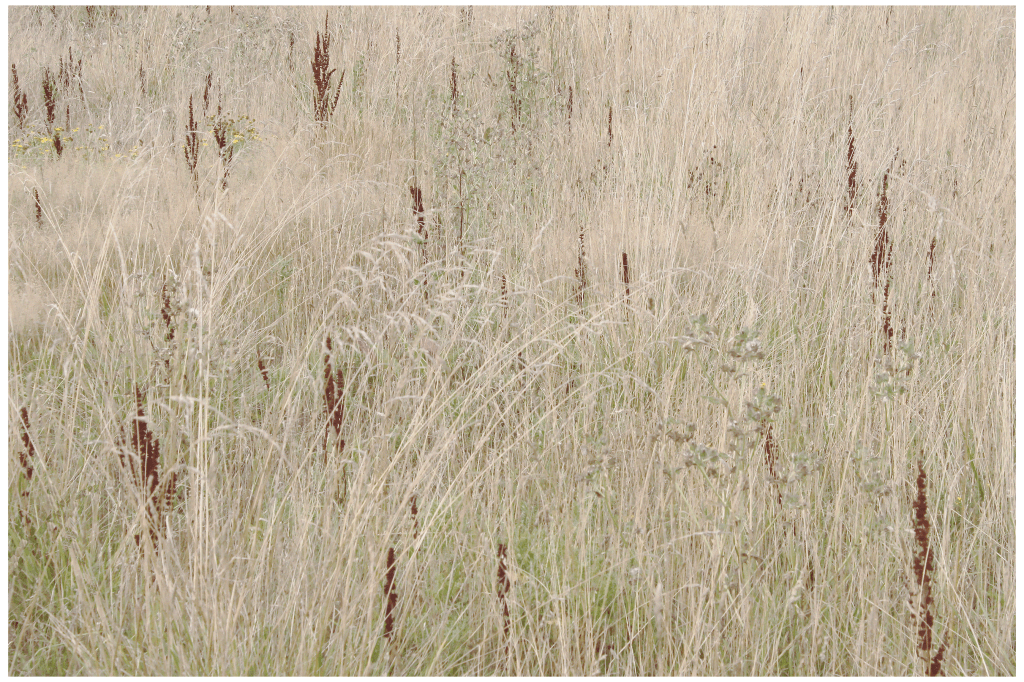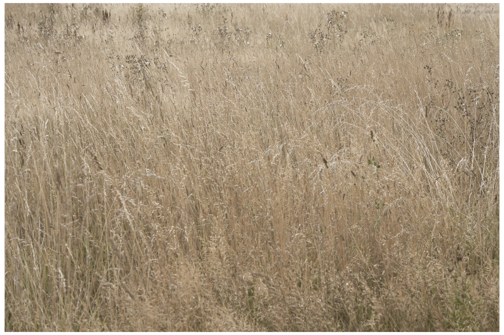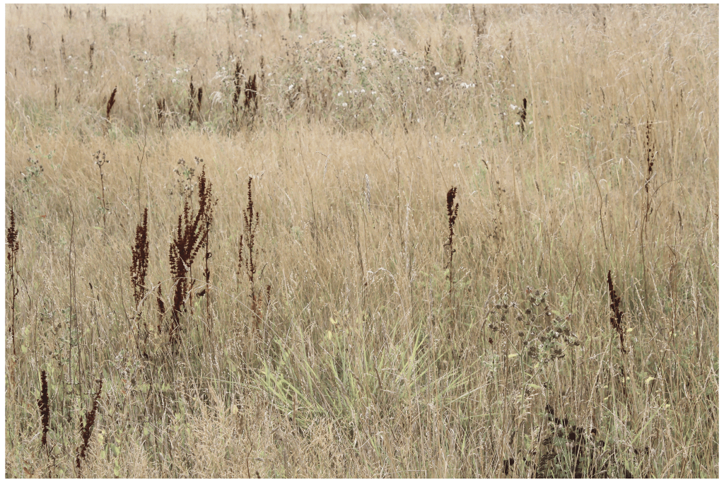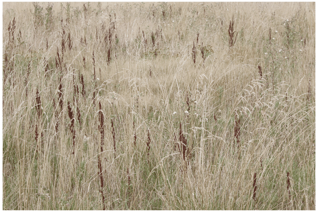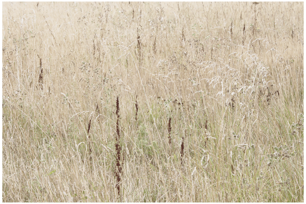 At one end of this dry, brittle field, all the stiff congregations of desiccated rumex spires made me think of ermine, or of leopard moths, or the streaking on tulip petals, and always brush work, as if someone has been using the tip of a very dry brush to lift these late Summer vistas with a few licks of stronger colour.