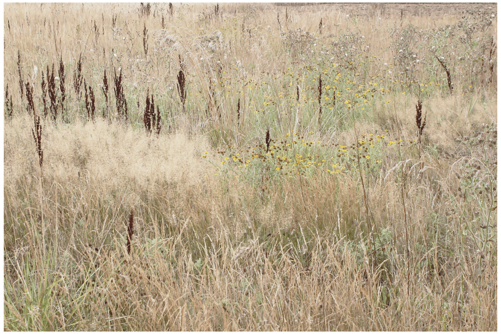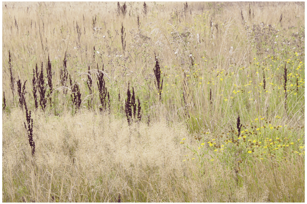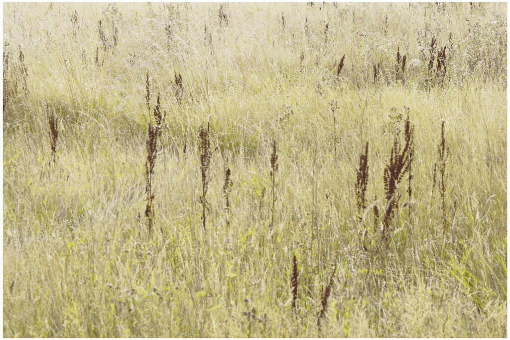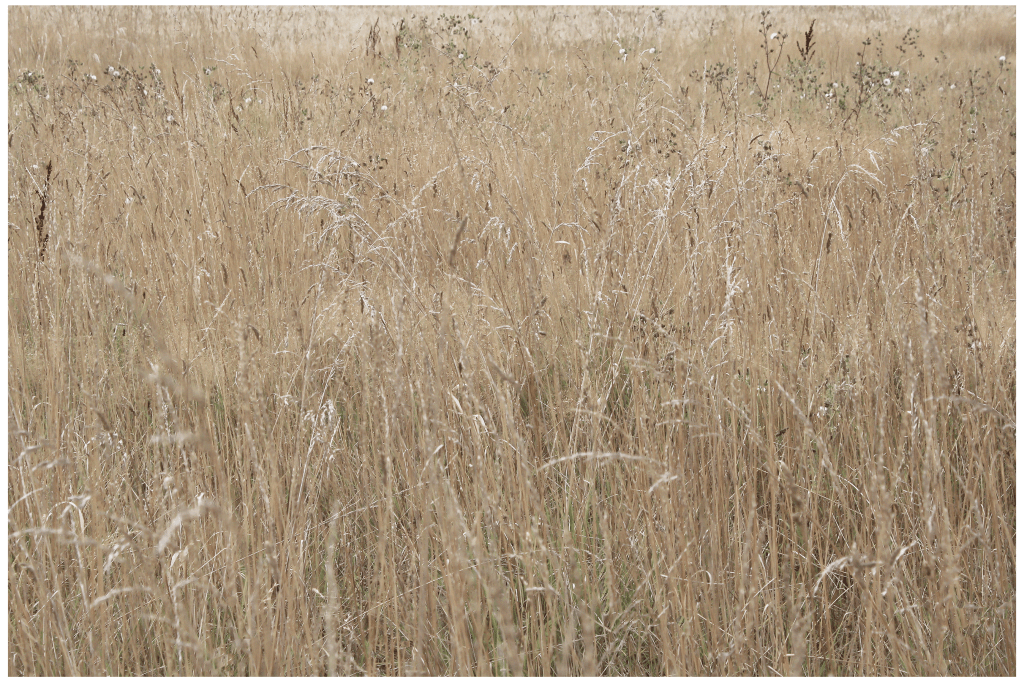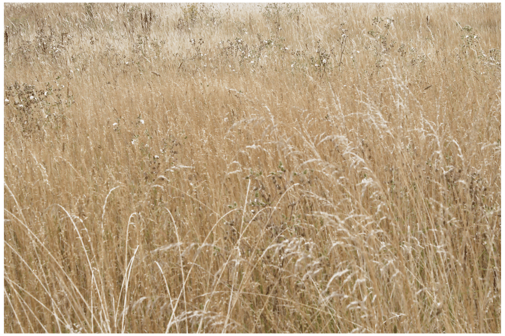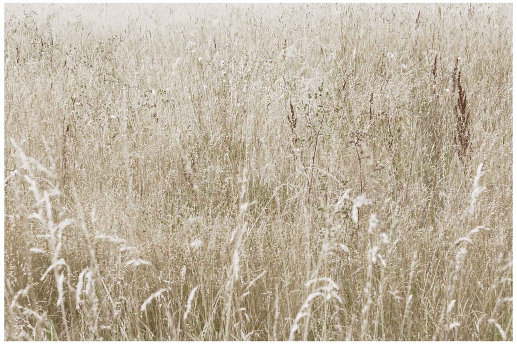 At one end of this dry, brittle field, all the stiff congregations of desiccated rumex spires made me think of ermine, or of leopard moths, or the streaking on tulip petals, and always brush work, as if someone has been using the tip of a very dry brush to lift these late Summer vistas with a few licks of stronger colour.