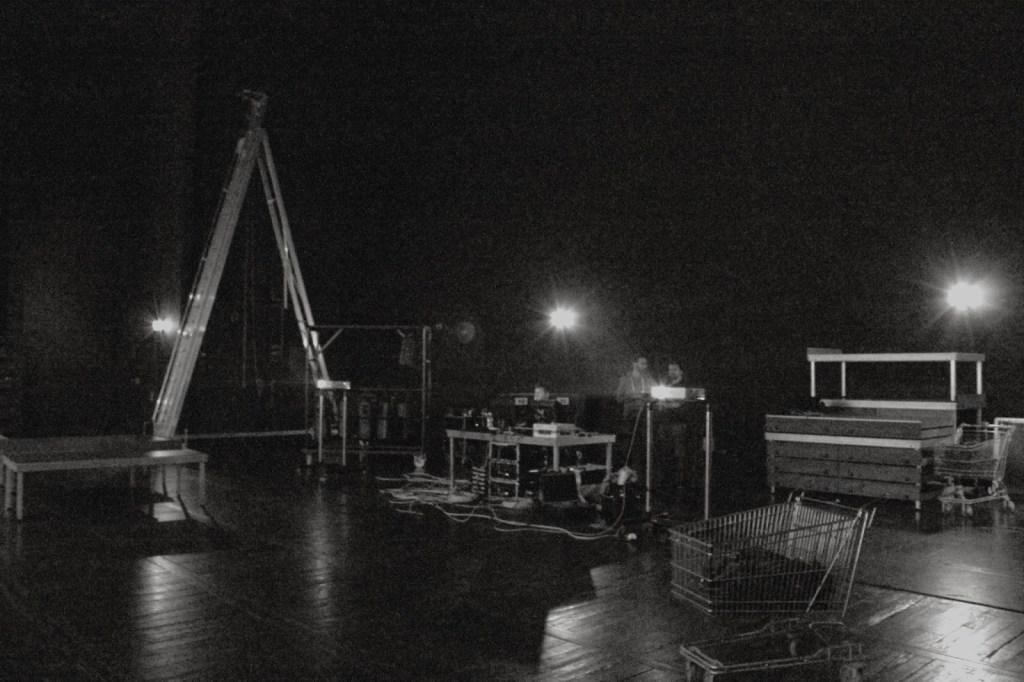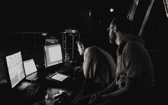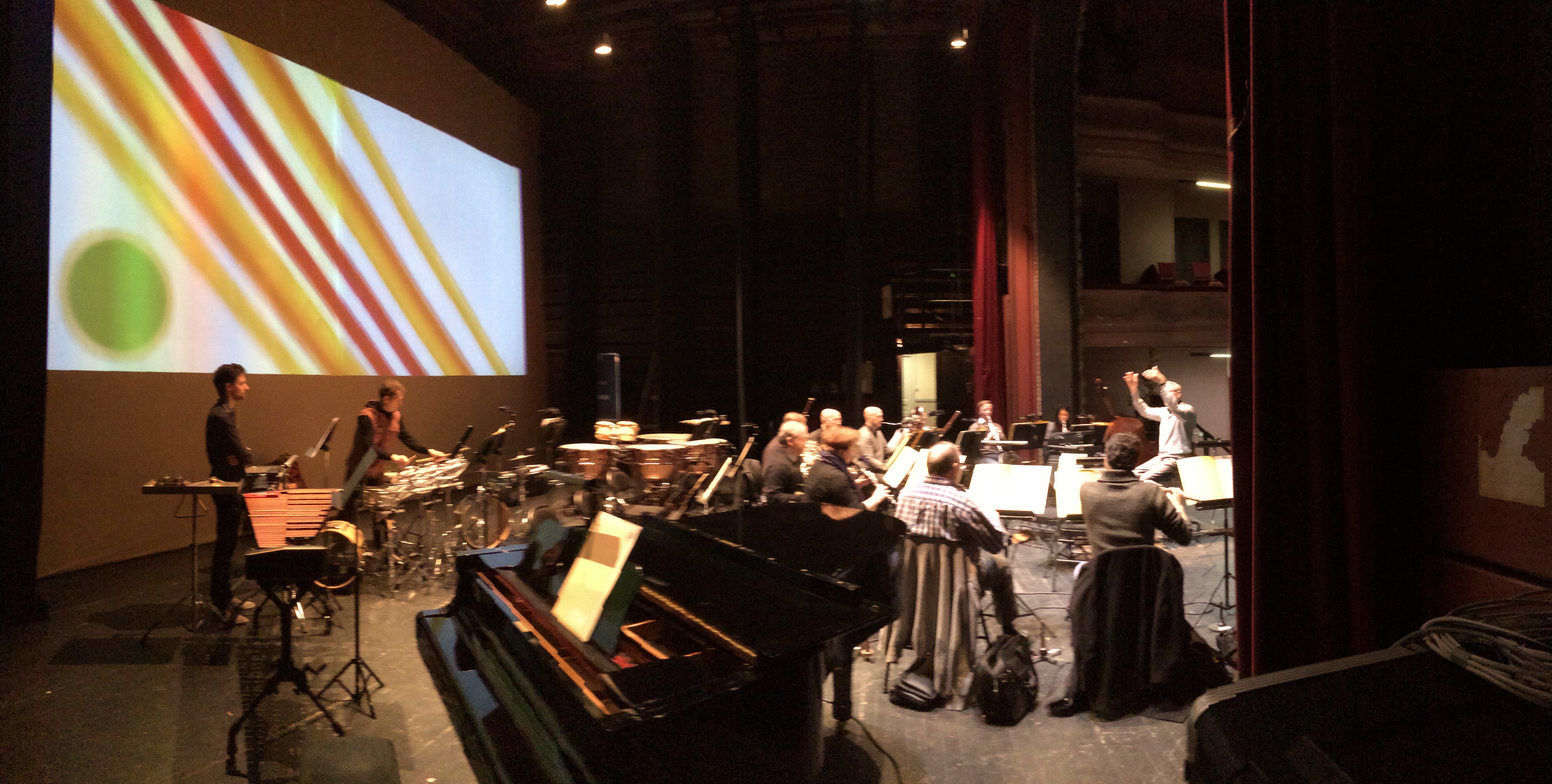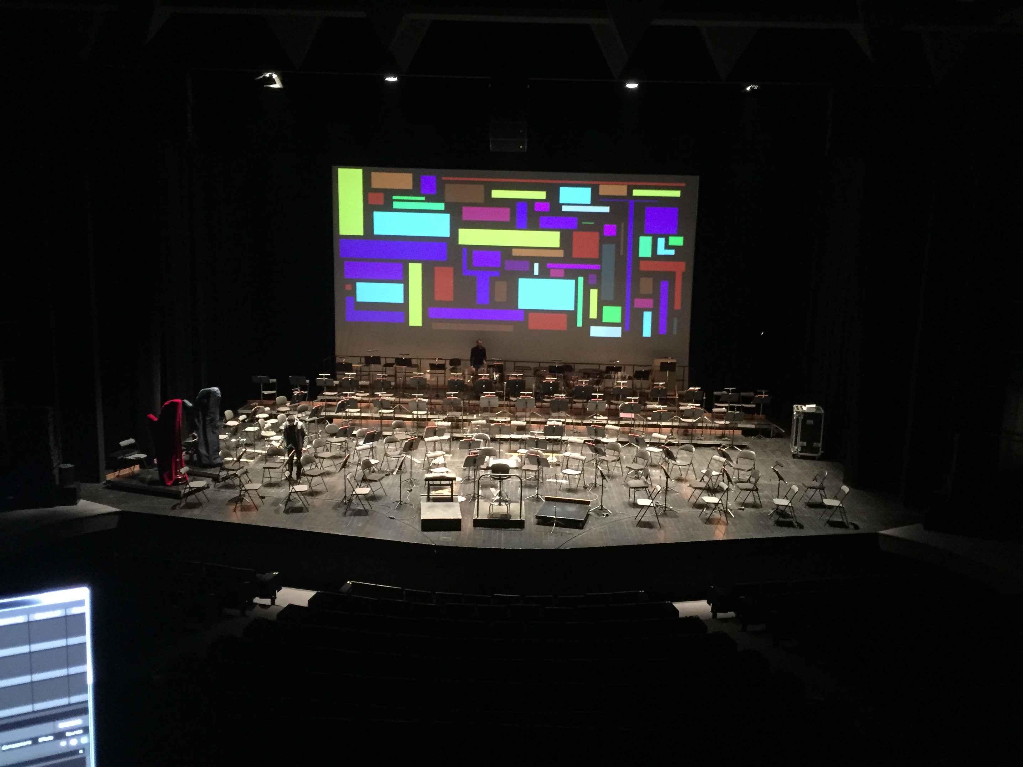 Maison de la Culture, Amiens, France – December 19th, 2013 / If you very peer very closely at this image, you’ll see Keith Burden seated behind the table in the ‘cock-pit’, surrounded by computers, controllers and lengths of cable. Tom Beg and I are conferring in the background. We’re at the back of the stage hidden behind a huge screen, onto which we will soon project La Création du monde in live-synchronisation with the Orchestre de Picardie. Not sure what the shopping trolley is for.