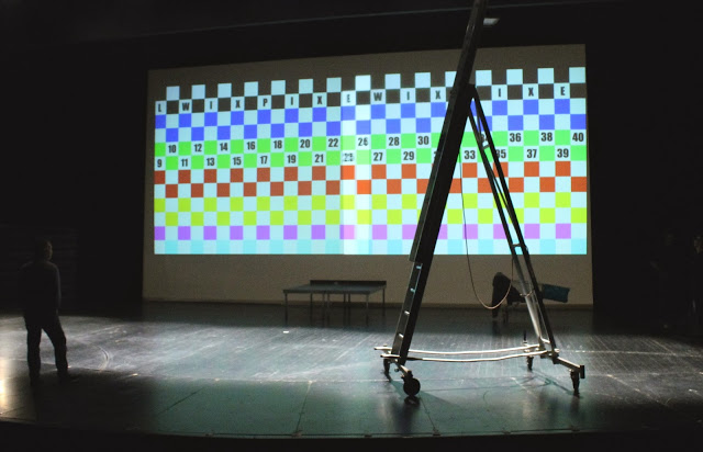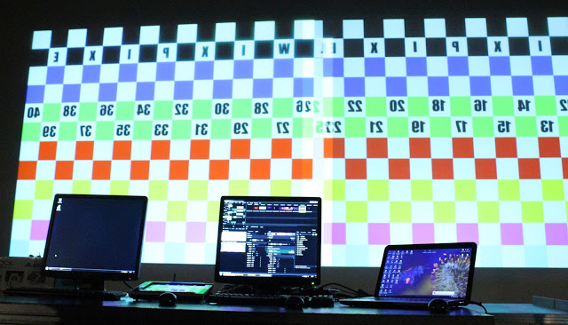 So begins the process of blending the images of two separate projectors to produce a single seamless rear-projected image on the big screen at the Maison de la Culture, Amiens, France, December 19th, 2013. The checkerboard image is used to ensure the two projected images are aligned perfectly. I suspect Keith sees this checkerboard in his dreams..
