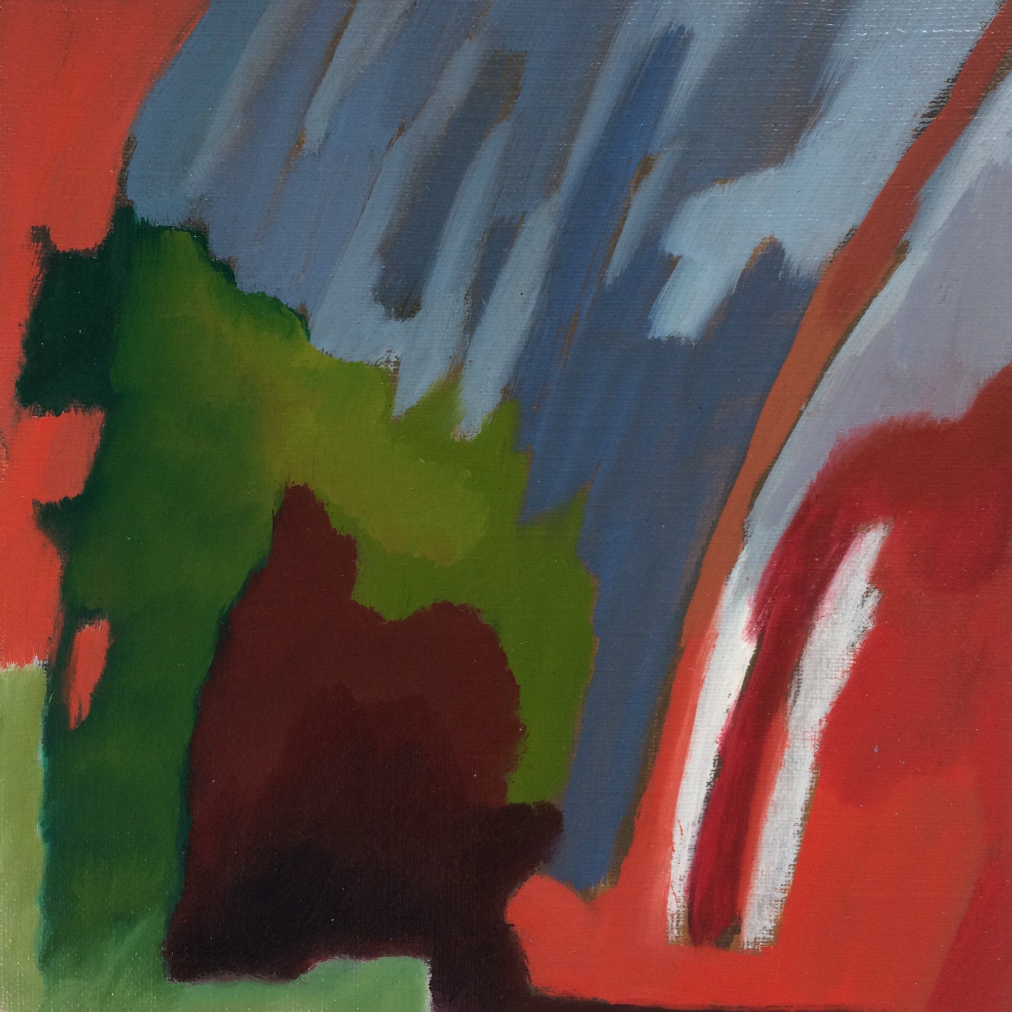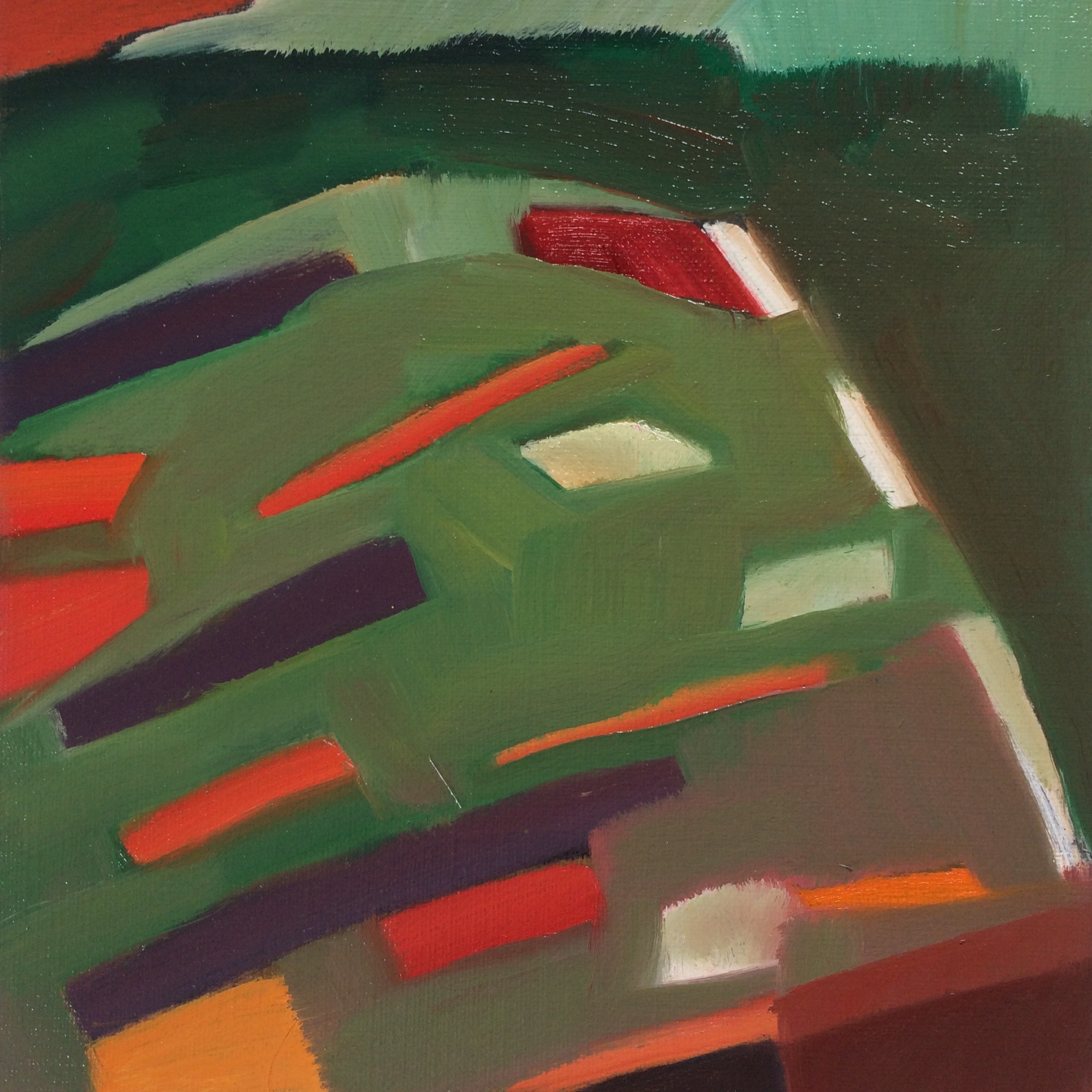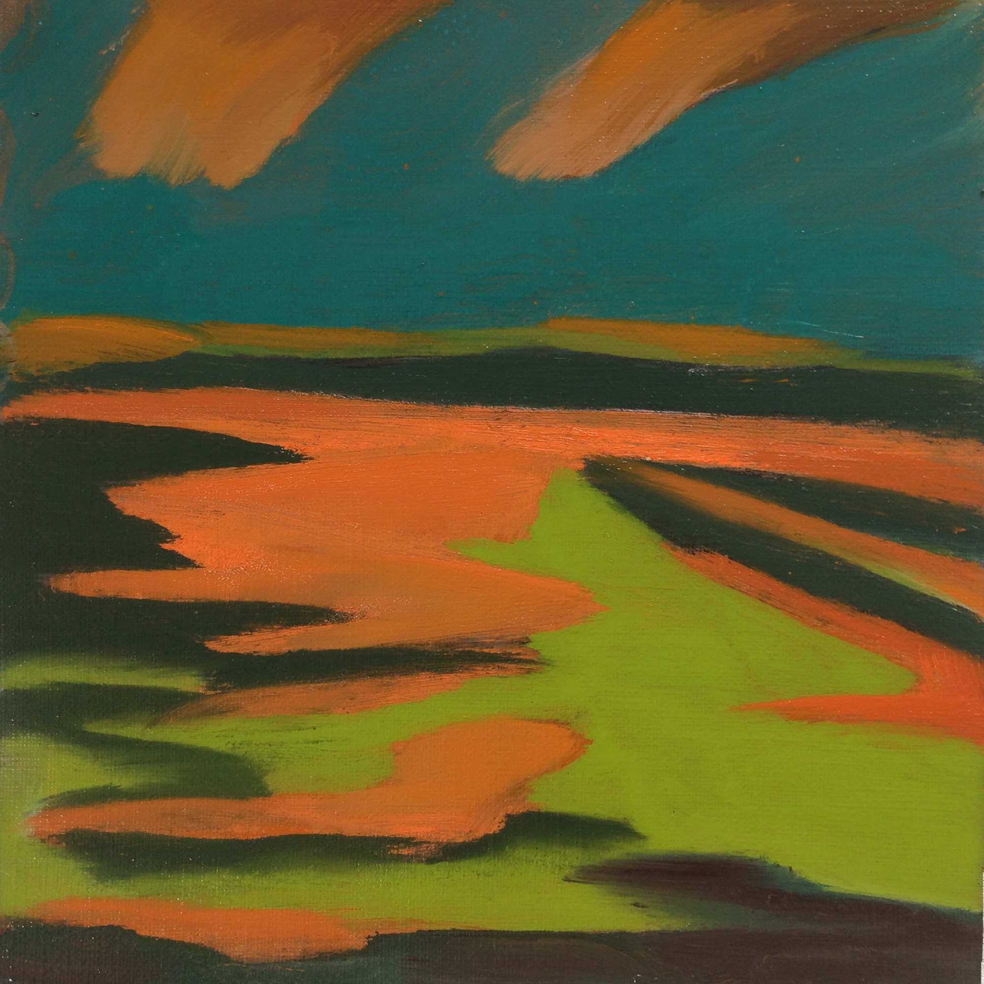 “Kicked-off with A1 drawing in elaborate-freeform. Day-2 was elaborate-freeform using a crude-mix of thinned oils. Day-3, after taking a dislike to it, chopped it into 12 squares with disregard for things I might have liked and scattered them beneath the work desk. Day-4, one week later, each square found its own right-way-up and the conclusion of the set was reached just beyond 4 hours 40 minutes. To avoid curating, they are presented in the order they were painted and no telling how they fit back into A1.” Oil on primed paper, set of 12, 16x16cm