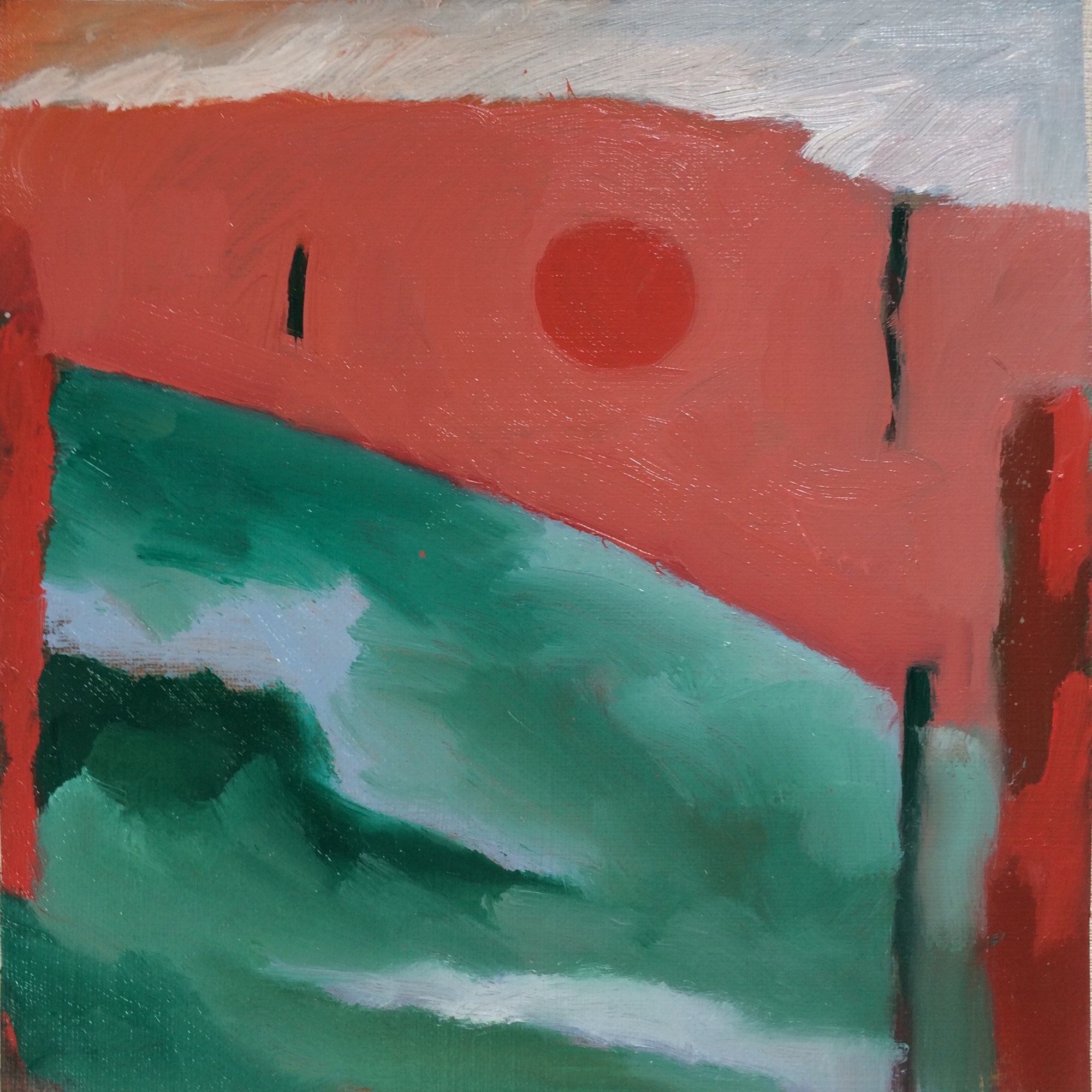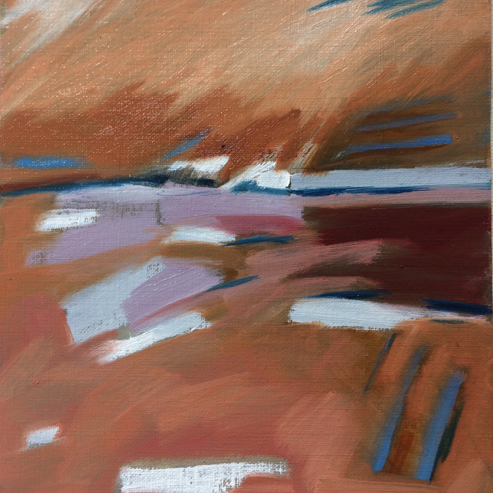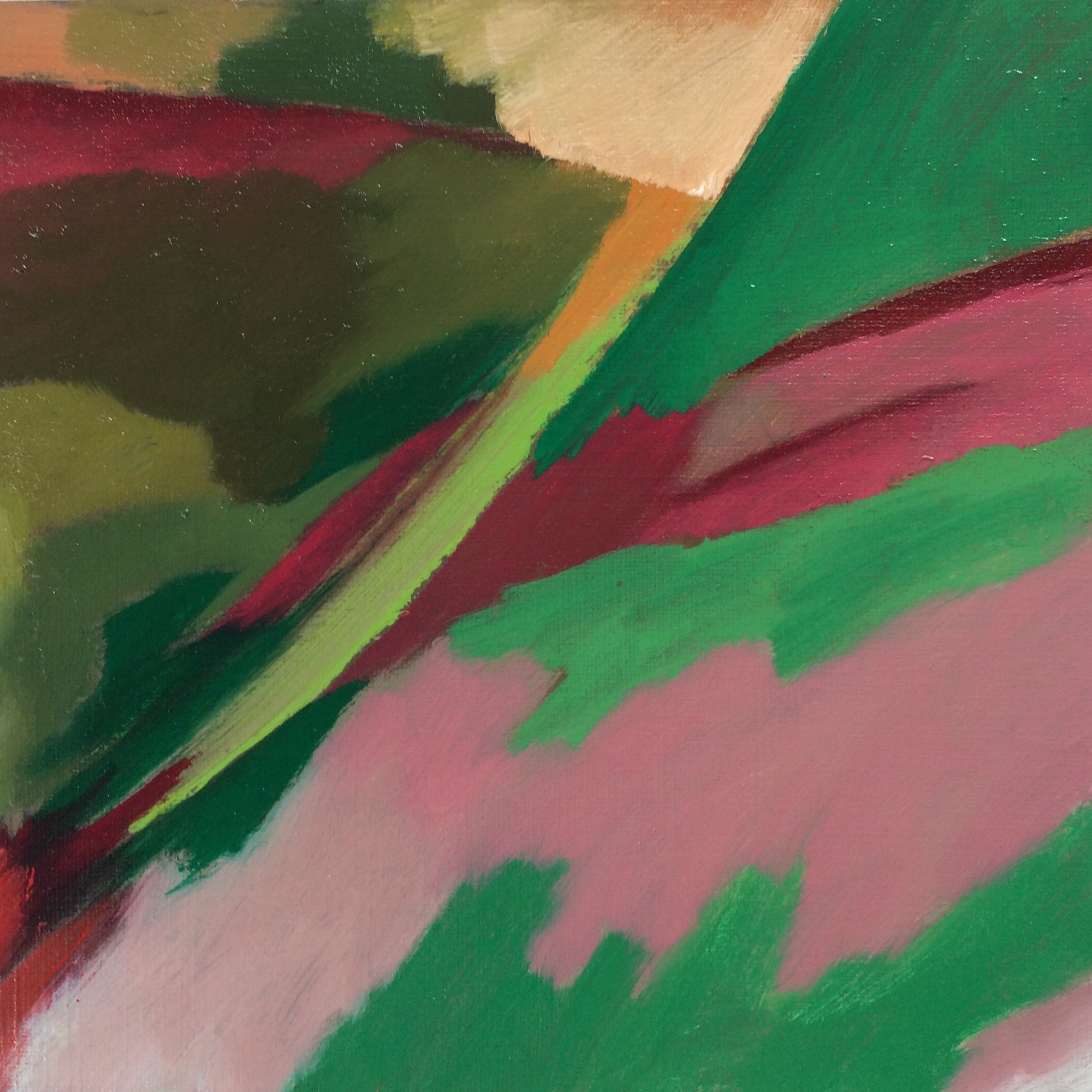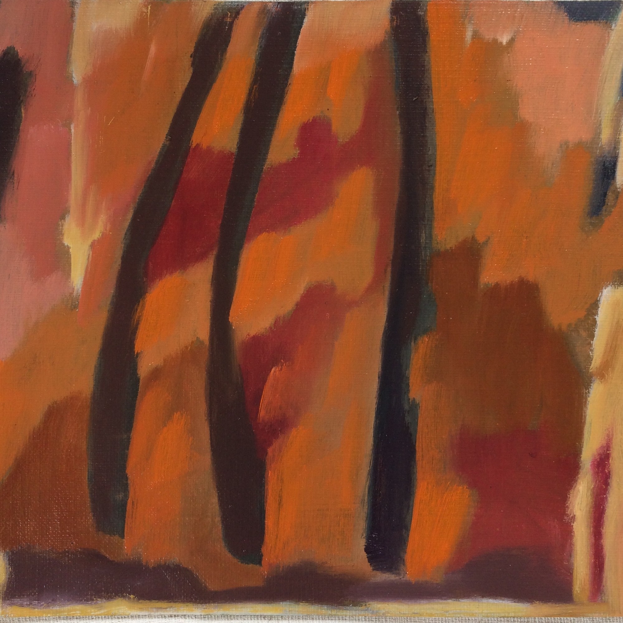 “Kicked-off with A1 drawing in elaborate-freeform. Day-2 was elaborate-freeform using a crude-mix of thinned oils. Day-3, after taking a dislike to it, chopped it into 12 squares with disregard for things I might have liked and scattered them beneath the work desk. Day-4, one week later, each square found its own right-way-up and the conclusion of the set was reached just beyond 4 hours 40 minutes. To avoid curating, they are presented in the order they were painted and no telling how they fit back into A1.” Oil on primed paper, set of 12, 16x16cm