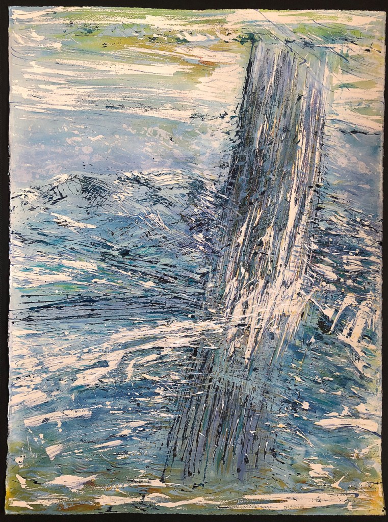 “A great prompt. Most of my work aims to capture movement – action, transformation, development, energy, colour, sound… This time it brought back into life an idea I have been circling around for a long time, which turns into a sketch I did on a plane back from Mexico; great places to sketch, planes and trains. Some of my best ideas happen there; the myth of Icarus. While imprisoned in a tower, his father Daedalus, famous for having built the Labyrinth, made wings for Icarus, taught him to fly and warned him not to go too high or the heat of the sun will melt the wax used to make the wings – with the well known result. A great tragic story. It inspired so many paintings and art works showing all the stages of the story. I particularly love Bruegel’s one with just a pair of legs in the sea while life goes on. I decided to show the aftermath of the fall itself without the object, the gravity force pulling down breaking from the clouds through the air into the water; of course using my usual “control impulse” technique starting from the light in the foreground and stepping backward inside the painting with subsequent layers of ink washes getting deeper and deeper into the background and then out again. I hope Icarus enjoyed the time he had in the air, if short.”