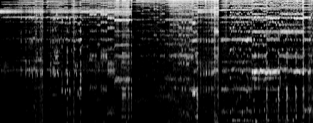 “Courtesy of my good friend and long-time collaborator, Ethan Shilling, I was able to transcribe John Adams’ Short Ride In A Fast Machine into a spectrogram, a visual representation of the music showing the frequencies comprising the sound. The black and white image below is what the sound of this fast machine looks like as it accelerates from start to finish. With more than a nod to Kubrick’s 2001, the exhilarating opening titles to the original 1978 Superman, and a quick steal from Luigi Rossolo’s The Revolt, I took the resulting spectrogram, colourised it for heat, fizz and vibrancy, and pushed it into perspective for maximum velocity!”