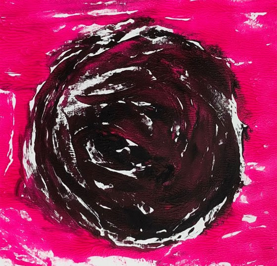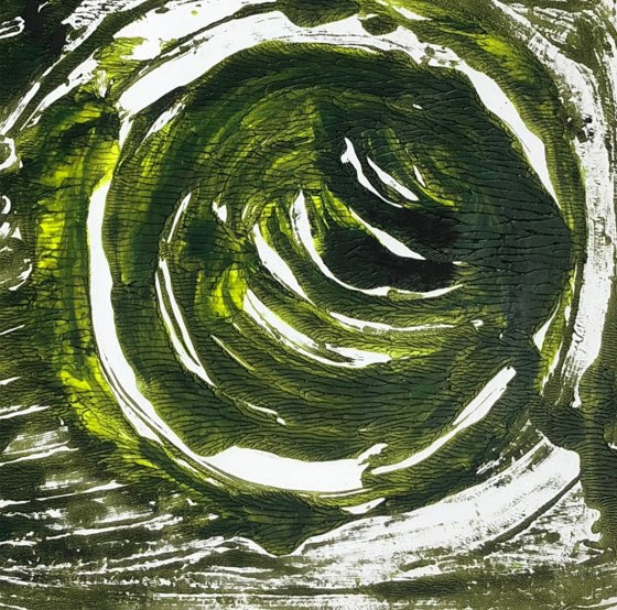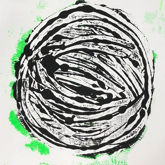 “For this Kick-About, I returned to making monoprints in the same vein as I did for the Alice Neel prompt from the Kick-About #5. I wanted something spontaneous and bursting with energy. I sat down and calculated how many Trappist-1e years I would be now and it was humbling to say the least: I am 2,307 Trappist-1e years old. The other two numbers represent my Earth ages: 38 years old, having spent 14,072 days orbiting our star. We don’t actually know what Trappist-1e looks like (the picture in the prompt is an artist’s rendering), so I let my imagination run wild making planets on the inking plate.“