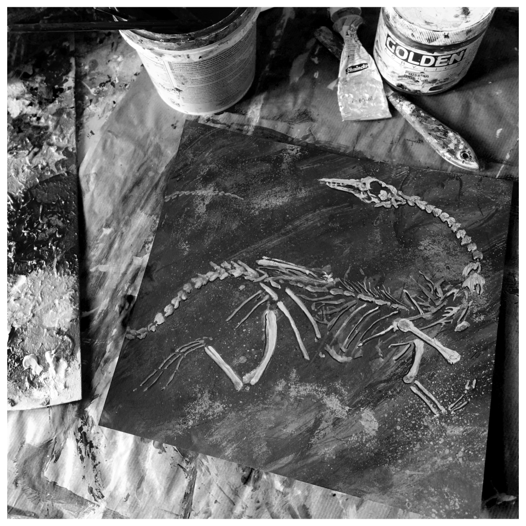 Phil Cooper’s fossil painting on his art table in his Berlin studio, October 2020