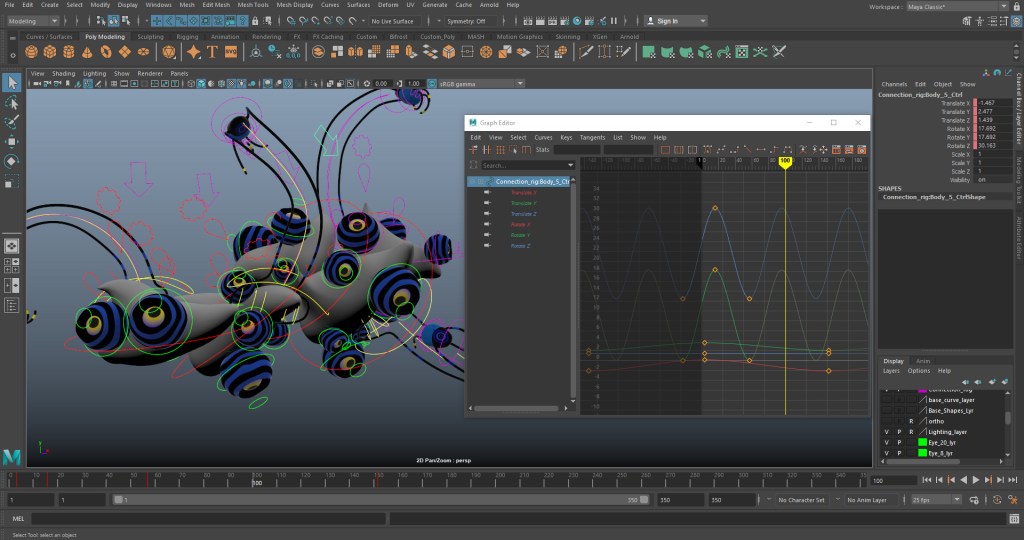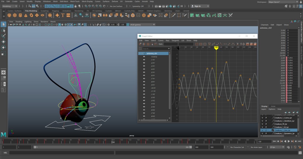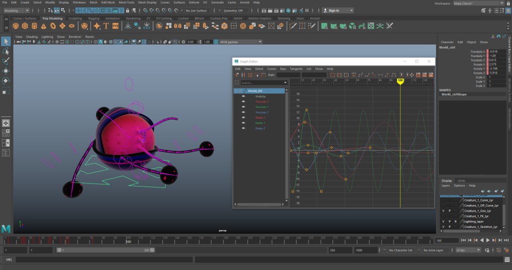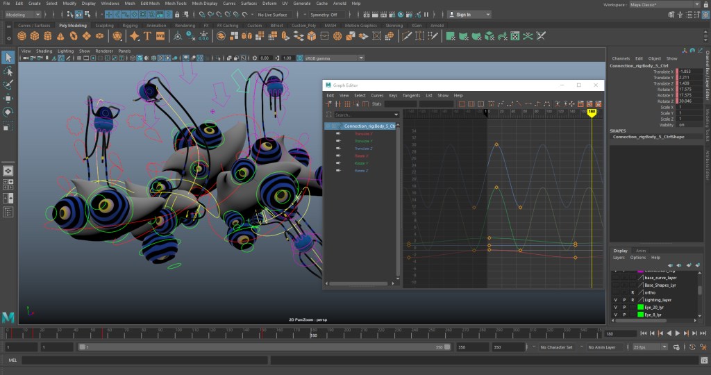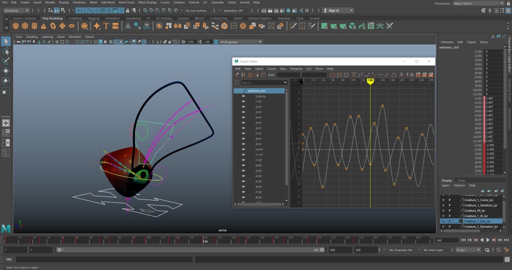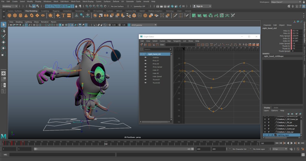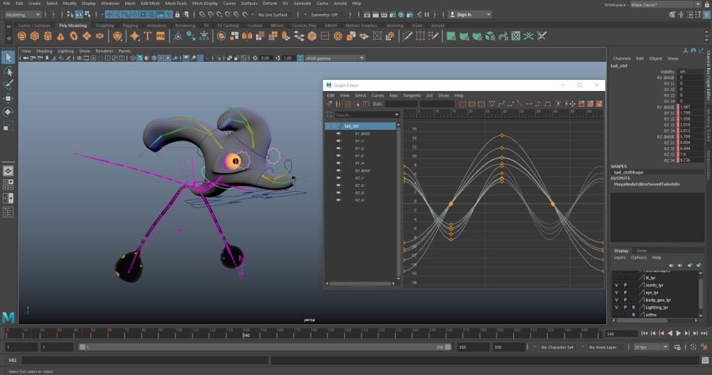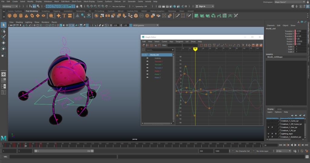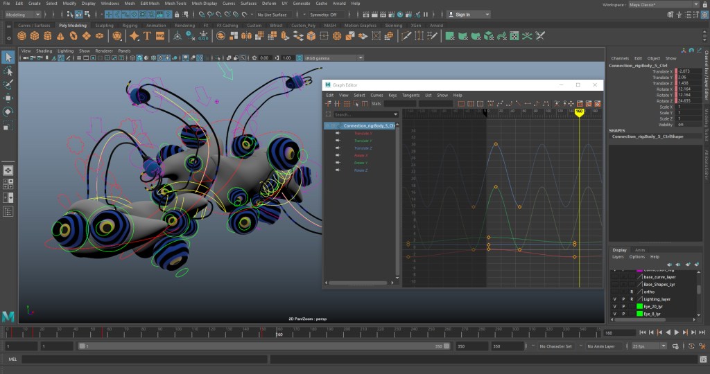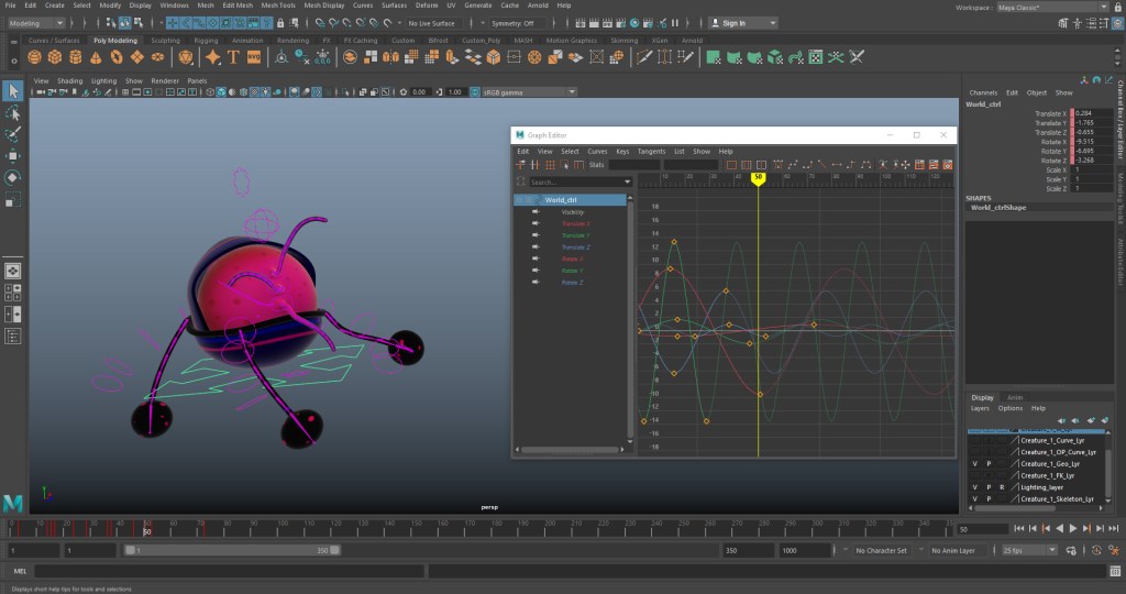 In Maya, you can animate very traditionally, or you can animate based more on numbers and graphs and letting the computer calculate what happens. I was actually working more with the latter method, which might be surprising. Lots of typing in different values to work out how many frames of animation would be appropriate for whatever movement. It’s lots of looking at things that don’t look like animation in the typical sense but are nonetheless controlling what’s happening on the screen. When it comes to final animation, it’s going to be a mix of this and more traditional animation puppetry.