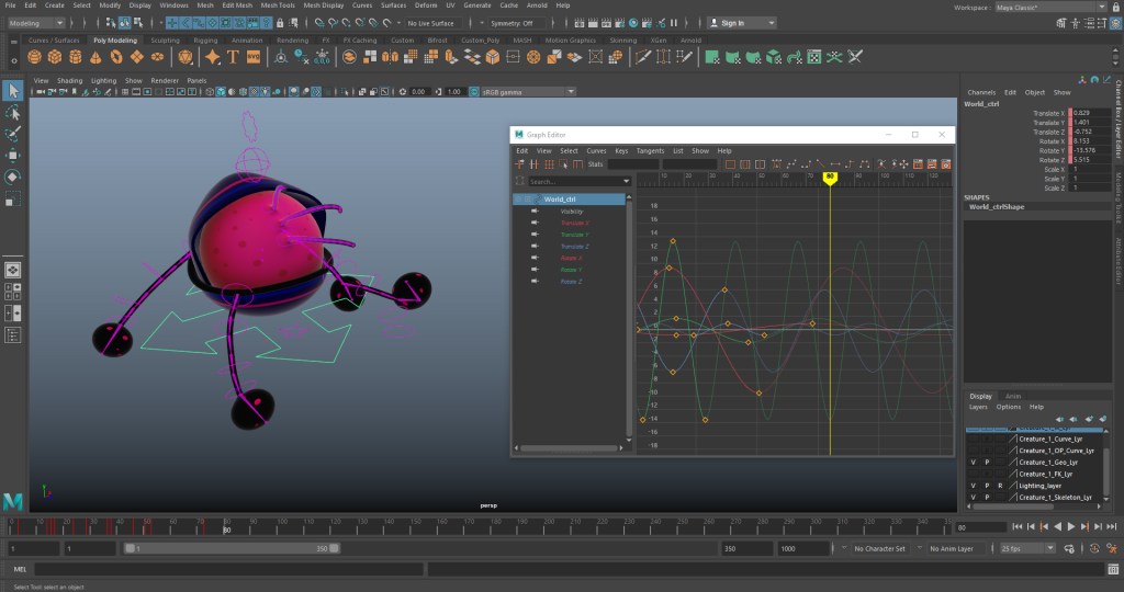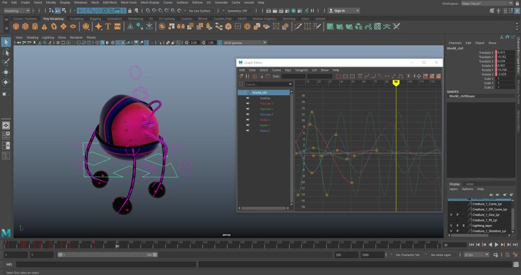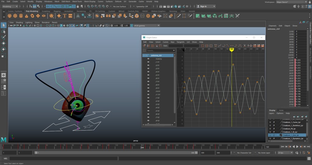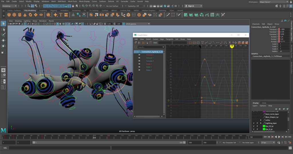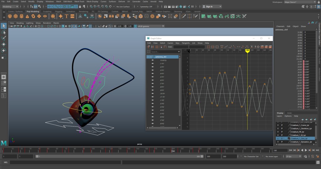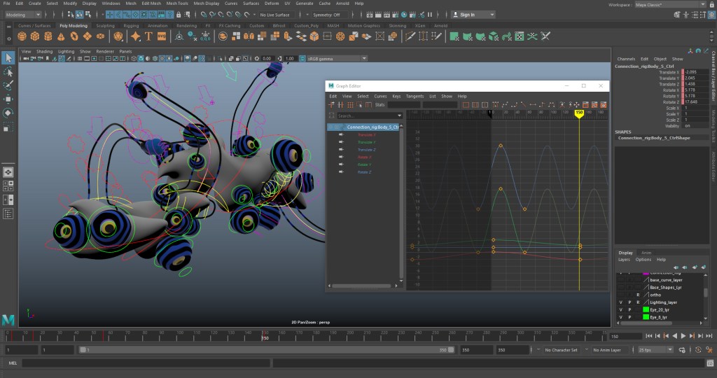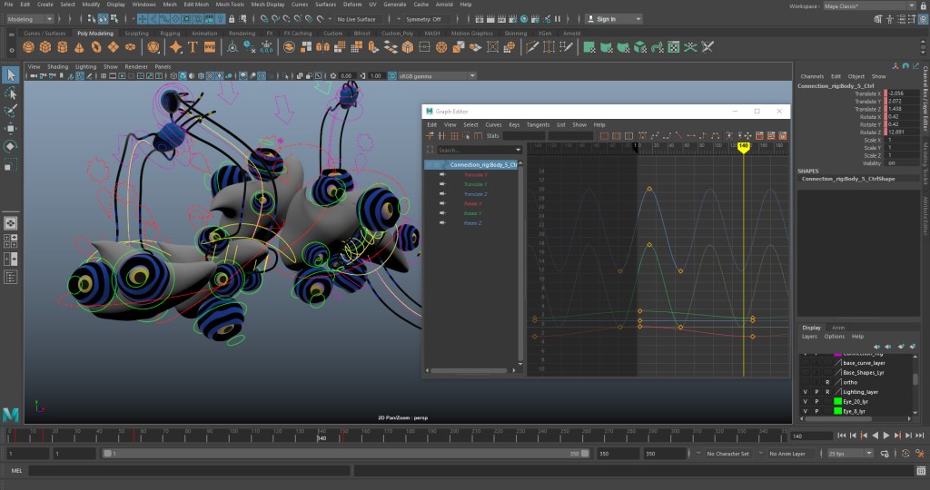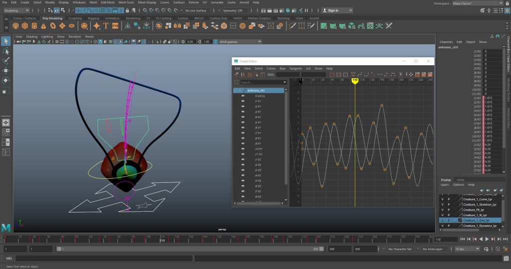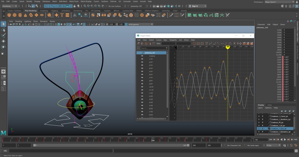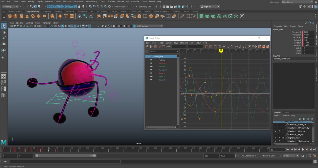 In Maya, you can animate very traditionally, or you can animate based more on numbers and graphs and letting the computer calculate what happens. I was actually working more with the latter method, which might be surprising. Lots of typing in different values to work out how many frames of animation would be appropriate for whatever movement. It’s lots of looking at things that don’t look like animation in the typical sense but are nonetheless controlling what’s happening on the screen. When it comes to final animation, it’s going to be a mix of this and more traditional animation puppetry.