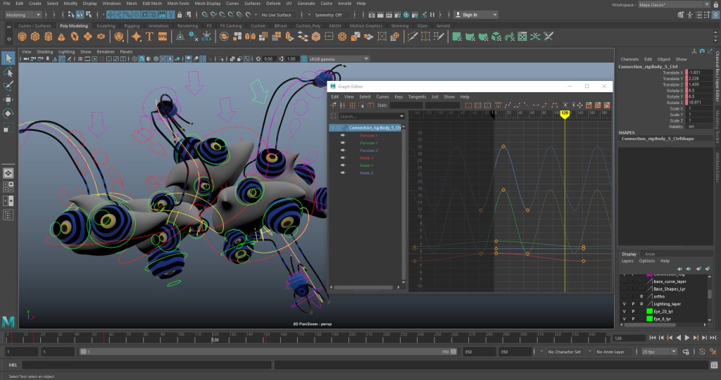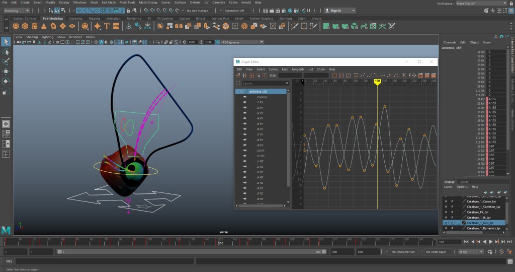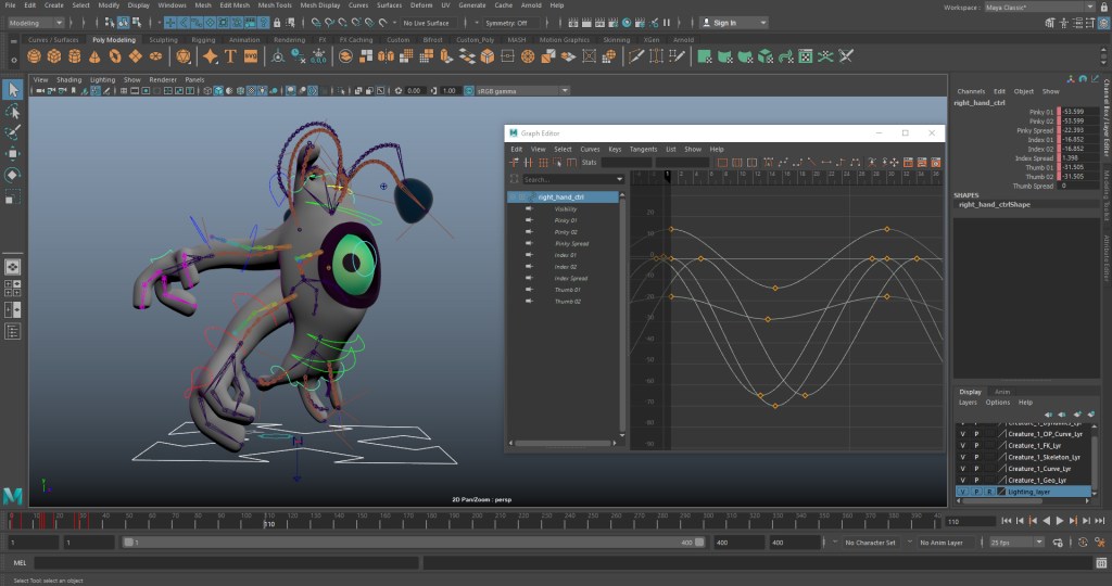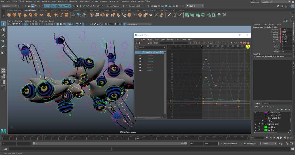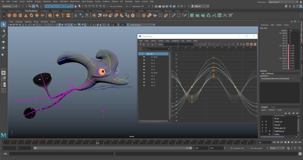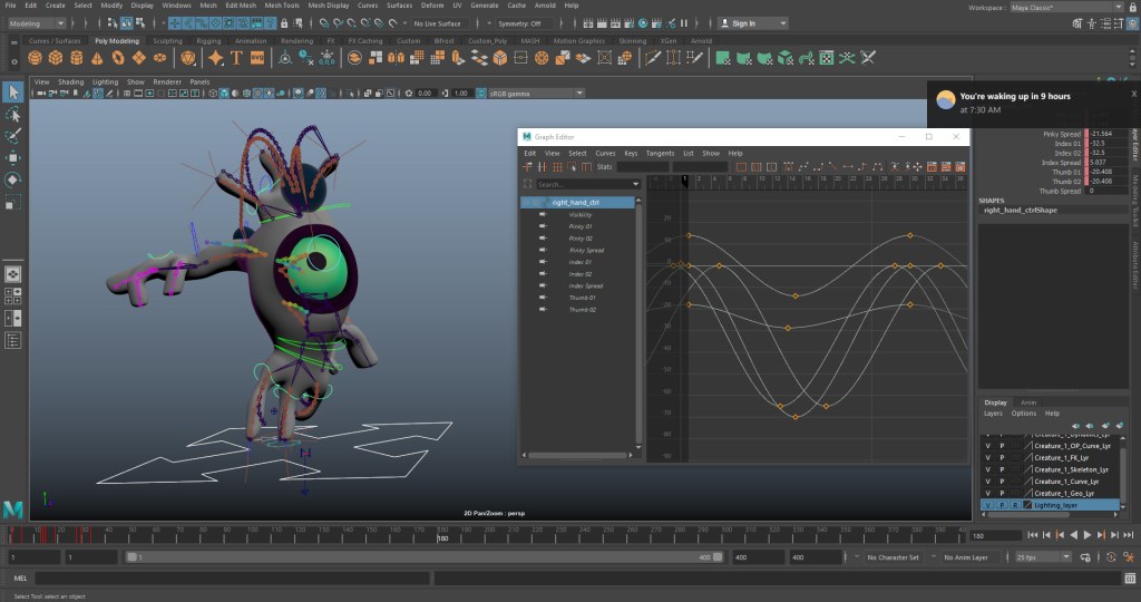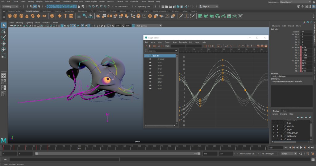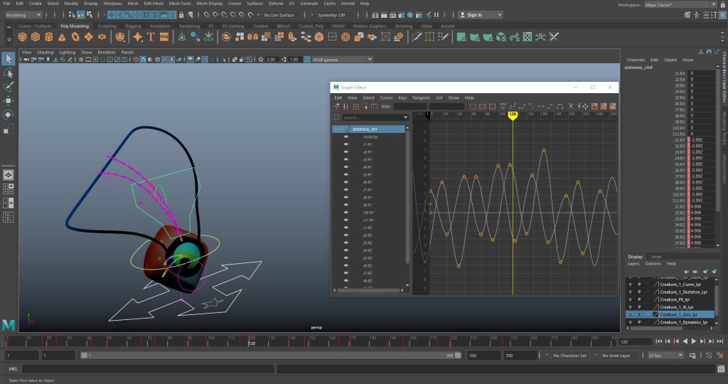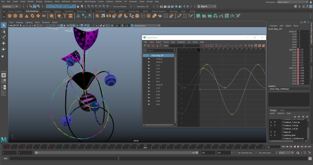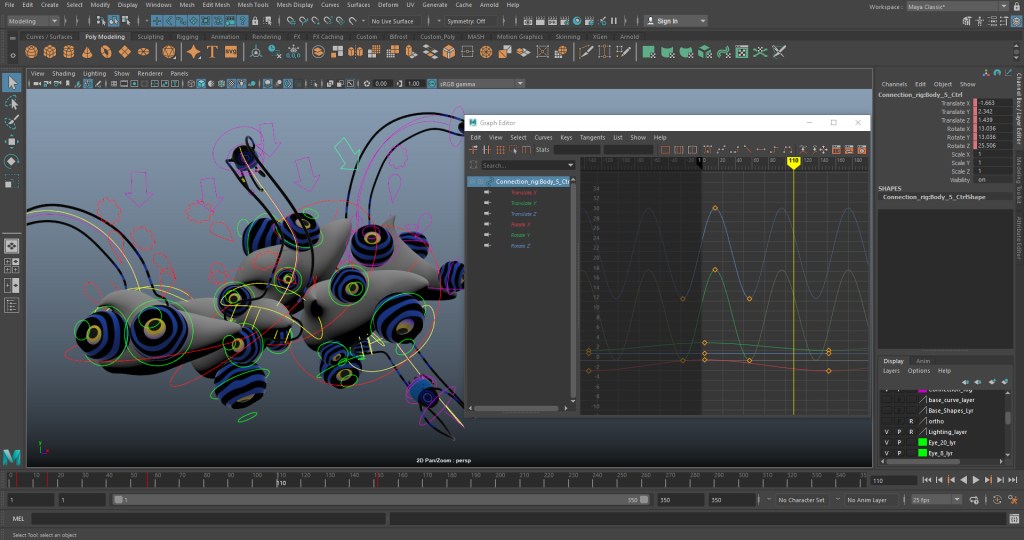 In Maya, you can animate very traditionally, or you can animate based more on numbers and graphs and letting the computer calculate what happens. I was actually working more with the latter method, which might be surprising. Lots of typing in different values to work out how many frames of animation would be appropriate for whatever movement. It’s lots of looking at things that don’t look like animation in the typical sense but are nonetheless controlling what’s happening on the screen. When it comes to final animation, it’s going to be a mix of this and more traditional animation puppetry.