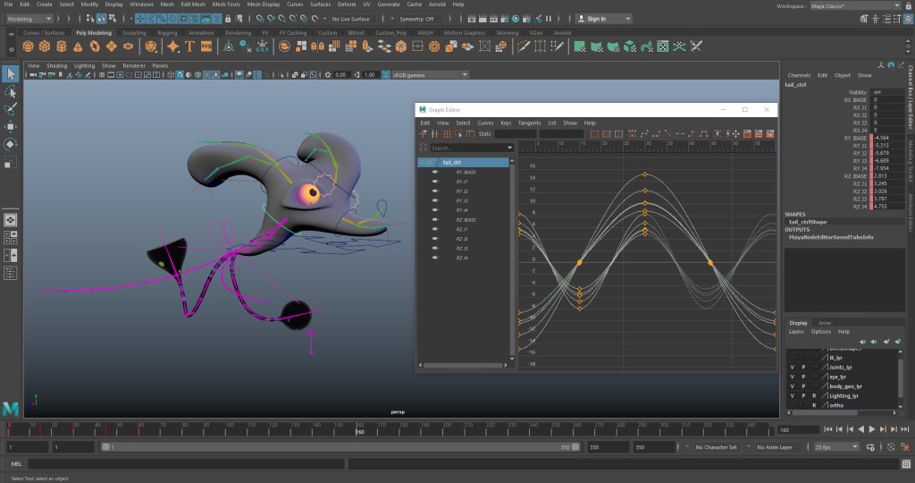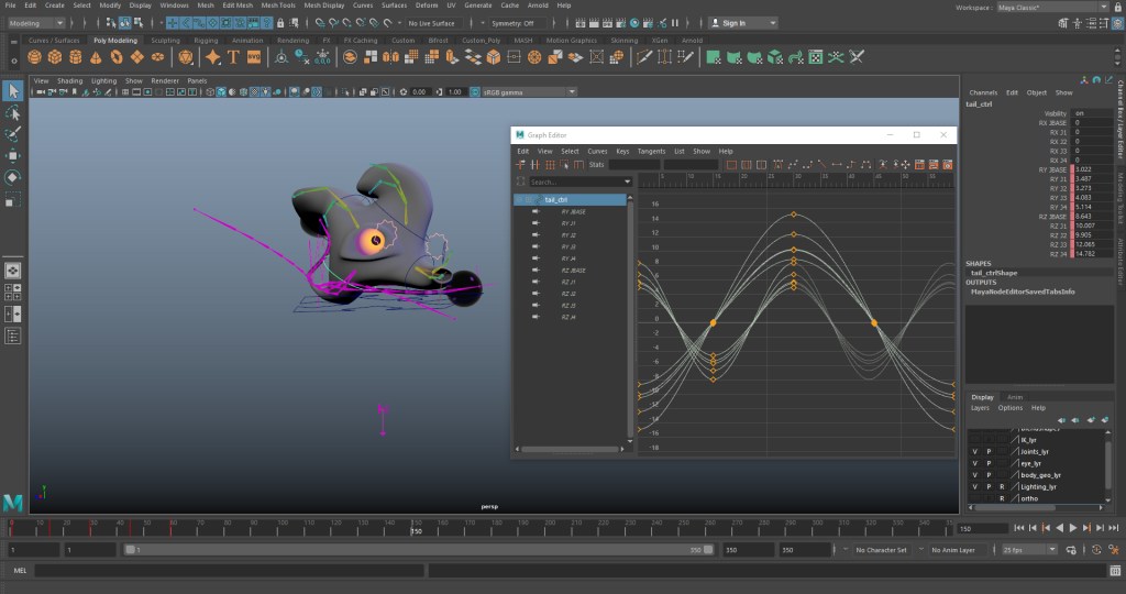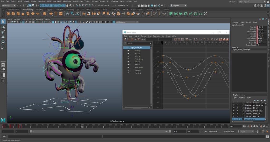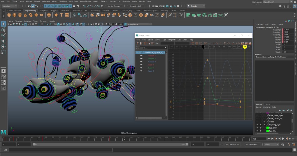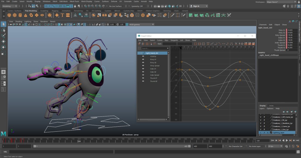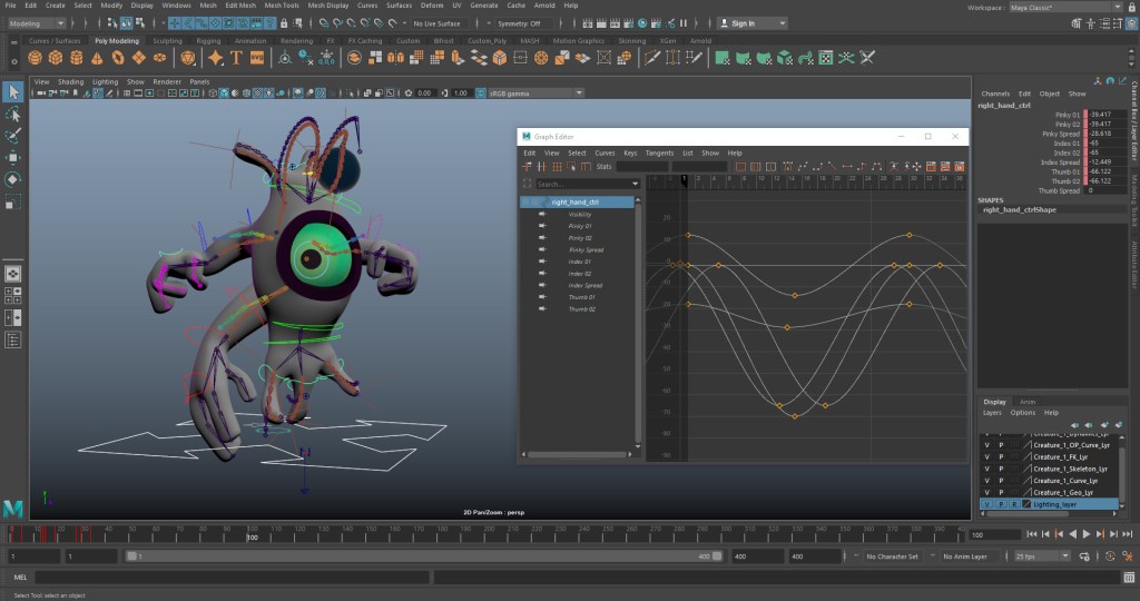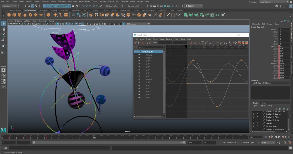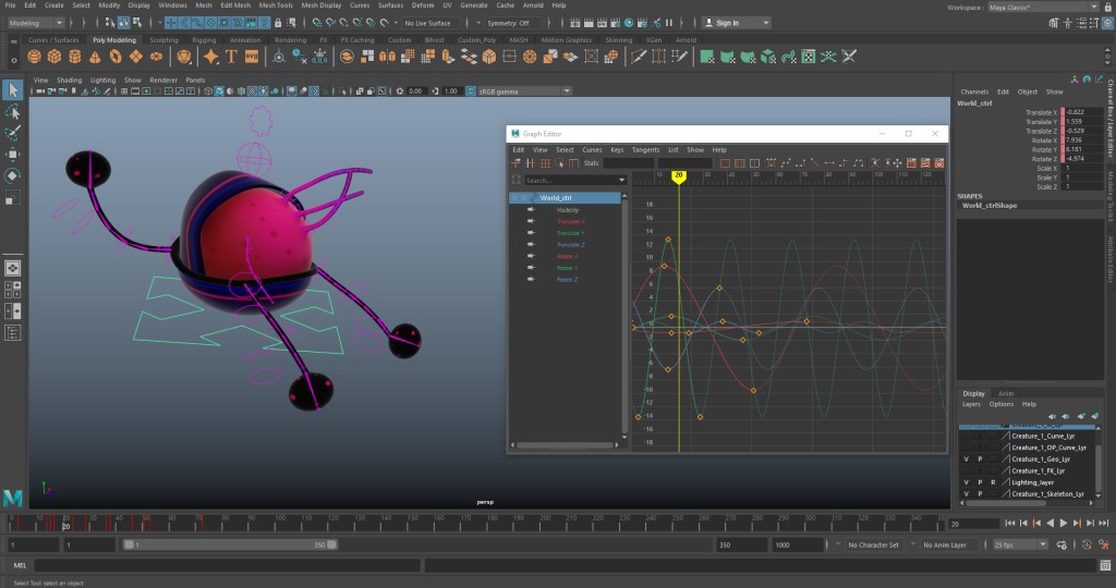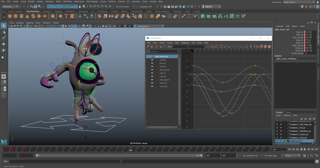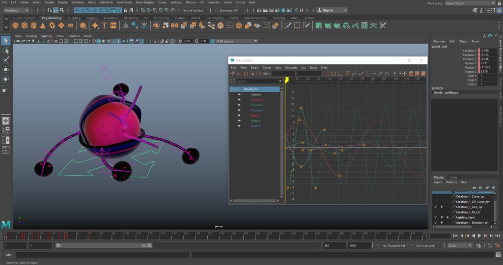 In Maya, you can animate very traditionally, or you can animate based more on numbers and graphs and letting the computer calculate what happens. I was actually working more with the latter method, which might be surprising. Lots of typing in different values to work out how many frames of animation would be appropriate for whatever movement. It’s lots of looking at things that don’t look like animation in the typical sense but are nonetheless controlling what’s happening on the screen. When it comes to final animation, it’s going to be a mix of this and more traditional animation puppetry.