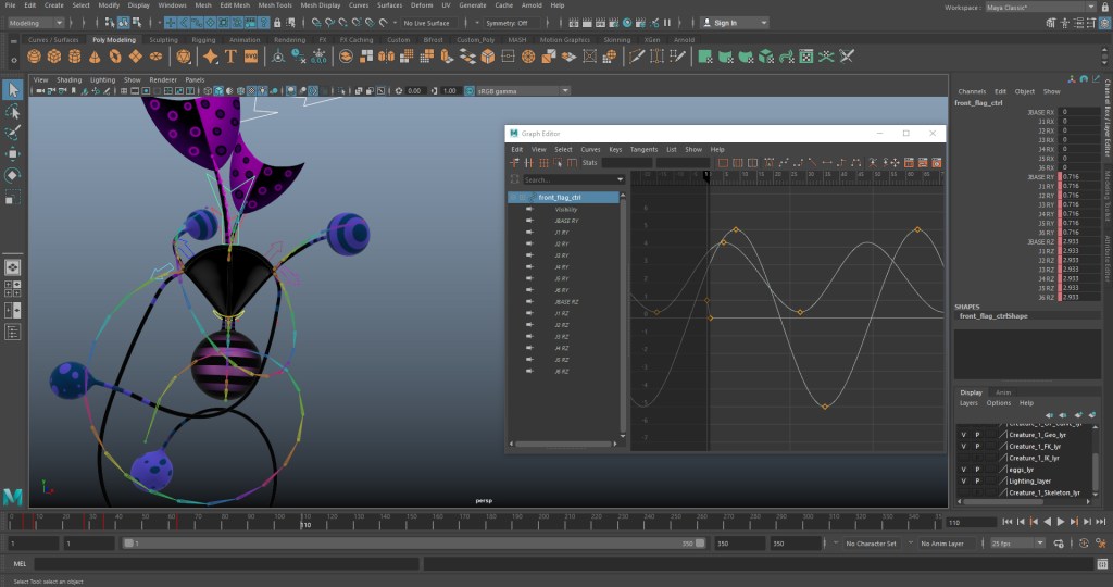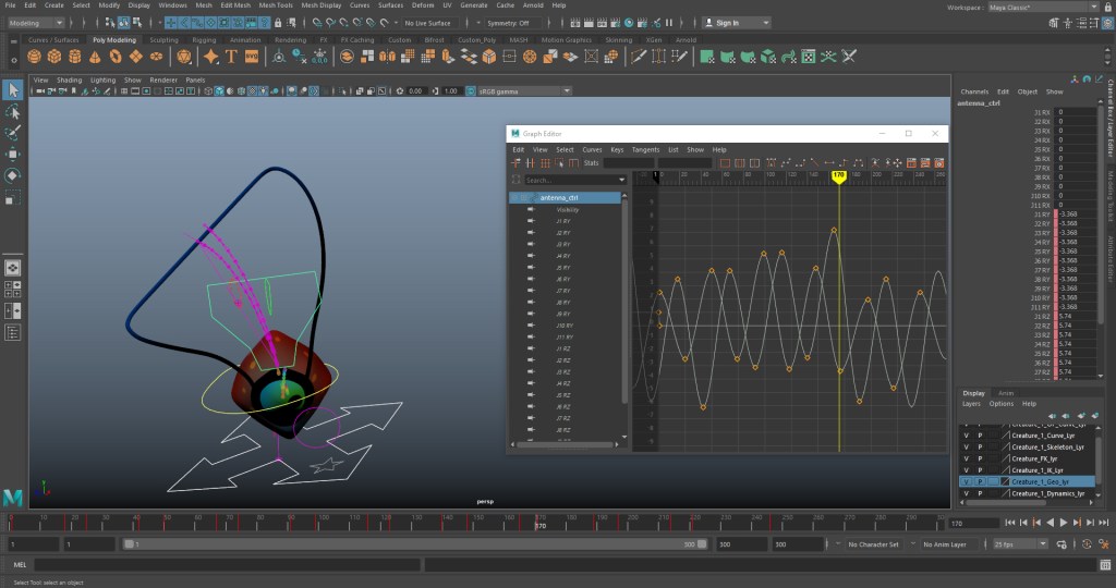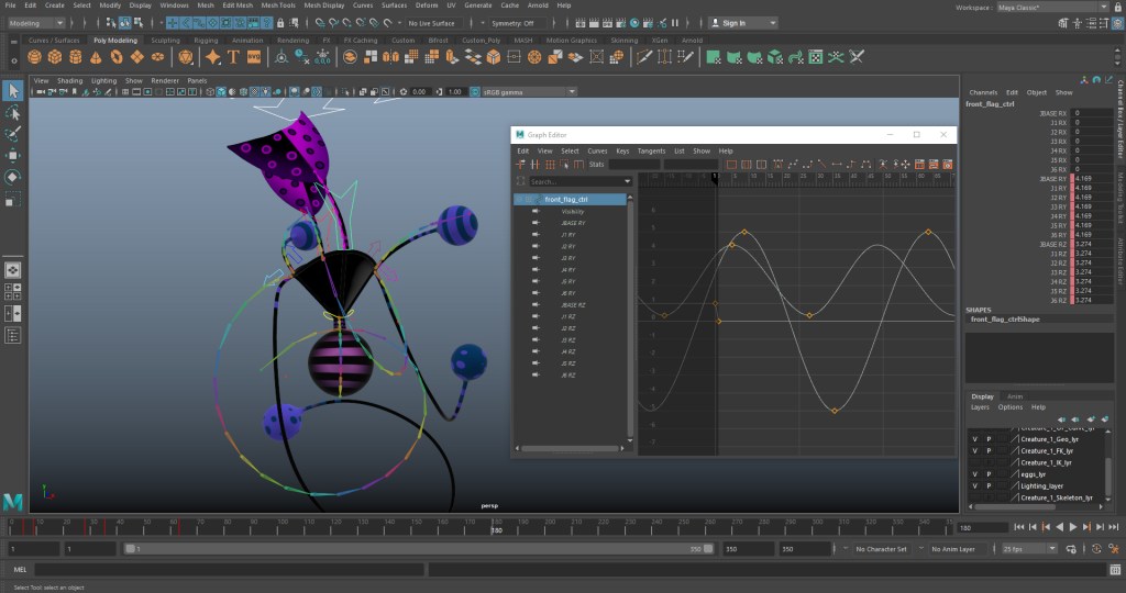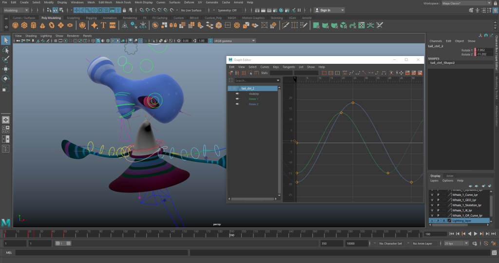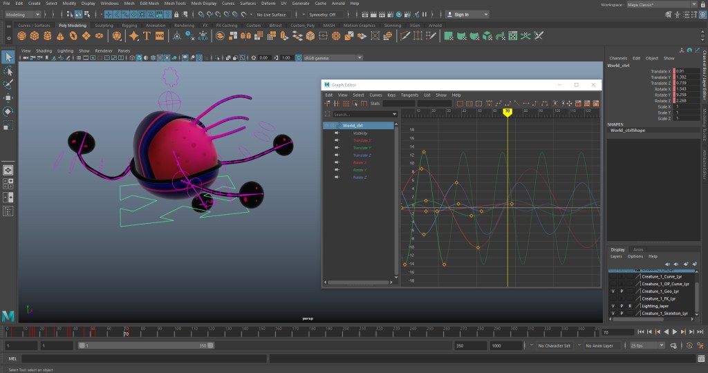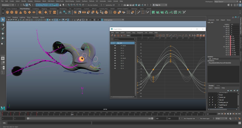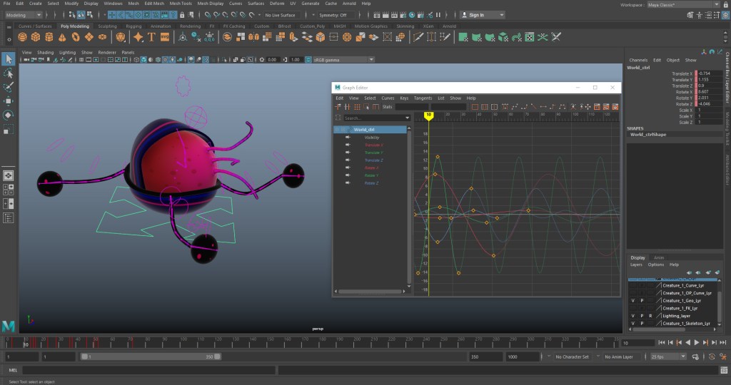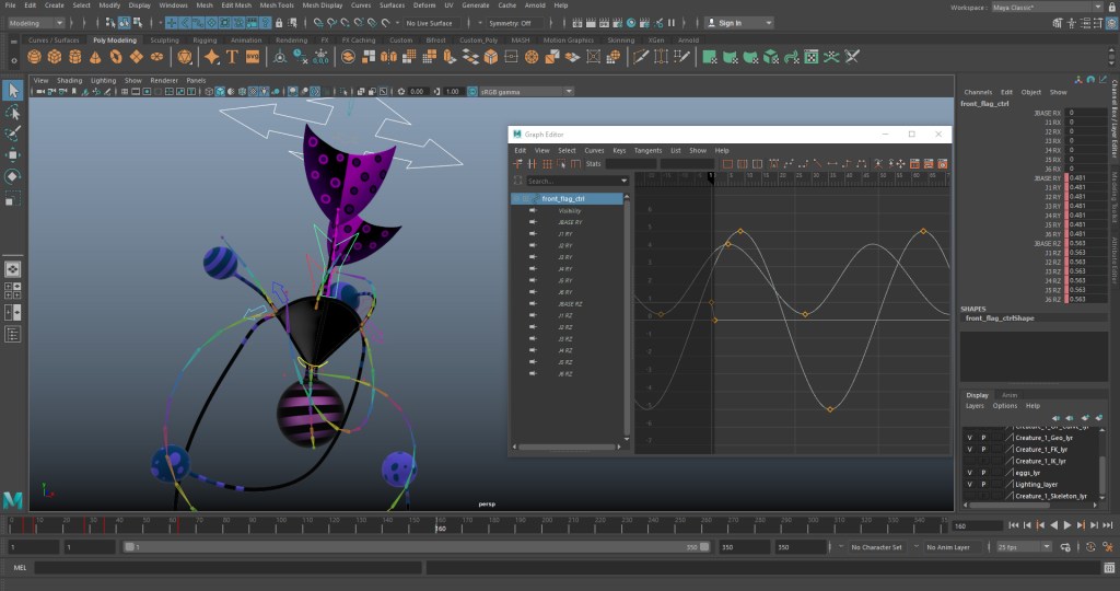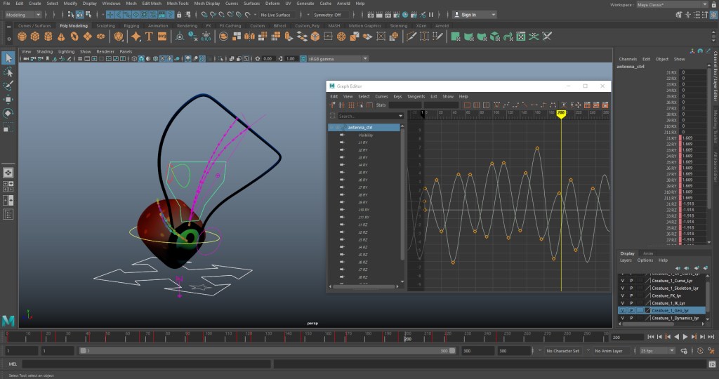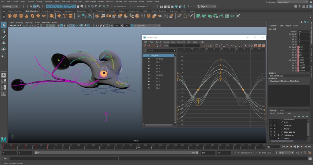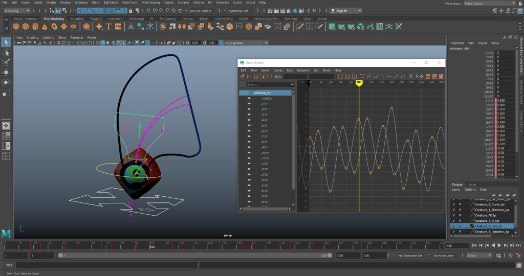 In Maya, you can animate very traditionally, or you can animate based more on numbers and graphs and letting the computer calculate what happens. I was actually working more with the latter method, which might be surprising. Lots of typing in different values to work out how many frames of animation would be appropriate for whatever movement. It’s lots of looking at things that don’t look like animation in the typical sense but are nonetheless controlling what’s happening on the screen. When it comes to final animation, it’s going to be a mix of this and more traditional animation puppetry.
