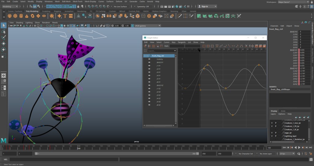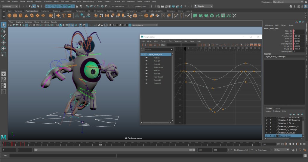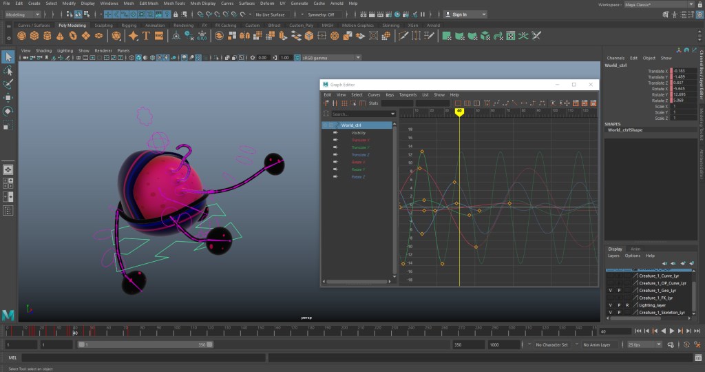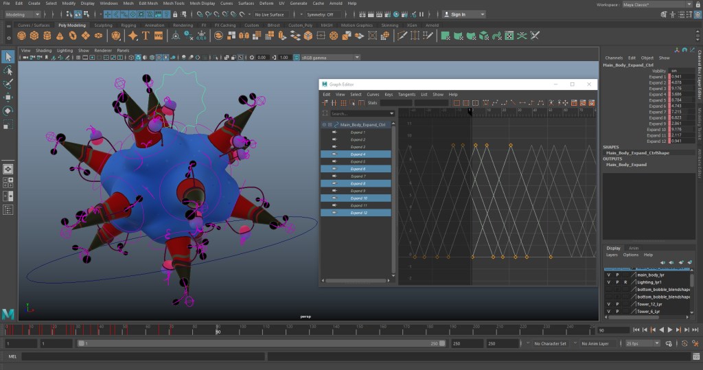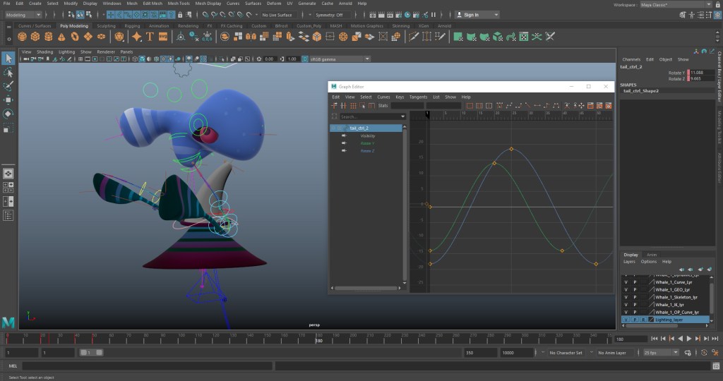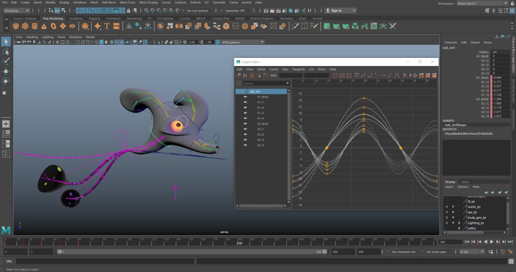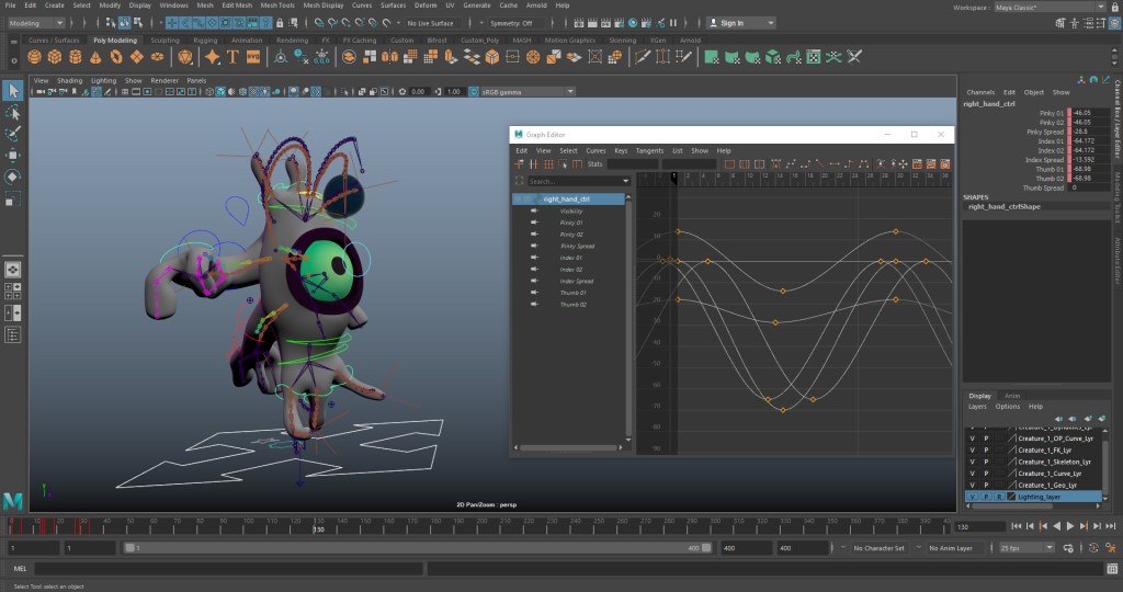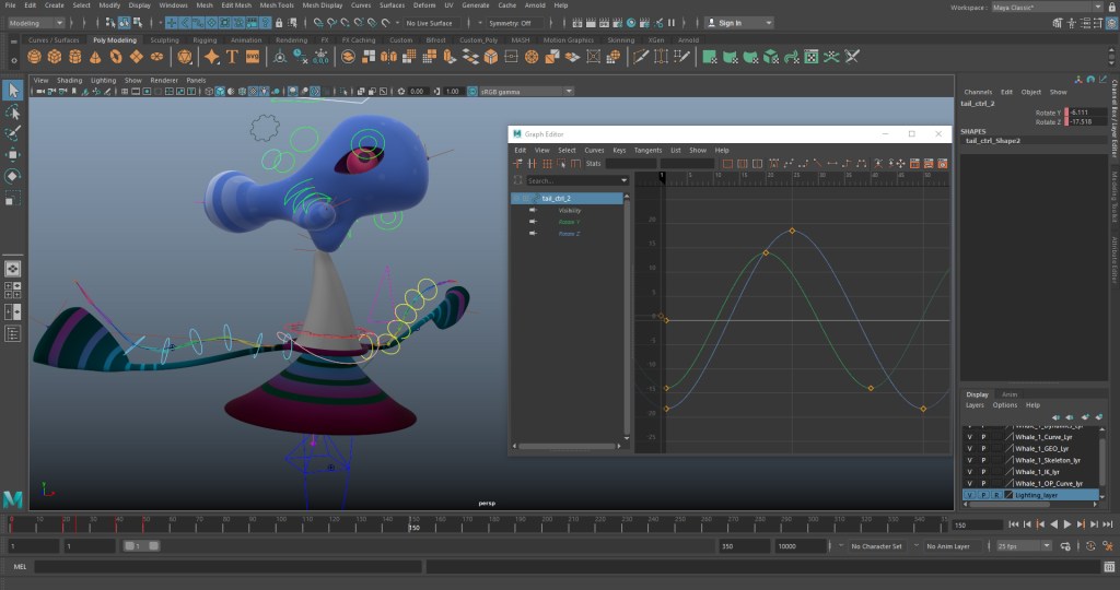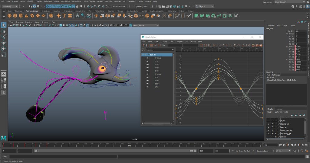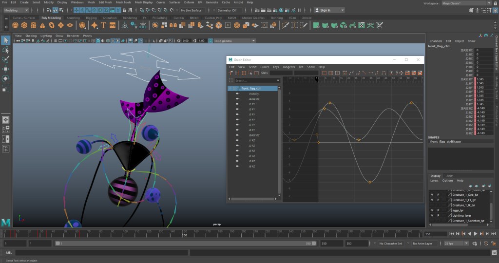 In Maya, you can animate very traditionally, or you can animate based more on numbers and graphs and letting the computer calculate what happens. I was actually working more with the latter method, which might be surprising. Lots of typing in different values to work out how many frames of animation would be appropriate for whatever movement. It’s lots of looking at things that don’t look like animation in the typical sense but are nonetheless controlling what’s happening on the screen. When it comes to final animation, it’s going to be a mix of this and more traditional animation puppetry.