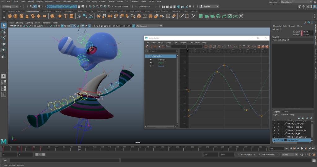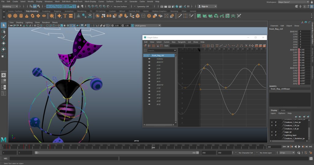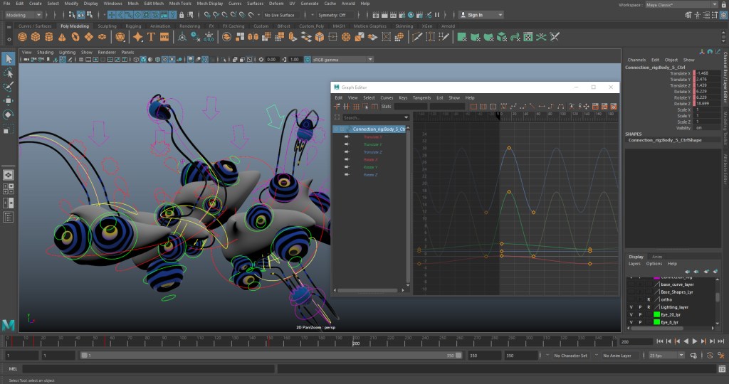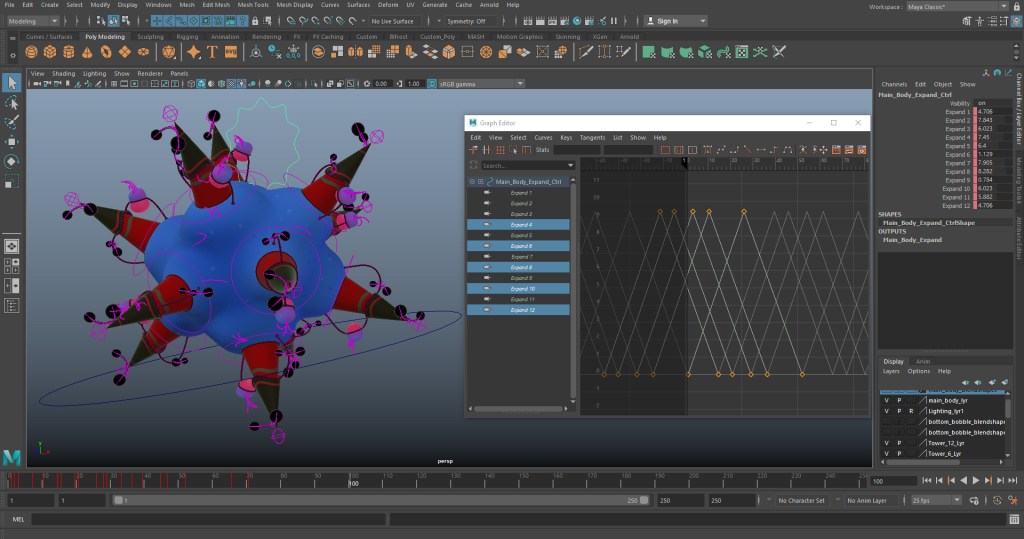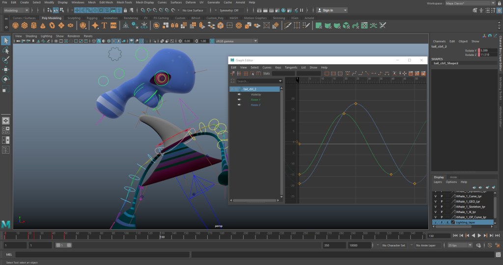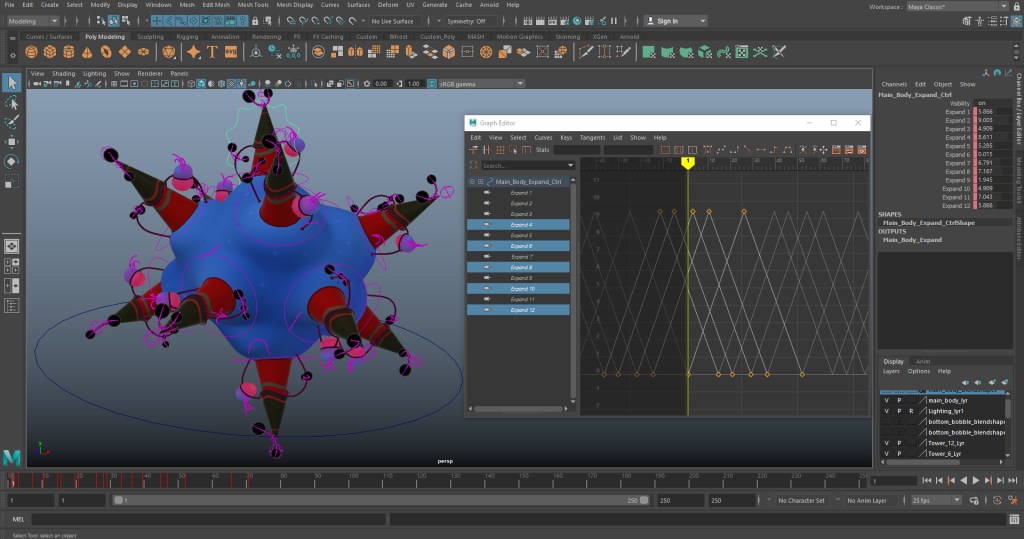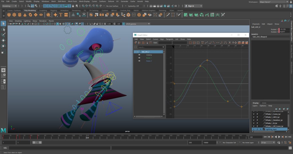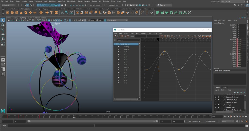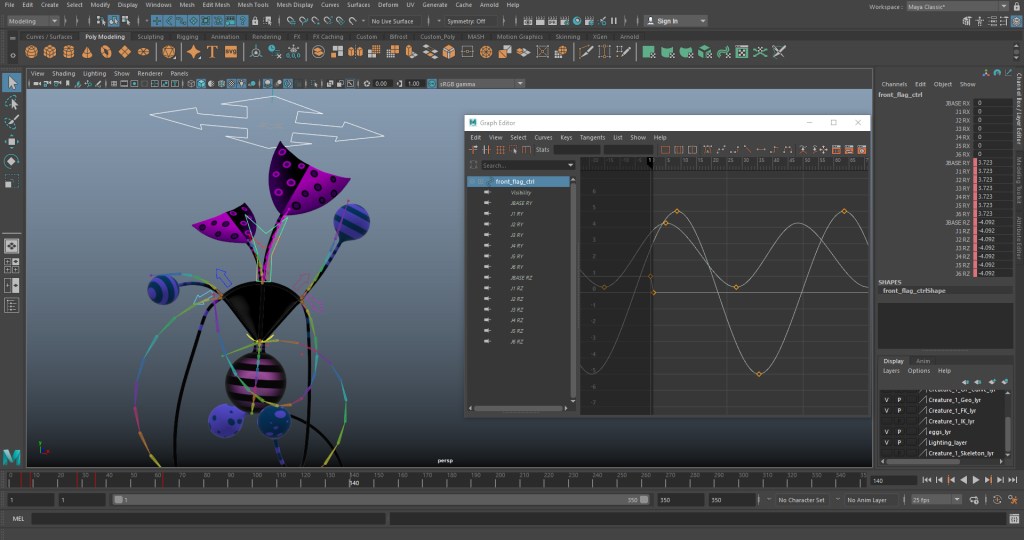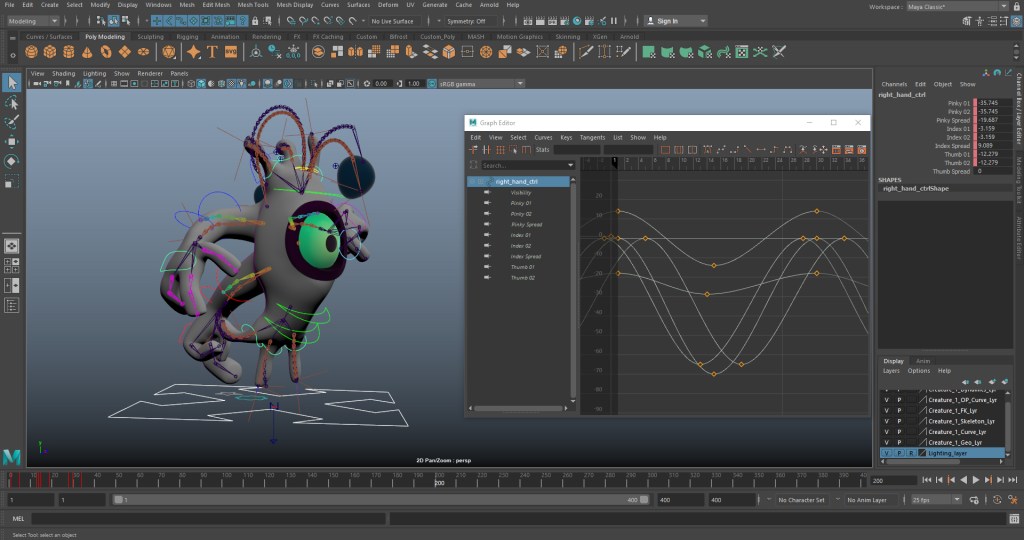 In Maya, you can animate very traditionally, or you can animate based more on numbers and graphs and letting the computer calculate what happens. I was actually working more with the latter method, which might be surprising. Lots of typing in different values to work out how many frames of animation would be appropriate for whatever movement. It’s lots of looking at things that don’t look like animation in the typical sense but are nonetheless controlling what’s happening on the screen. When it comes to final animation, it’s going to be a mix of this and more traditional animation puppetry.