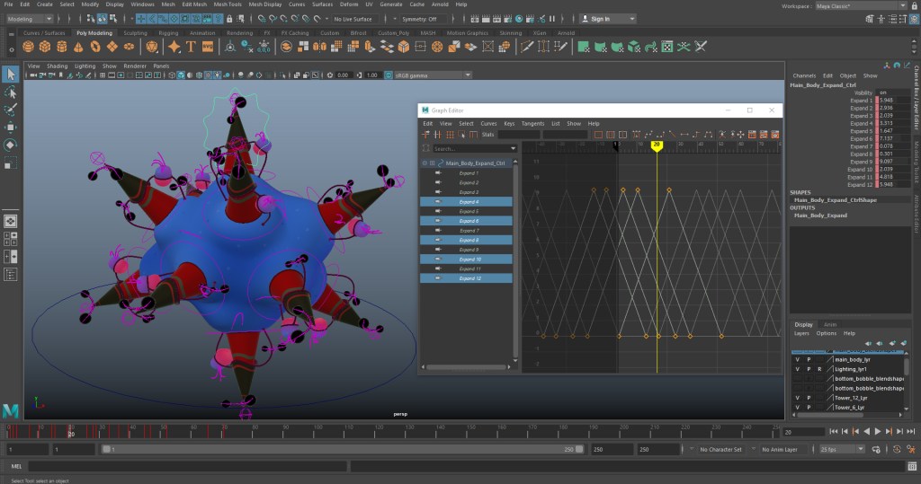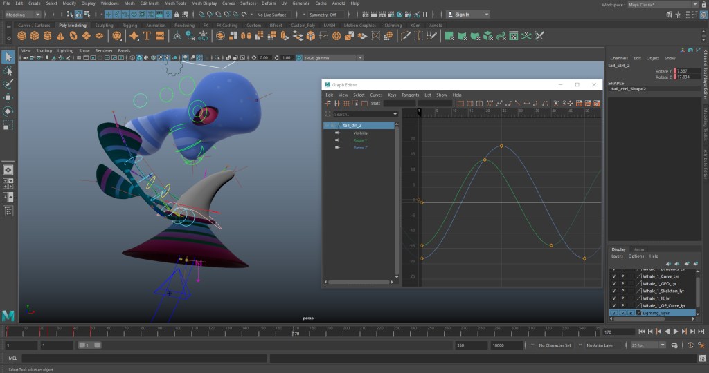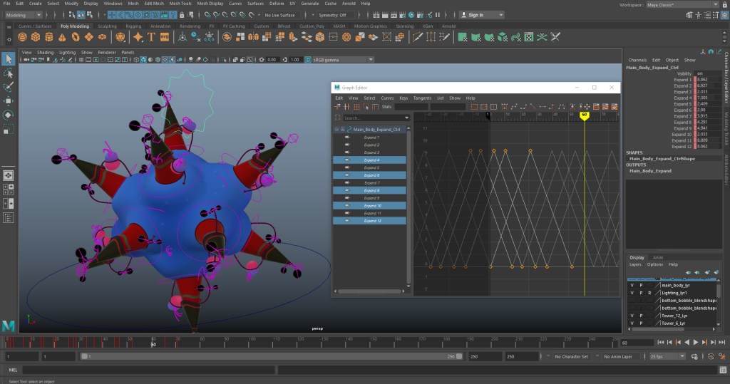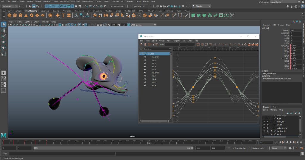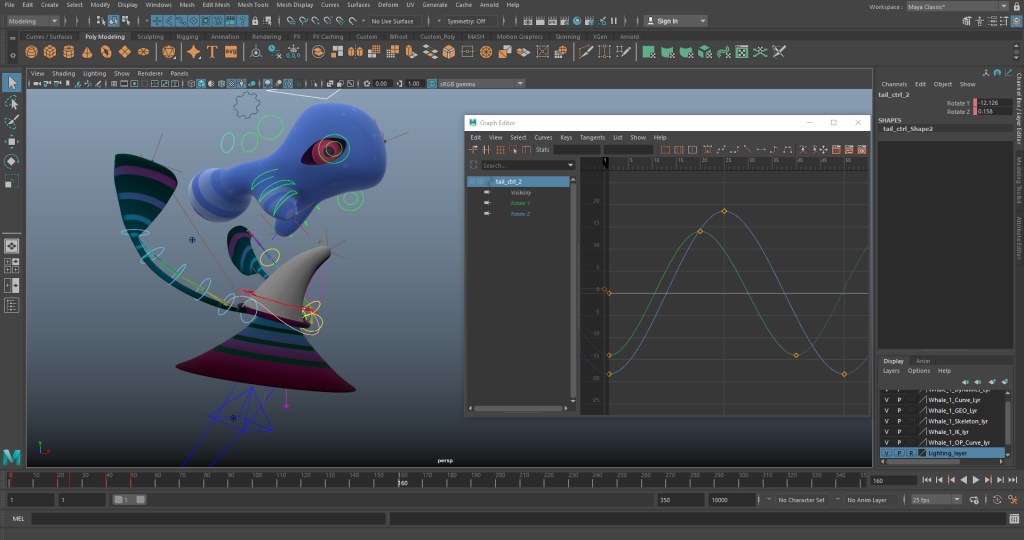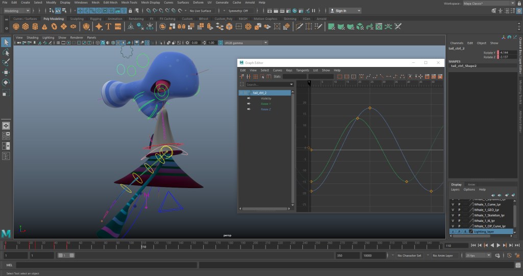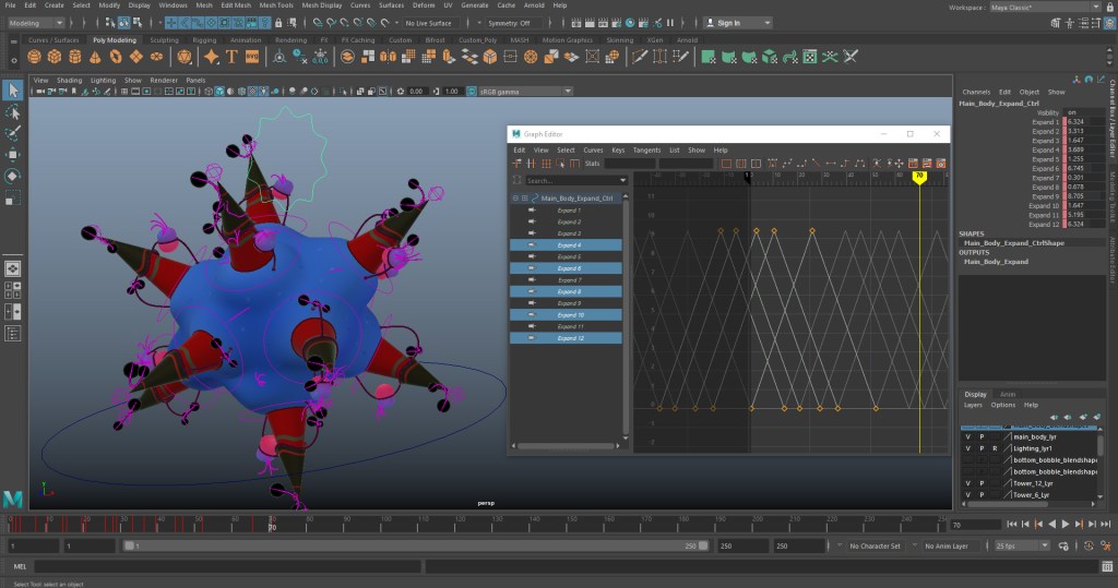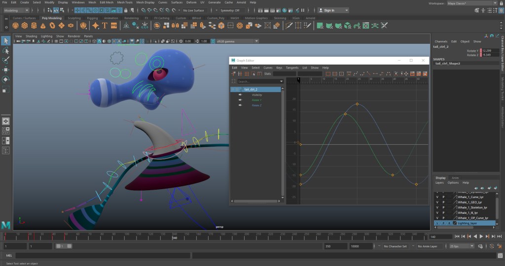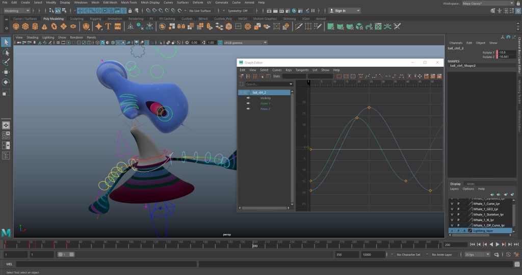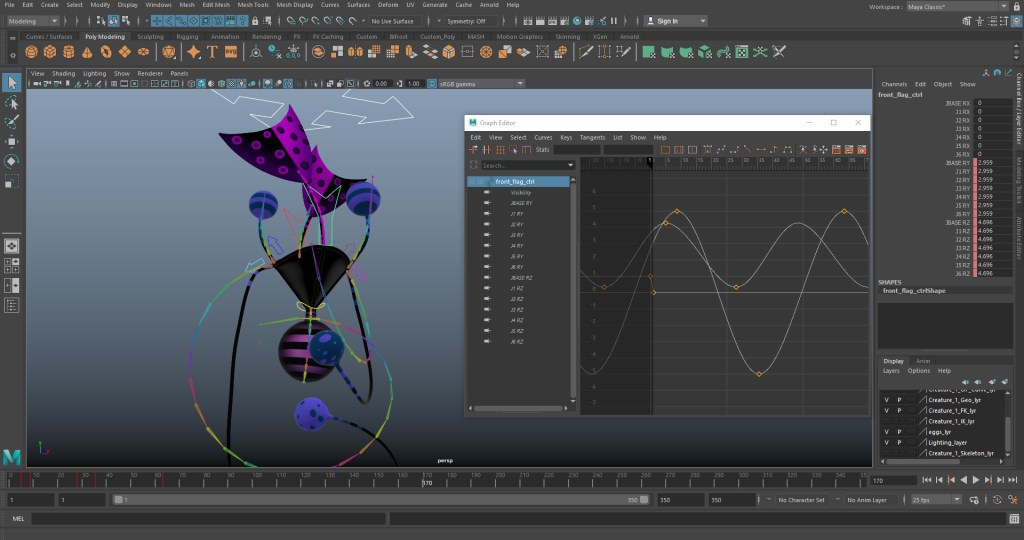 In Maya, you can animate very traditionally, or you can animate based more on numbers and graphs and letting the computer calculate what happens. I was actually working more with the latter method, which might be surprising. Lots of typing in different values to work out how many frames of animation would be appropriate for whatever movement. It’s lots of looking at things that don’t look like animation in the typical sense but are nonetheless controlling what’s happening on the screen. When it comes to final animation, it’s going to be a mix of this and more traditional animation puppetry.