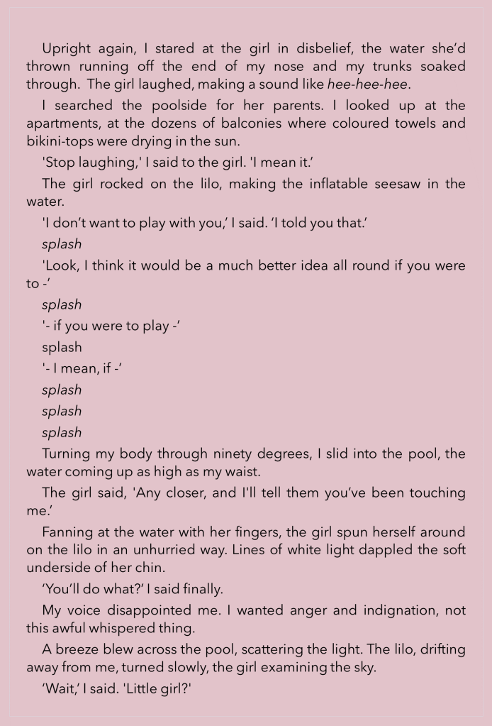 Aged nineteen or thereabouts I went on holiday with my girlfriend, my best mate, and his girlfriend. It was one of those sun, sea and sex holidays – a rite of passage you might say. The core exchange in this story is exactly what happened to my friend and I as we were lying beside the pool minding our own business. Like the resulting story, the episode was over in a matter of minutes, but I can recall even now how disquieted I felt for days afterwards, how entirely unsafe.