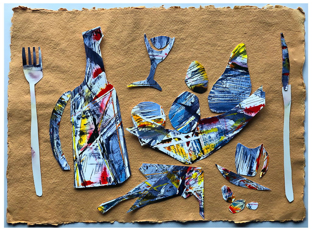 “Here I have made a collage for the new kick-about, “The End of the Meal”. In memory of the Christmas meals at my grandparent house, usually on Christmas Eve, a rather grand affair ending with coffee, brandy, fruit and walnuts and, for us children, homemade ice cream. They had a beautiful dining room with a huge table, a creaking but beautifully wax-polished, sweet smelling, wooden floor and several still life paintings on three of the walls, rather brownish, in heavily carved frames. Fortunately, on the largest wall, there was a wonderful, antique Japanese silk painted screen in three panels, which we all loved the best, and most likely the beginning of my love affair with eastern art. Since then I have drawn and painted and etched many many kinds of still-life, a term which I prefer to the Italian Natura Morta, and learn to love it. In fact, as part of my training at the studio of my Maestro, I drew, then painted and then etched a still life, the same one, nearly every day for an entire year. Clearly not a roast-beef. Despite that, or maybe because of that, still-life became my comfort zone, a quiet place without the challenges of painting people or perspective or busy compositions. For this one I had fun. I used “left-overs” paintings just placed down, ready to be cleared up at any moment.”