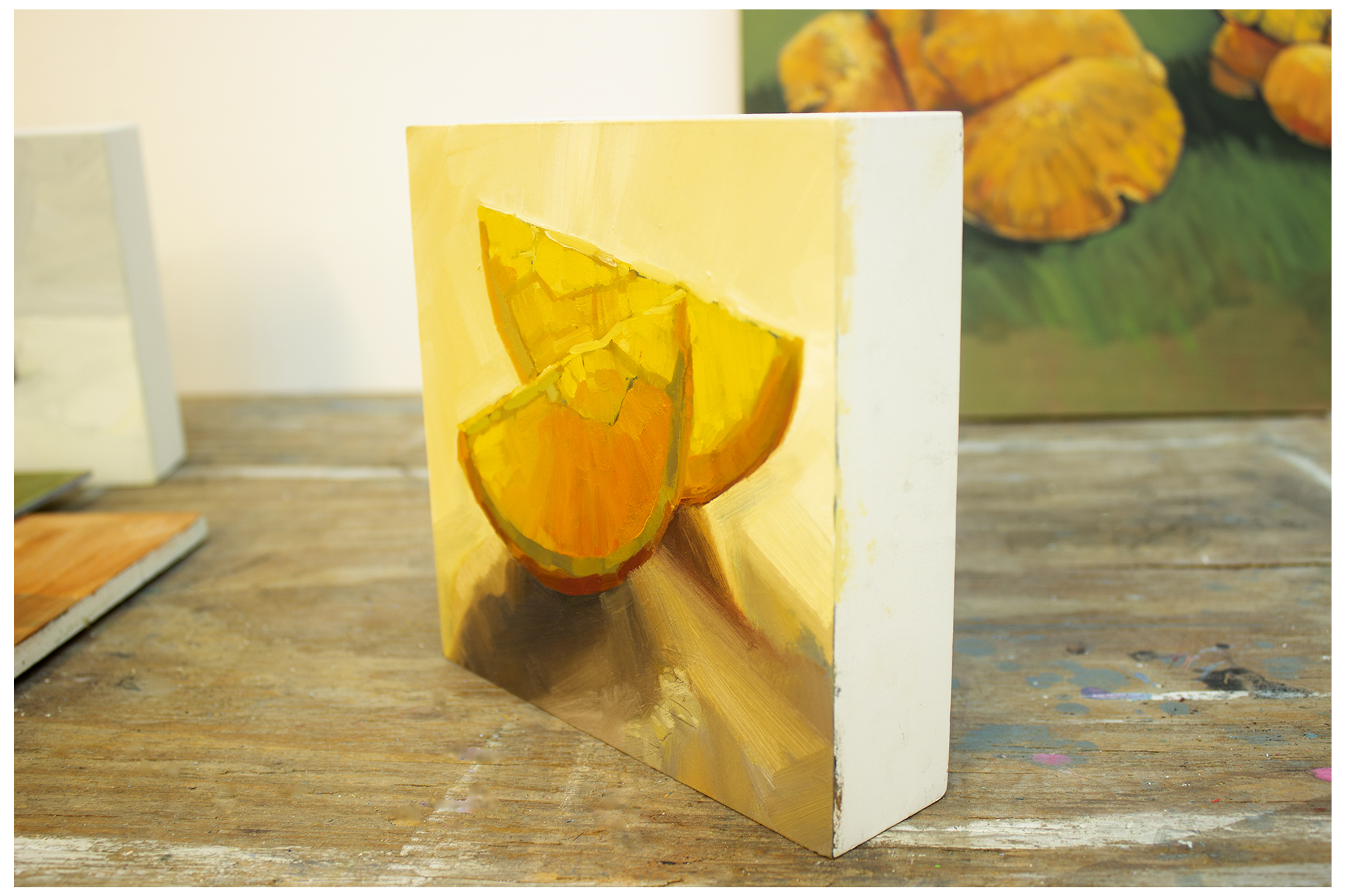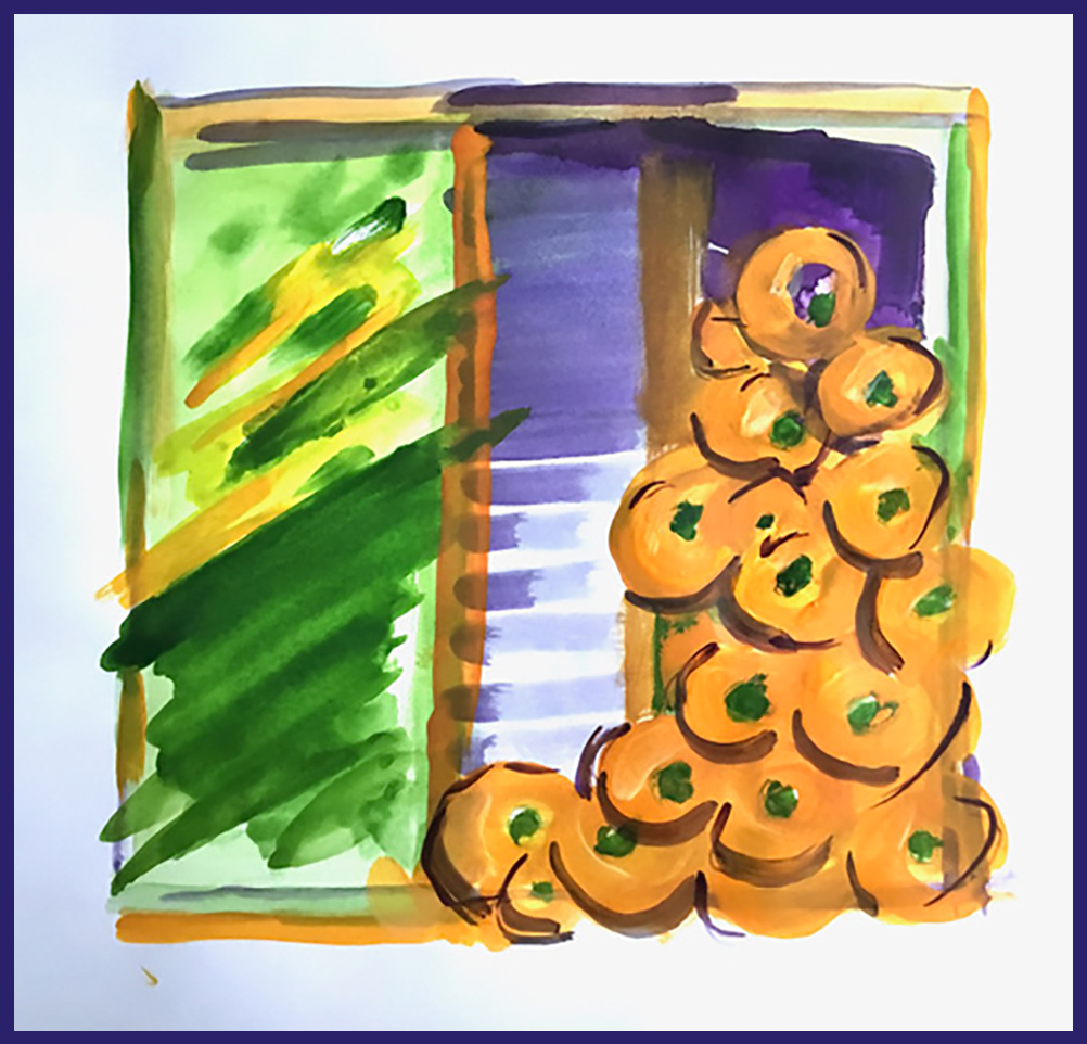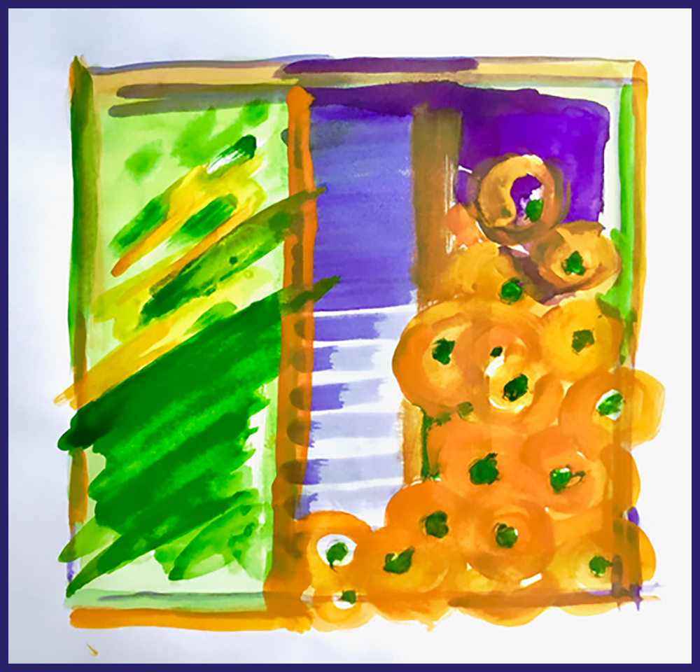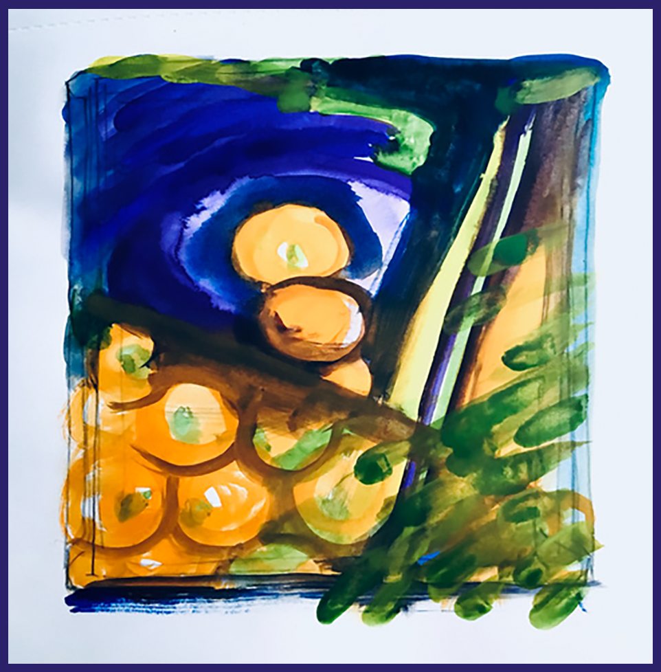 “I remember, as a child, hauling extra quantities of clementines up the road in my mother’s basket on wheels. We never seemed to have enough for the 14 aunts and uncles that filled our Christmas dinner table. The peels were scattered over the table in profusion. I think the reason for so many was that when my parents were young their only present had been an orange – such a scarce and valued piece that it was the centre of their Christmases. So for them, Christmas needed to be full to the brim with orange. My orange theme then reminded me of Mexico and the orange abundance of marigolds strewn everywhere to celebrate, not only the Day of the Dead, but also the coming of Christmas just round the corner. So the last few dabblings in this idea are more impressionistic with a nod to Howard Hodgkin for these oranges escaping my frames in gay abandon. Happy 2021.”