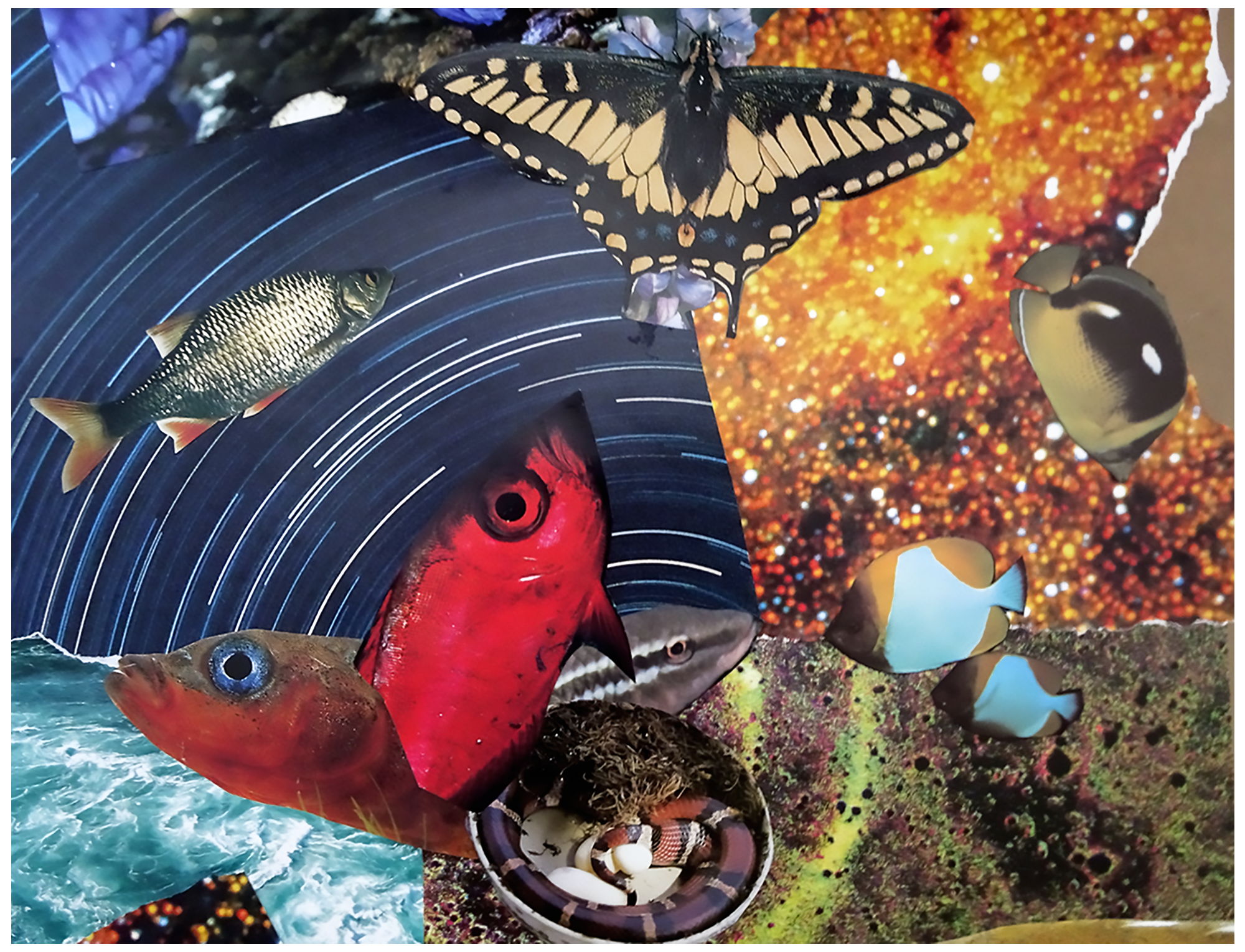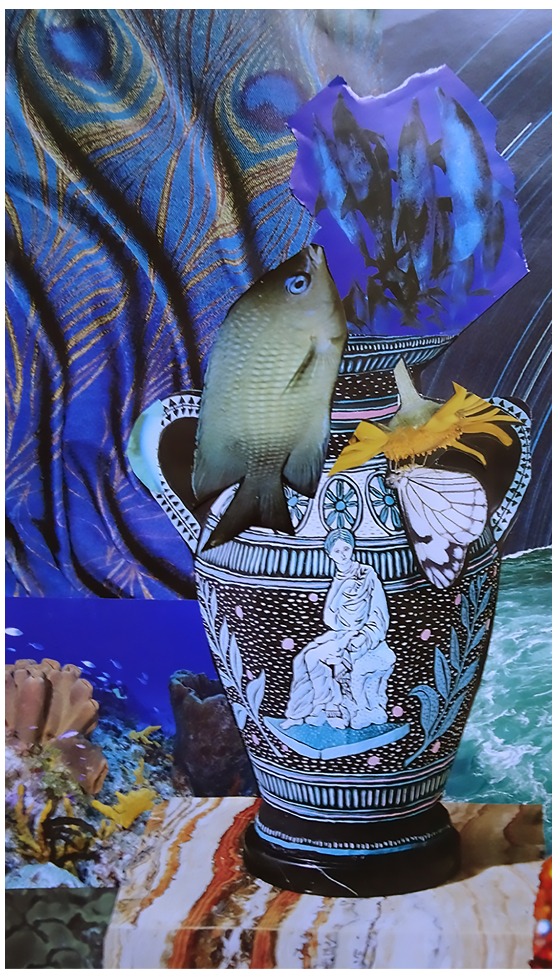 “My first impression of this still life was gluttony – and I originally planned a collage with lots of food. but when I started pulling images out of my collage box, as is so often the case, the composition decided to go somewhere else. Fish? Butterflies? Snakes? Blame it on the vase goddess.”