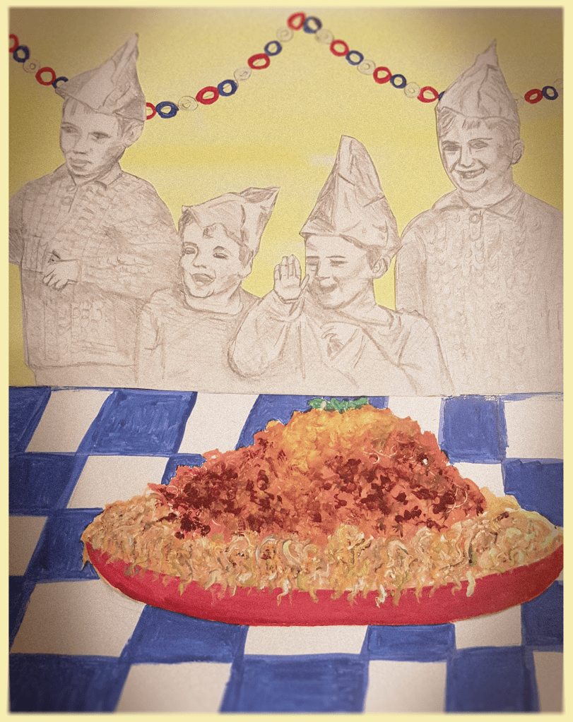 “Just before the latest lockdown I was mooching around our new local second-hand bookshop and I came across a book entitled ‘A Wartime Christmas’. It was a compilation of the memories of various people from all parts of Britain who related how they spent the festive season during WWII and had chapters with headings such as’ Gert and Daisy’s cheap Christmas pud ‘ and ‘They tied a label on my coat ‘or even ‘Beethoven ‘s Fifth with accompanying sirens!’ These are the type of stories I find absolutely intriguing and needless to say I had to buy the book. Although Fernand Leger’s still life with roosbeef was done in 1951, his work still has the austere look of the war years about it, and in fact rationing didn’t finish until 1954. On the front cover of my Wartime Christmas book is a wonderful photo of four cheeky little boys in hand knitted jumpers and paper party hats. They were in fact two sets of orphaned twins, aged 3 and 6, whose father was lost on the torpedoed aircraft carrier, Courageous, and they were destined for Dr Barnardos Home. I thought they would be lovely to sketch and perhaps they would prefer the beef to be minced up and served as spaghetti Bolognese – or perhaps during the war it would have been Cottage Pie?”