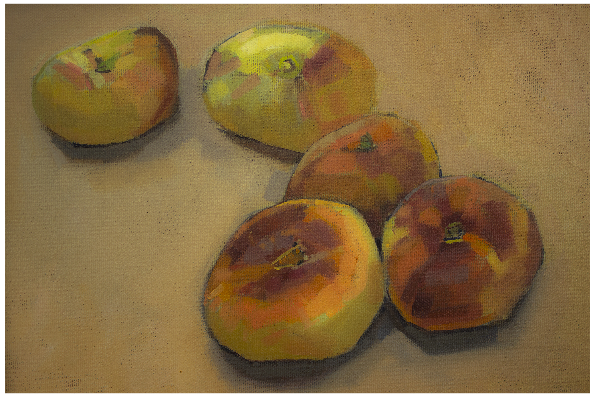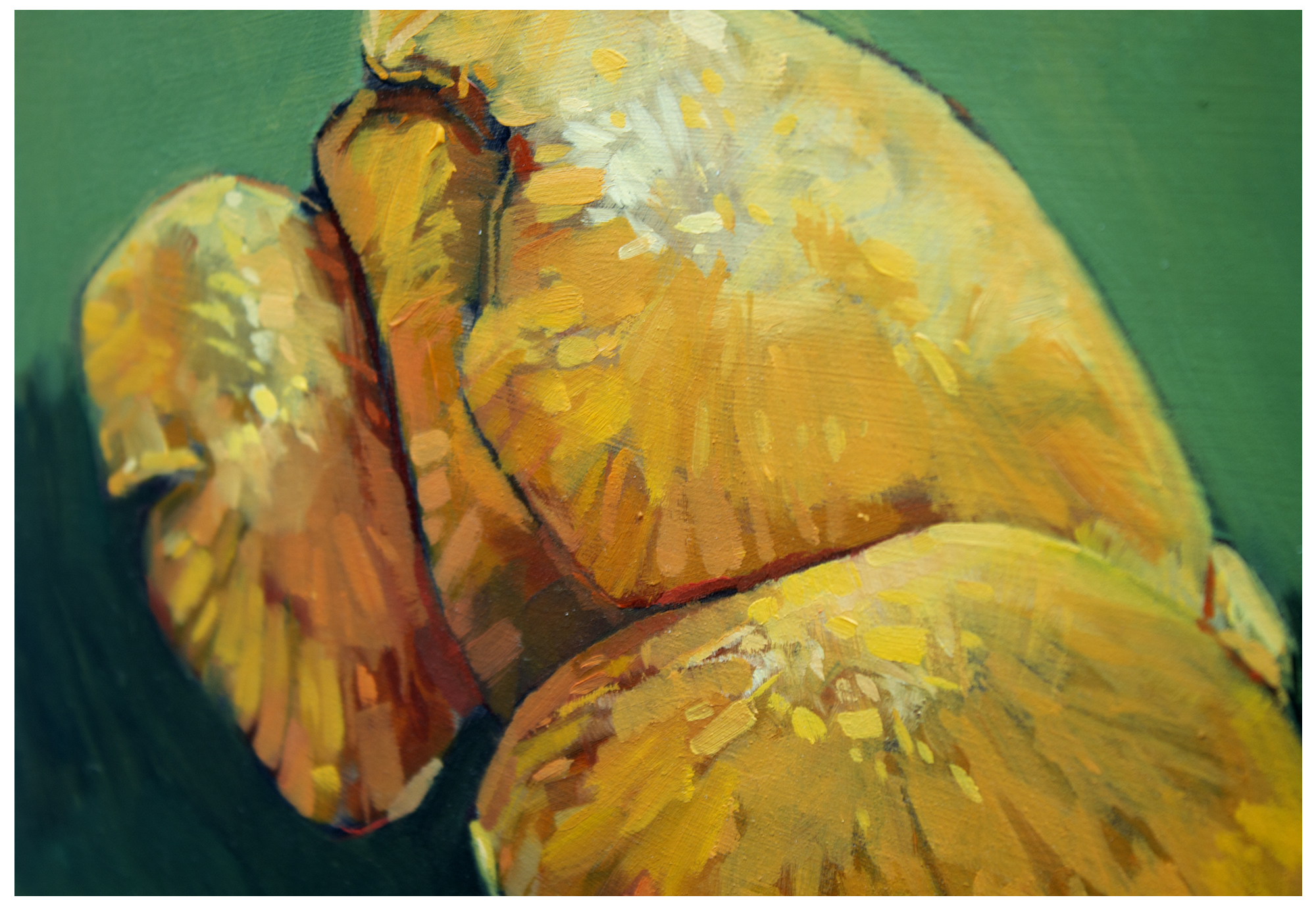 “With the holiday now firmly in the past, it seems fitting to celebrate the sacrifice which lead to so much decent feasting. Leger’s prompt of colour and the ordinary stirred up this reflective composition, which in part celebrates a Polish Christmas on the 23rd with its attention to seafood. Although a difficult year for many, it ends with emphasis on a simple pleasure most commonly enjoyed as a shared experience – healthy eating! Happy new year to our fab’ host and to all enjoying Kick-About.” Oil on prepared paper 65cm x 50cm.