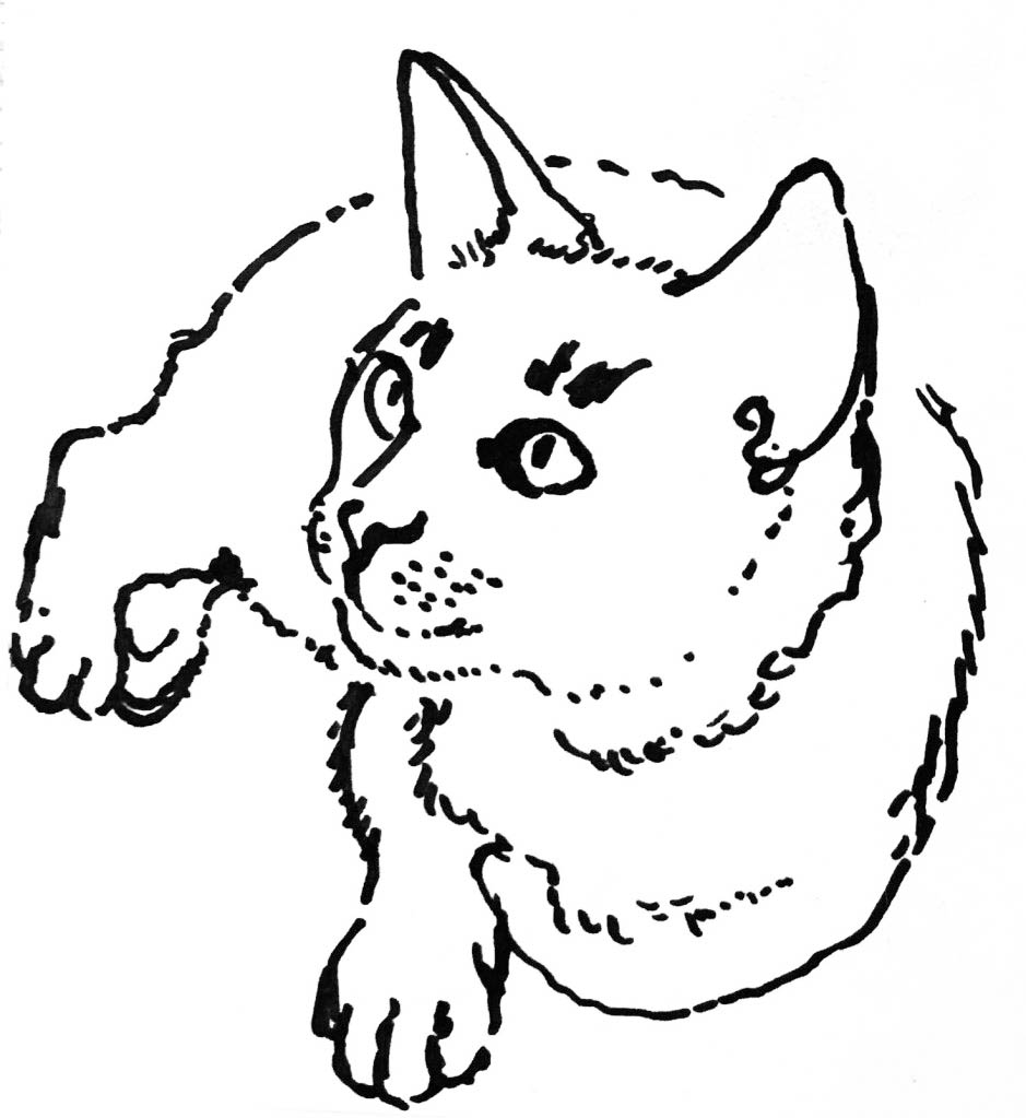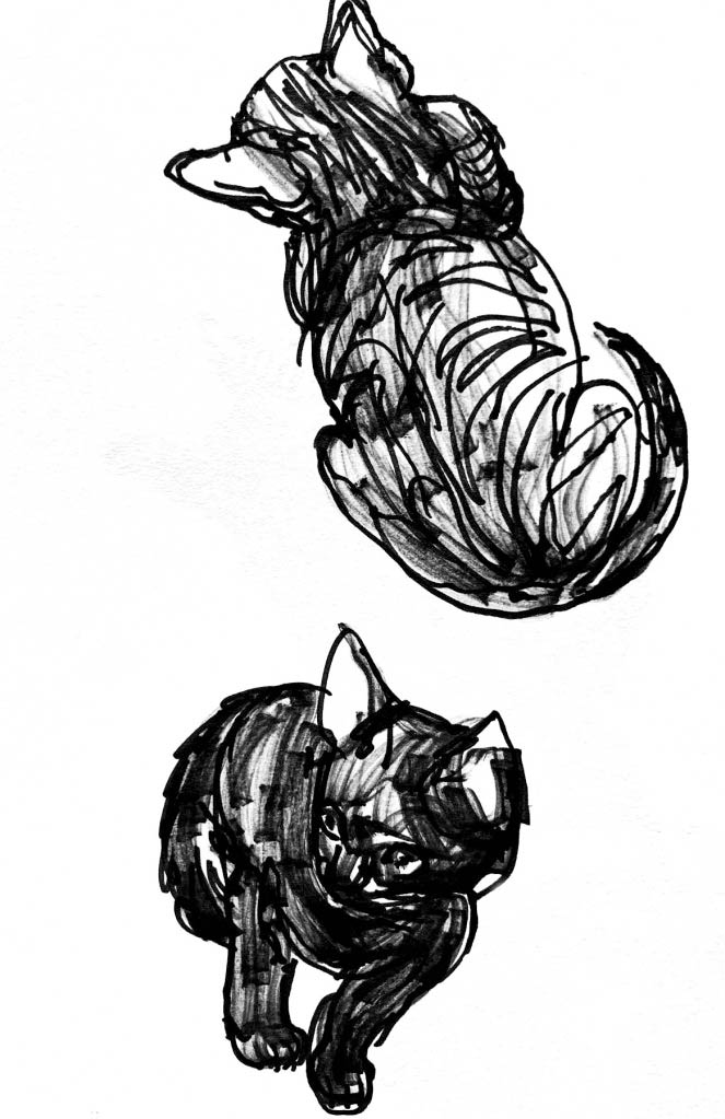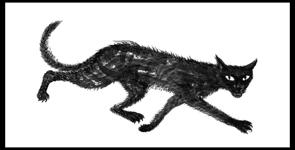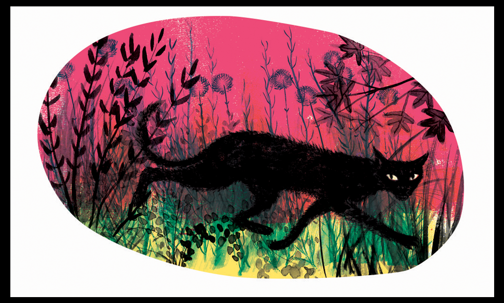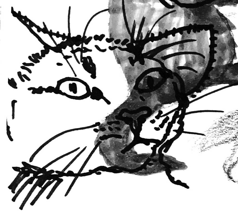 “Technically these guys once were wild, having been picked up as strays. But at the same time, they were affectionate and tame. So they are not really my response to this prompt. My response was, I think, a little influenced by a far superior cat painting, by William Kentridge that is on the wall of my studio. But really it was just a fun play about with ink. Fairly large scale on cartridge. I swished up a few garden plants for him to prowl in. Then combined the two in Photoshop. I altered his head and paws a bit to bring him into a more domestic cat proportion, and out of the original, more expressionist type. He represents the suburban animal who is both wild and tame at the same time. Every time he goes outside, he becomes his own heritage, a wild animal. Our gardens are his hunting ground. It is a fascinating thing, albeit devastating to our wildlife.”