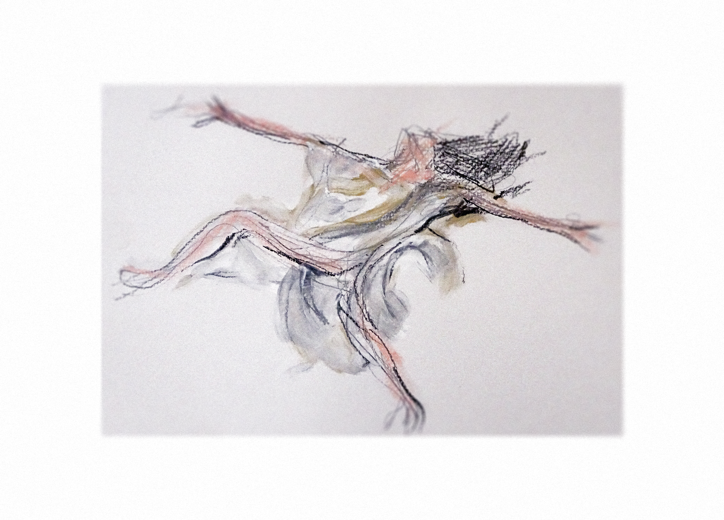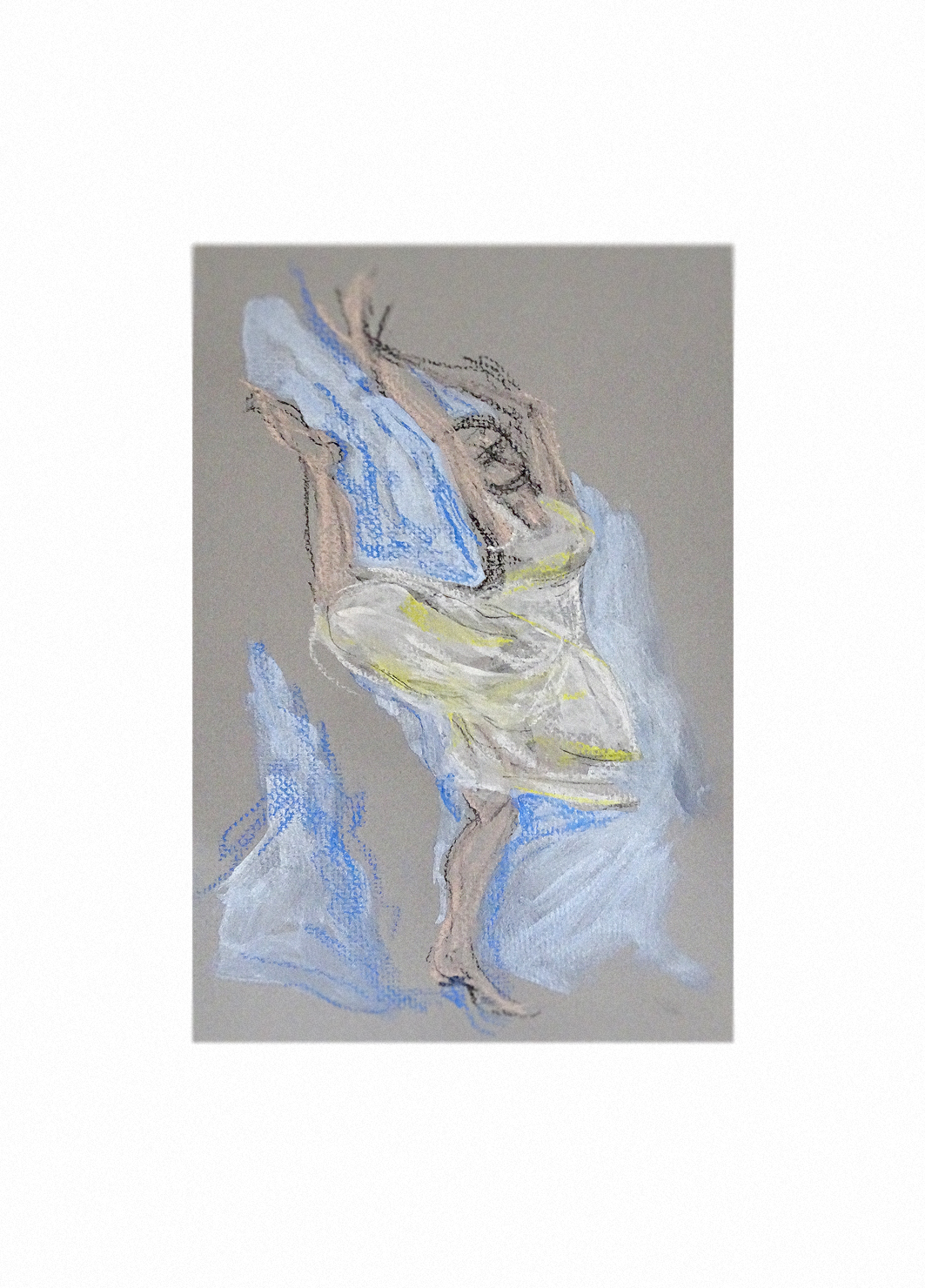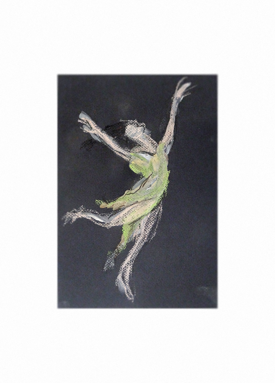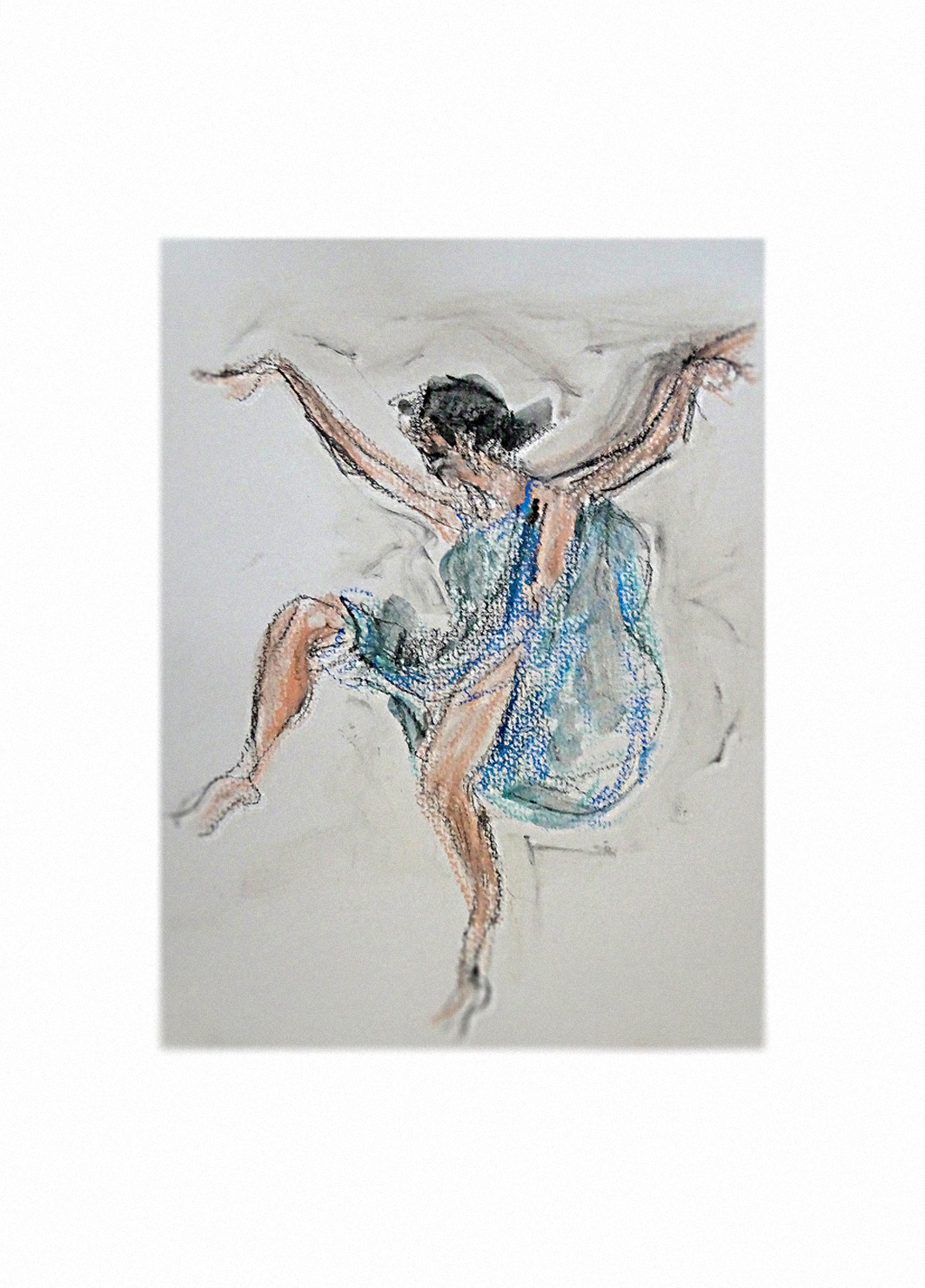 “I had a totally different idea of what I wanted to do with this, involving collage, but the photos of Duncan dancing made me want to try to first capture the movement in drawings. I ended up pulling out pastels I hadn’t used in probably 40 years that happened to be in my watercolor bin. There’s a reason Degas used pastels for his dancers–but having no fixative, there’s also a reason I haven’t used them in awhile. Right now they are hanging on the wall where they won’t smear until I get something to spray them with. I still have the collage idea filed away for some future project…”