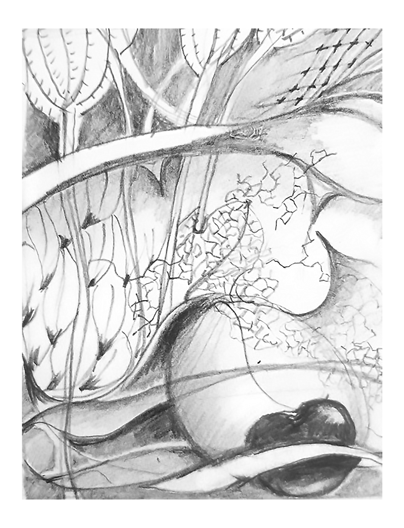 “Weirdly enough I’ve chosen this..a tough call but although I loved putting together the installations I only record them as 6” X 4” photos, which are then put into a KA book as a record. However, I do have my drawings, so could take a better photo, as they’re bigger! I chose this as it WAS tedious in its repetitive way, but after a while it became a form of meditation, and I was happy with the outcome, which is rare. Actually I could have chosen any as far as enjoying the process goes, so onwards to the next…” Graphite on Fabriano.