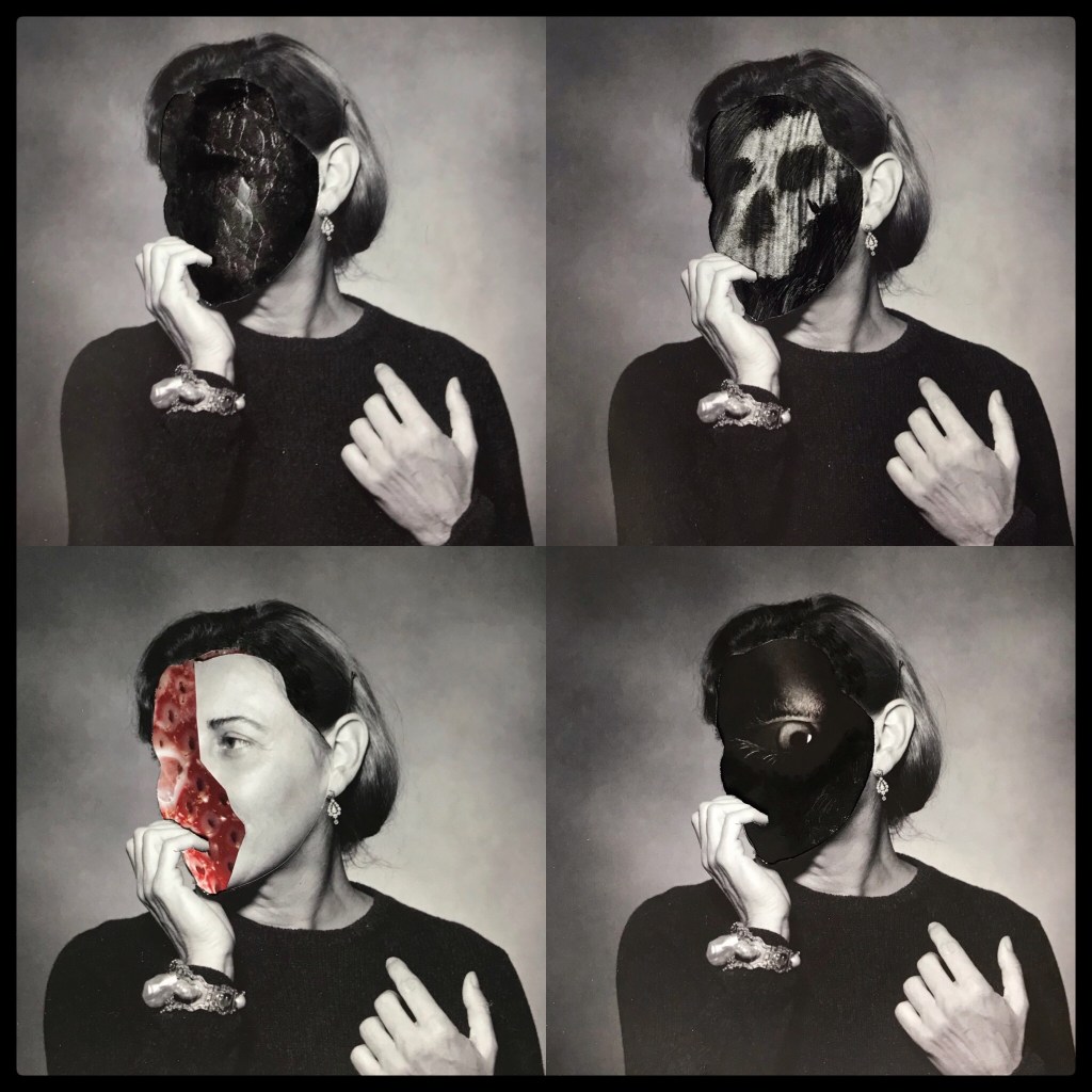 So, for this prompt I’ve used photo collage to shake up a conventional portrait image of a respectable looking woman and reveal layers of her psyche hidden beneath the surface. I think she may need professional help!”