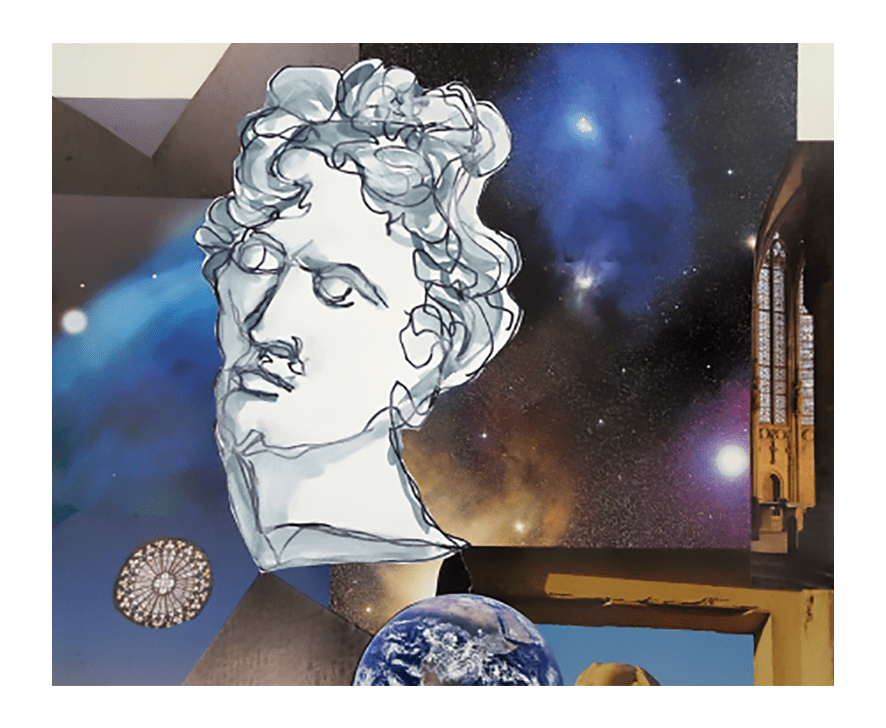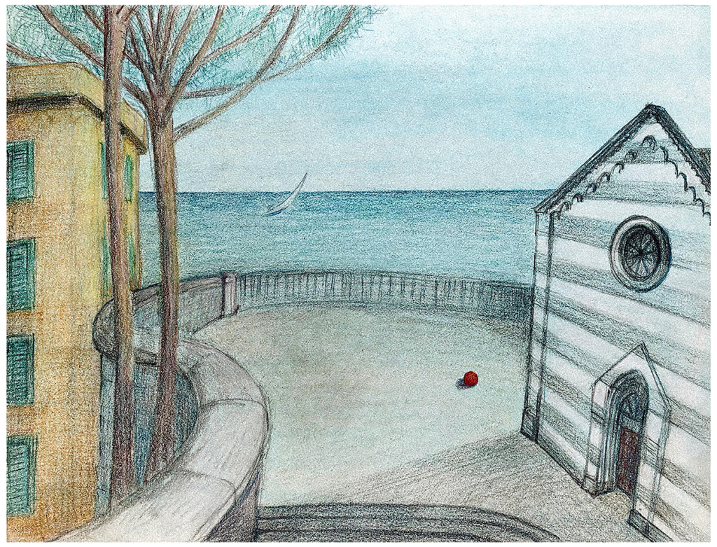 “Apparently, in this painting, De Chirico refers to his life and the fundamental things that keeps us alive. Based on Nietzsche’s “Thus Spoke Zarathustra” «Aren’t all the words made for the heavy? Do not all words lie to those who are mild? Sing, don’t speak anymore ». From this, de Chirico took the title of his painting: Il Canto d’amore. So, not the words. but the song of art is what makes us overcome melancholy and still love life. This painting is the song of love for life and beauty, so this is my version of the song of love to life. I grew up in Genova, a city with wonderful architecture, built on steep hills, full of steps and narrow roads. As children our daily walk was, at the end of a long tree-lined avenue, to the Rotonda over-looking the sea and the harbour. I tried with this to show a bit of the joy I felt every day running to the balustrade and breathing in the sea. I had no time to painting it, so it is a pencil sketch.” 41 x 31 cm