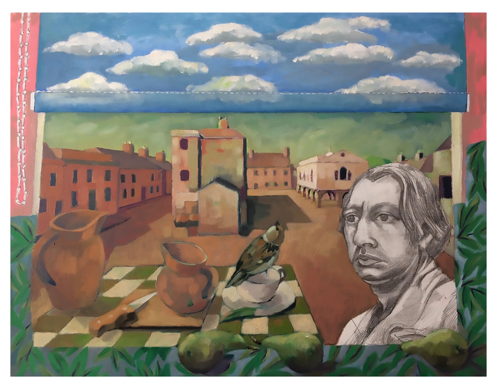 “After having a quick read up on some of the influences behind Chirico’s work, I felt like attempting a surrealist version of my lockdown environment! I was inspired by an article written for the ‘museum of modern art‘ on Giorgio de Chirico’s ‘The Song of Love’. The author described de Chirico’s marrying of ‘dissimilar objects’, and noted that some of the eerie shapes and anxiety-inducing forms in his paintings may have been de Chirico depicting his world utterly torn apart by the first world war. It’s very hard to ignore our own monumental world event with it still happening- so I explored the absurdity of life in lockdown in the style of Giorgio. The space depicted is the dining room in which I have spent the vast majority of my time. I developed a love/hate relationship with that particular corner. Firstly my computer became less of a fun thing. It was previously a place I could work and also unwind. But then the internet dissolved into a white noise of concern and anxiety. And it became my main bittersweet connection to much missed family members. I, like many, took a deeper interest in what few houseplants I have. (We don’t have a garden) So they lived on the windowsill next to me bathed in sun for a couple of hours every morning. My routine would see me coming in each day, armed with a cup of tea and putting the computer on – except for the rare occasions I had to go outside, then breathing obscured my vision in fog. (Glasses and masks don’t work together too well during winter). Lockdown turned the world on its head and I imagine there are millions of often overlooked objects out there, whose value has been totally altered as a result.”