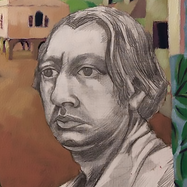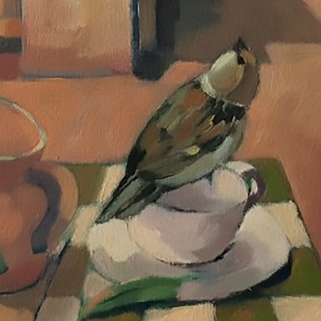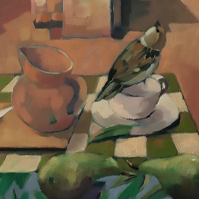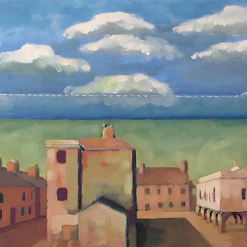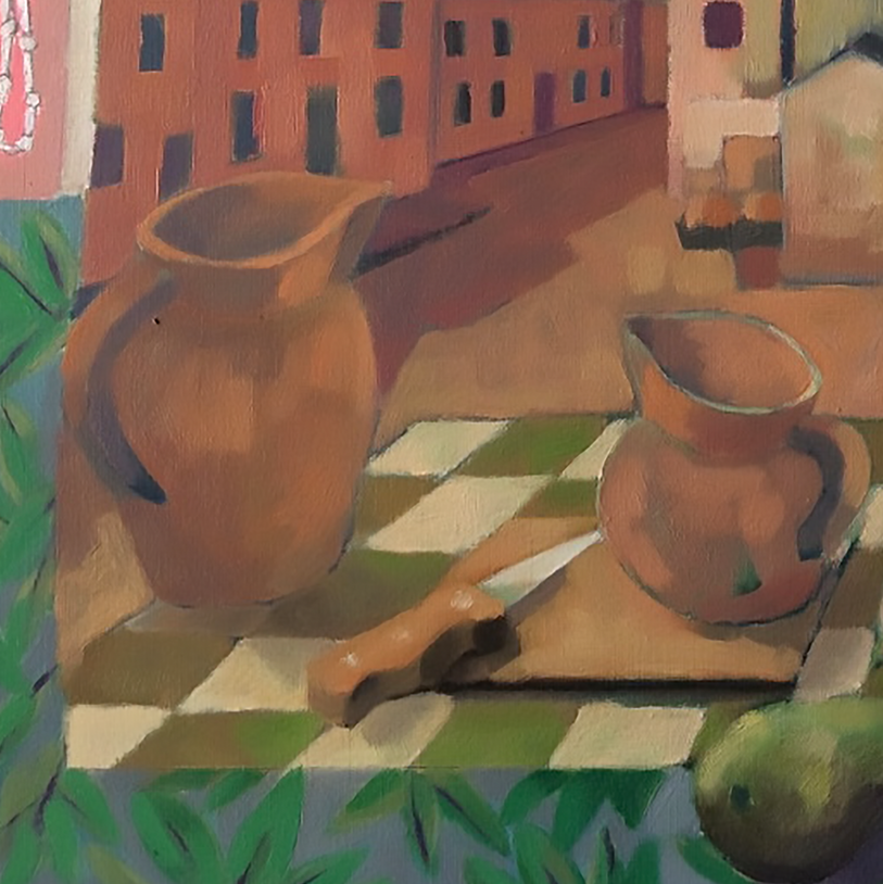 “Looking through a Sotheby’s 1977 catalogue, I discovered this Georgio De Chirico self-portrait from 1924, and liked it enough to do a sketch. It then seemed appropriate to introduce Georgio to Faversham, as under lock-down I did a few sketches which all of a sudden seem like a De Chirico painting. Outside the studio sparrows are active, and a homage to Morandi seemed appropriate being weekends now favour lunch in the garden.” Unfinished oil on prepared paper 50 x 65cm.